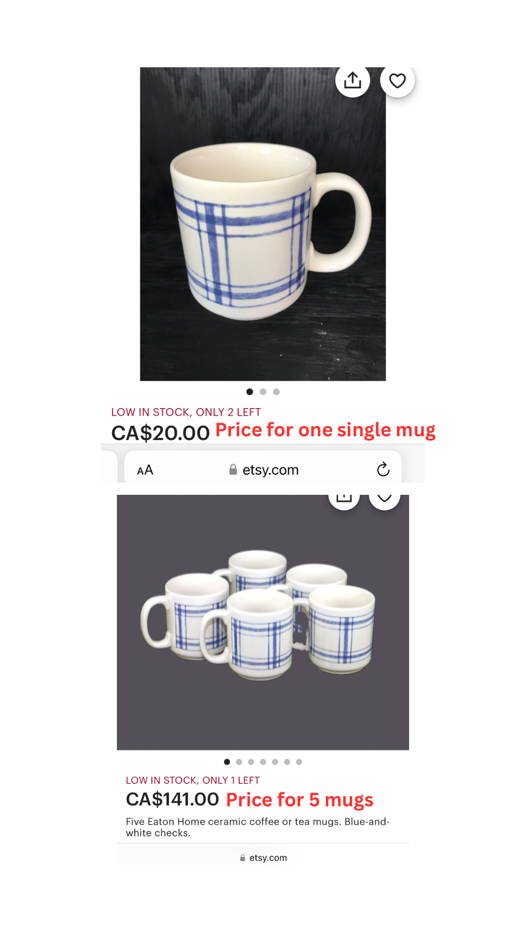 Eaton's is no longer in business and these mugs sell for higher prices online. Individual ones sell for $20 each and I found a set of five selling for $141 which works out to be $28.20 per mug. See the photo gallery for price comparisons.