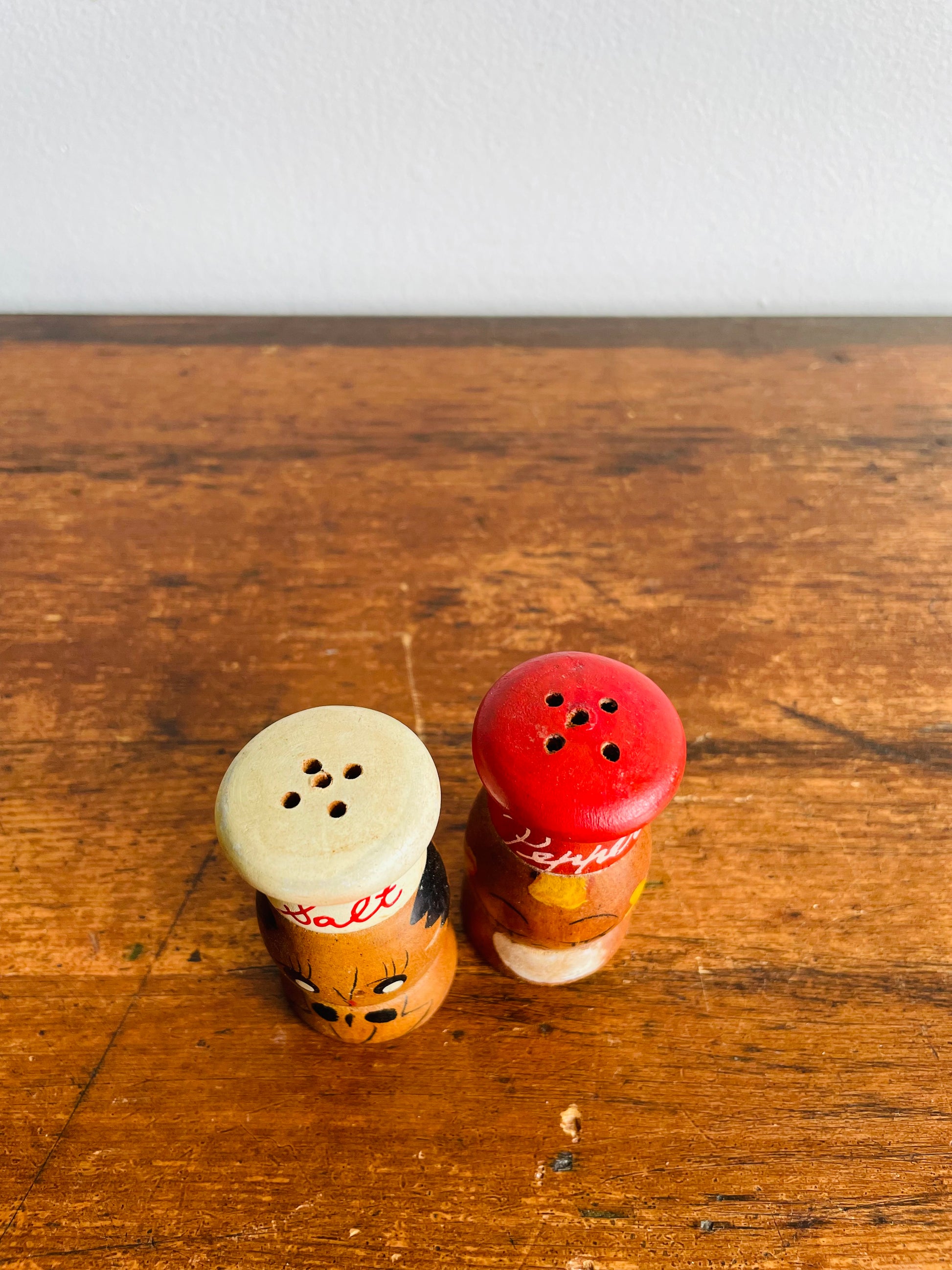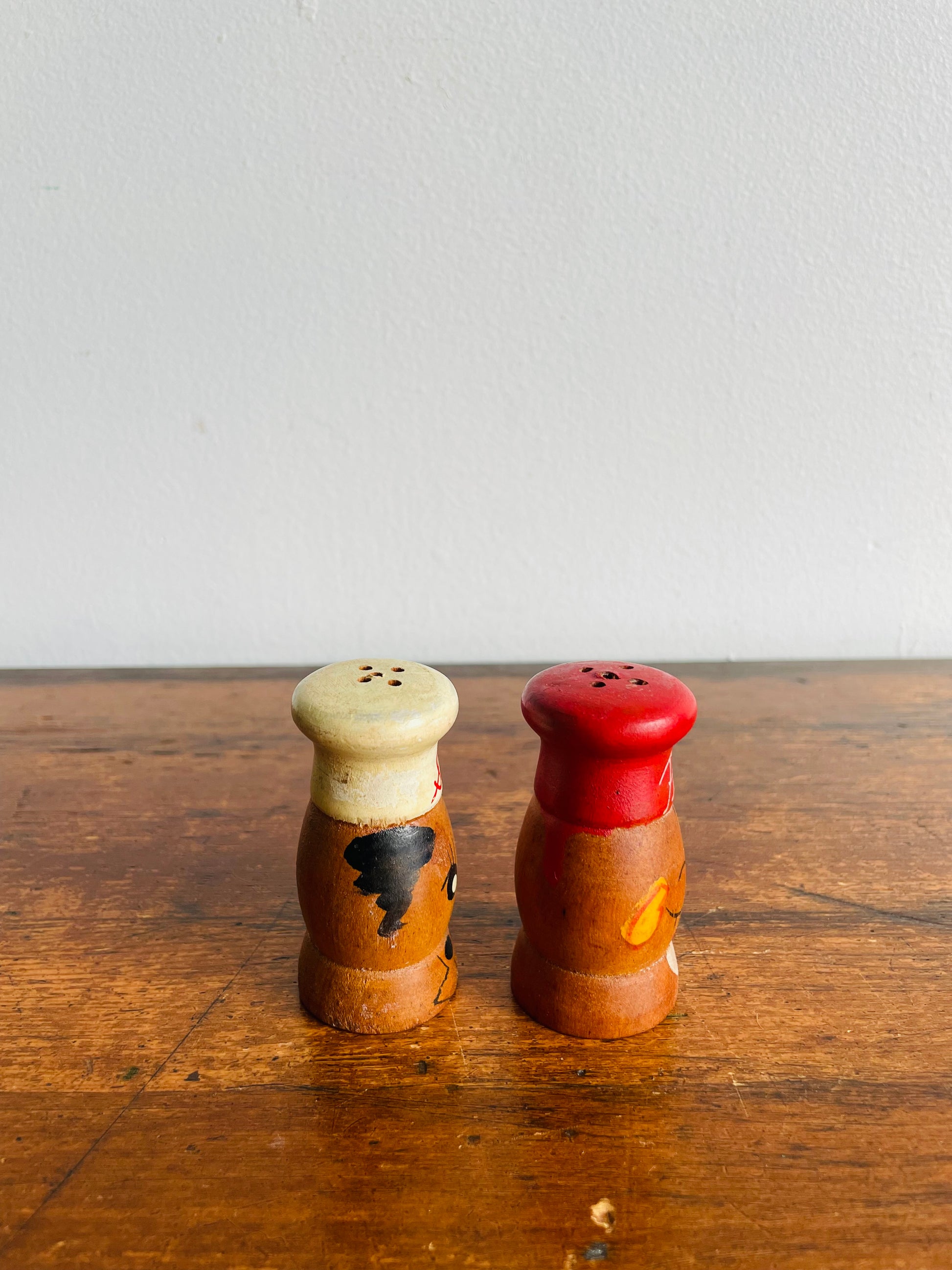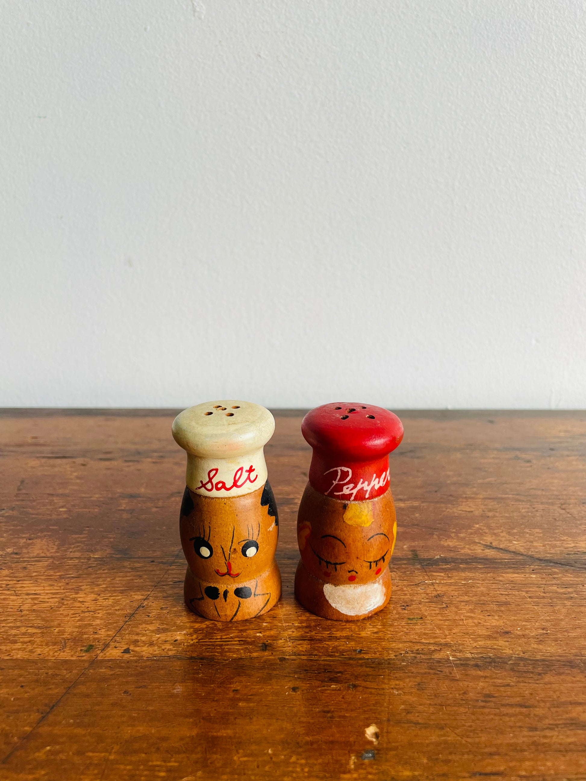 Adorable Wood Salt & Pepper Shakers with Hand Painted Faces