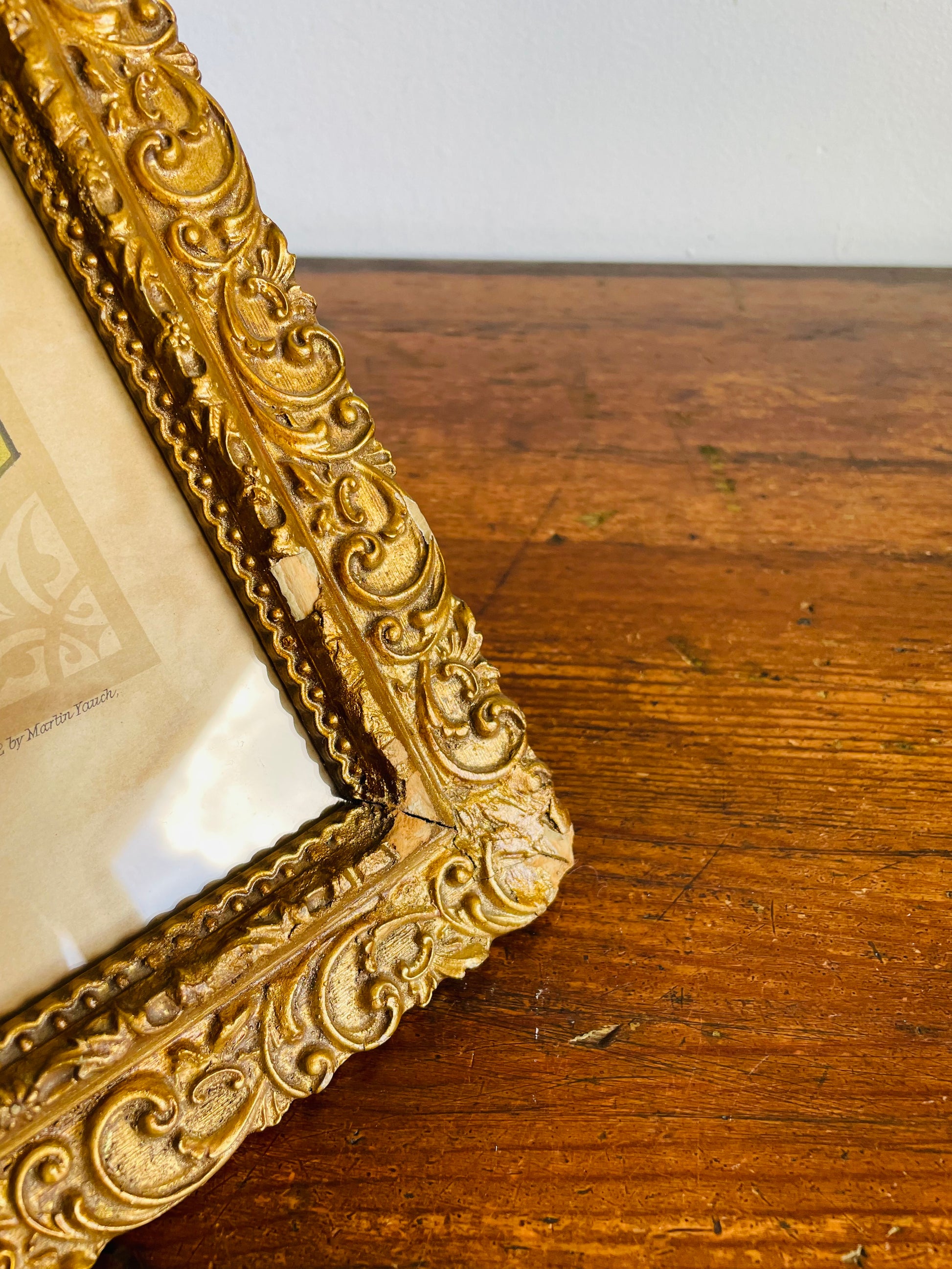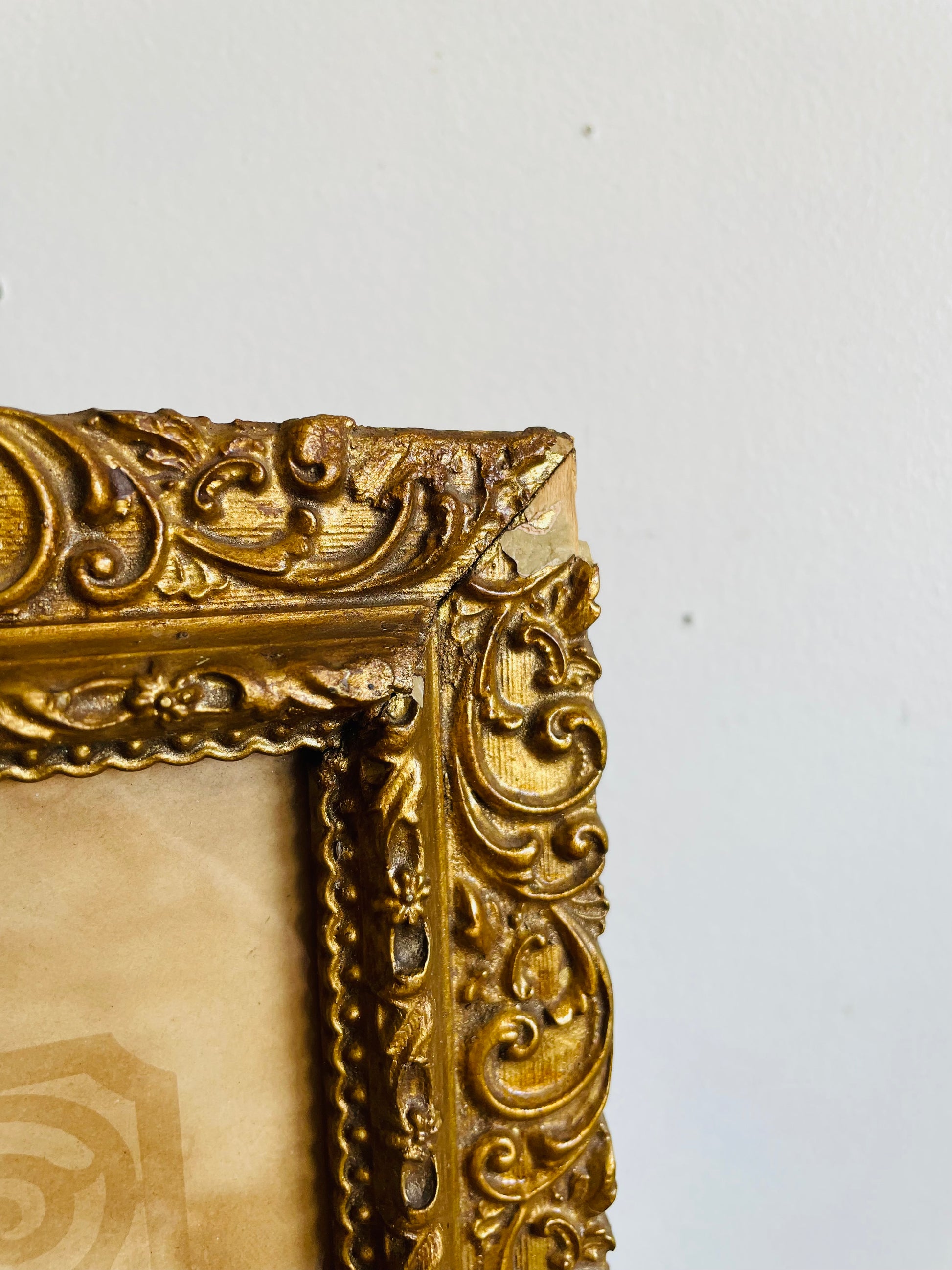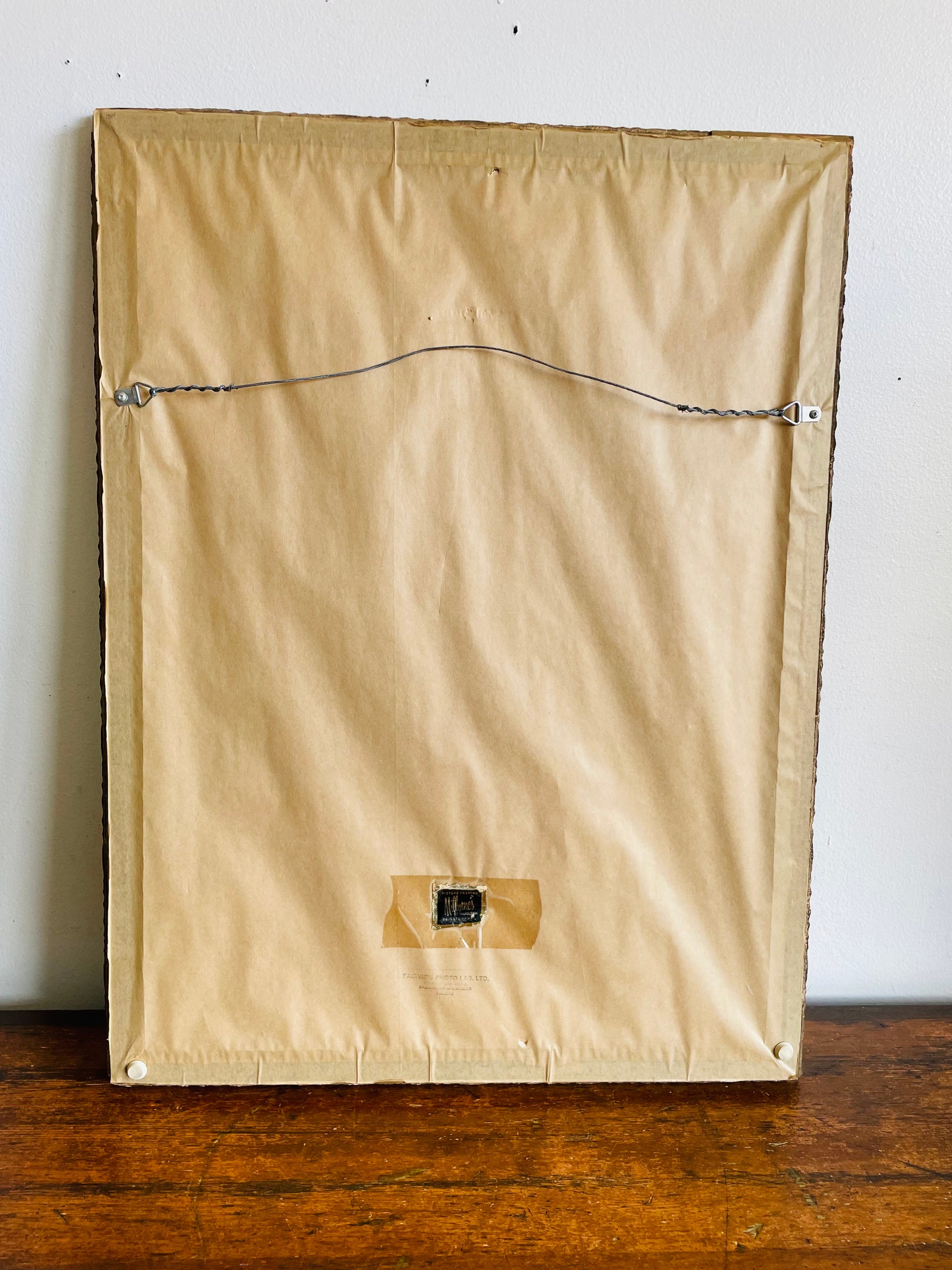 The gorgeous print sits behind glass in an ornate, gold, wood frame. There is a wire on the back for hanging and it looks like the paper backing and wire for hanging were added at a later time by a professional framing company (likely in 1973, when the picture was gifted to the church. They probably had the picture re-framed because they wanted to add the white card which you see in the bottom left corner). The frame and the picture inside are much older, and are antique from the 1800s.