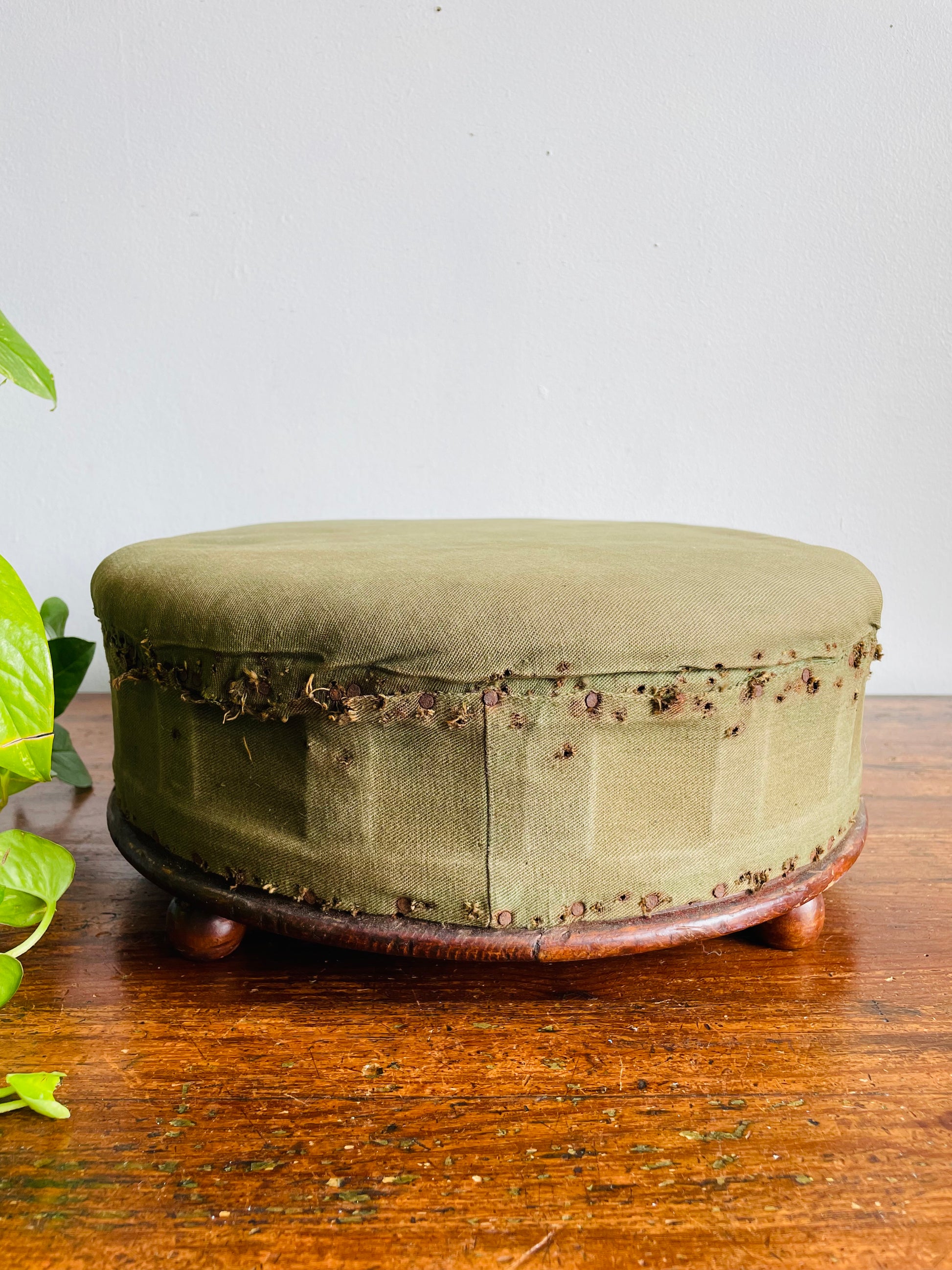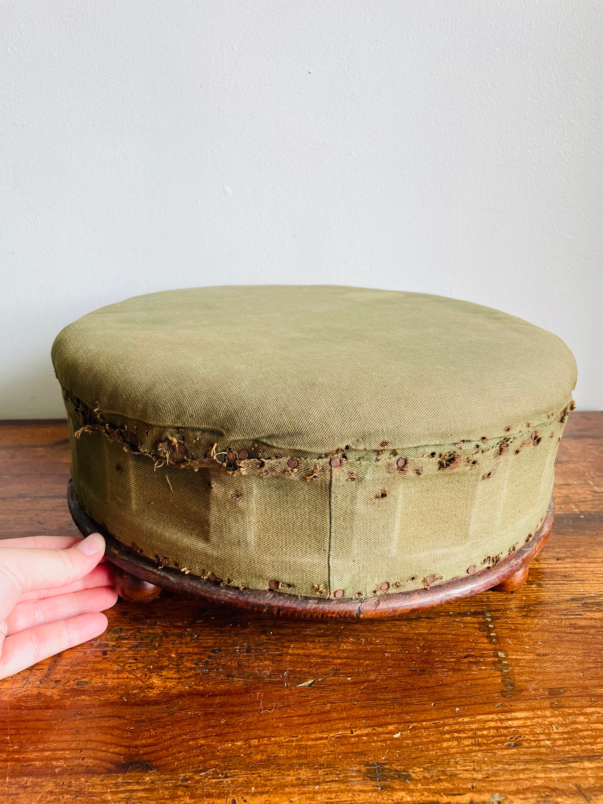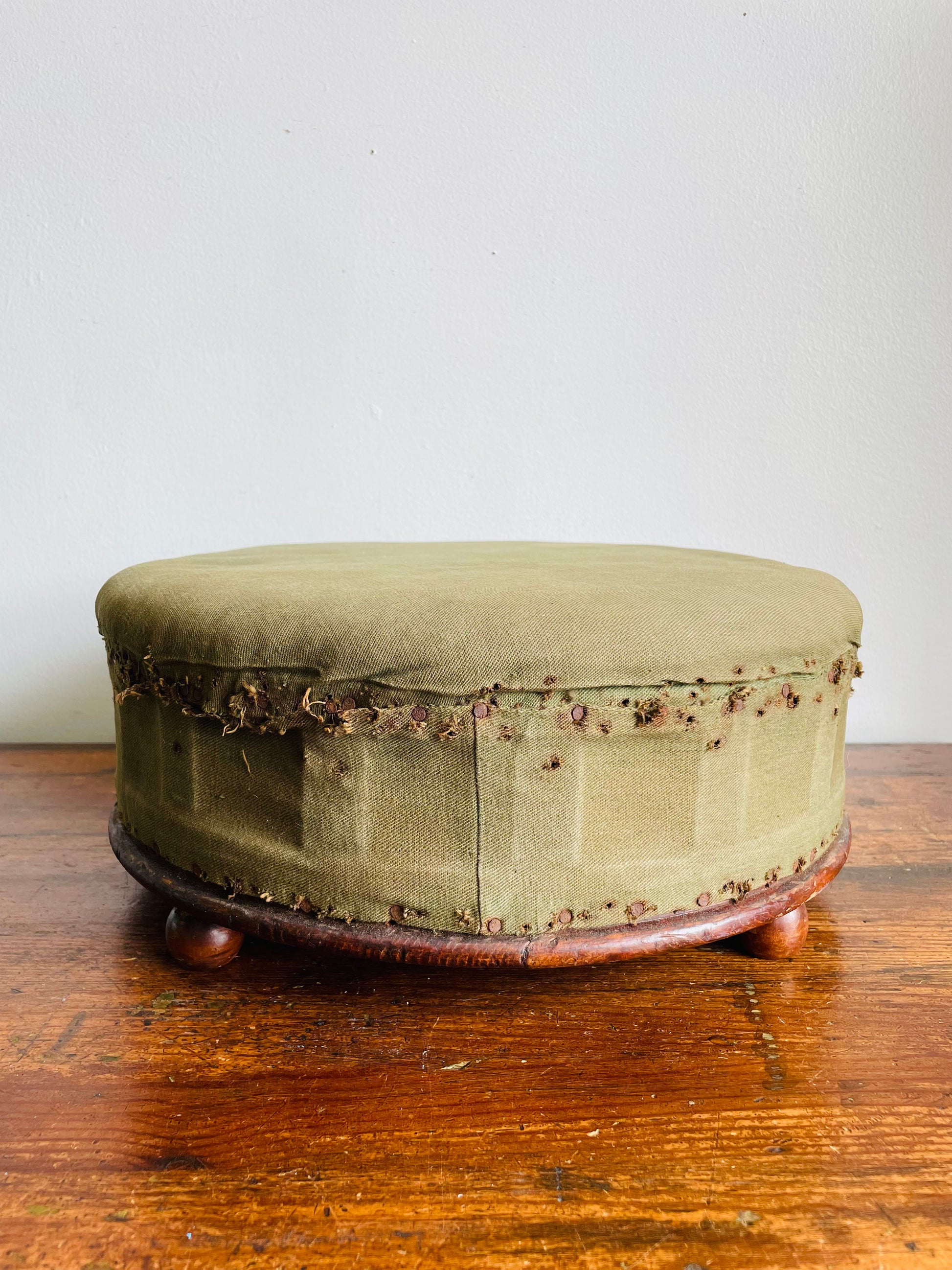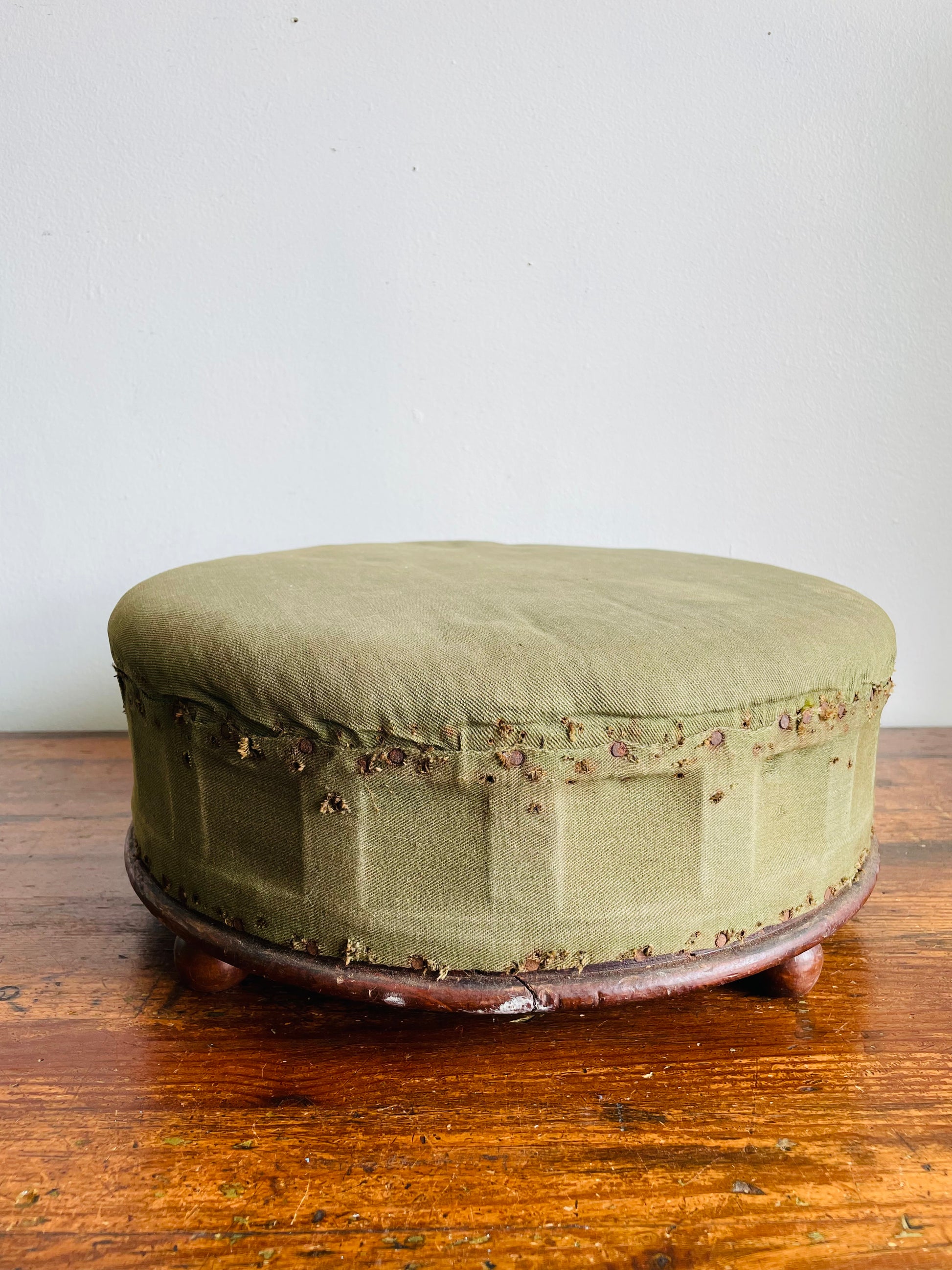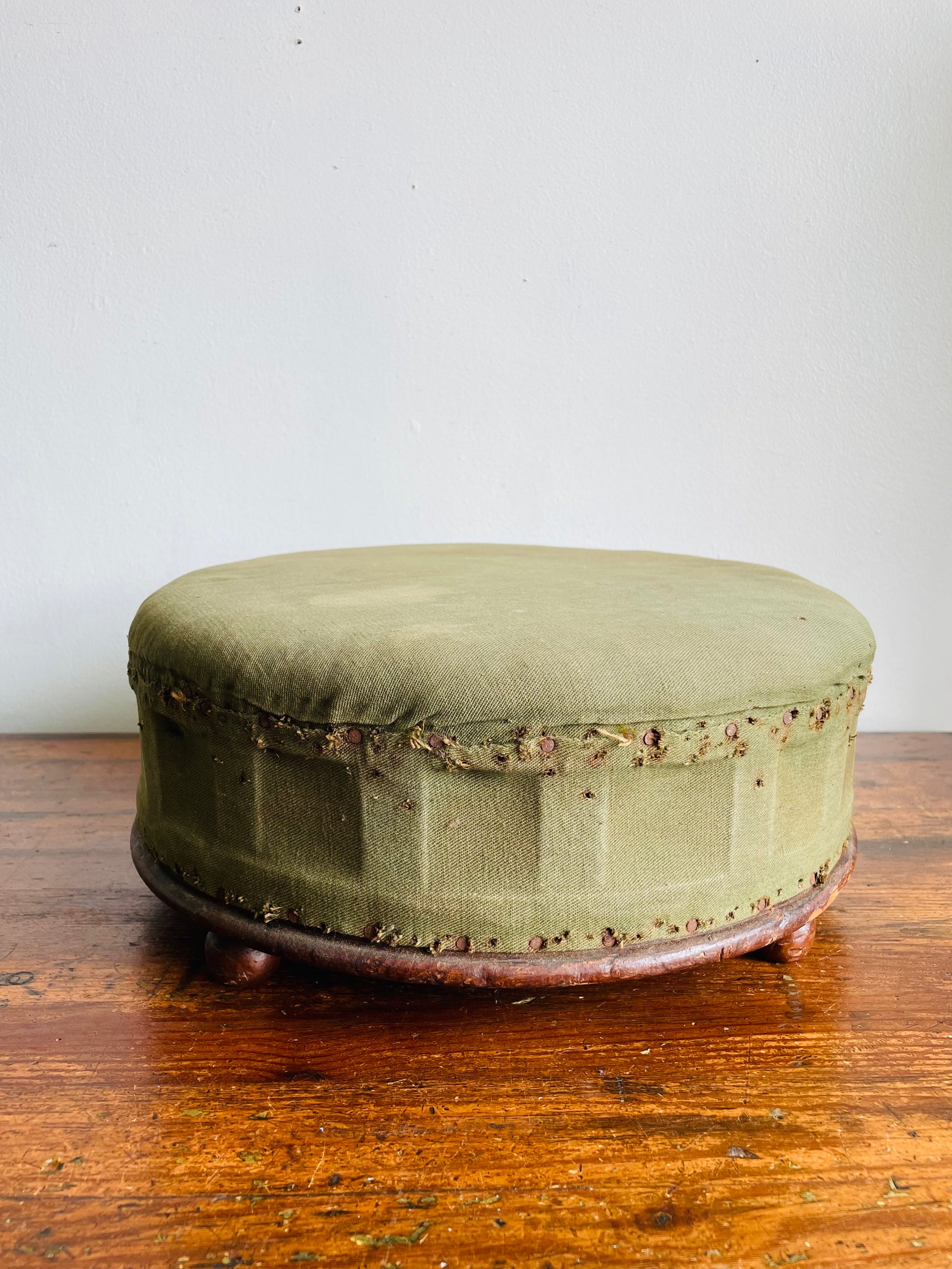 Antique Round Green Straw Stuffed Footstool with Solid Wood Base & Knob Feet