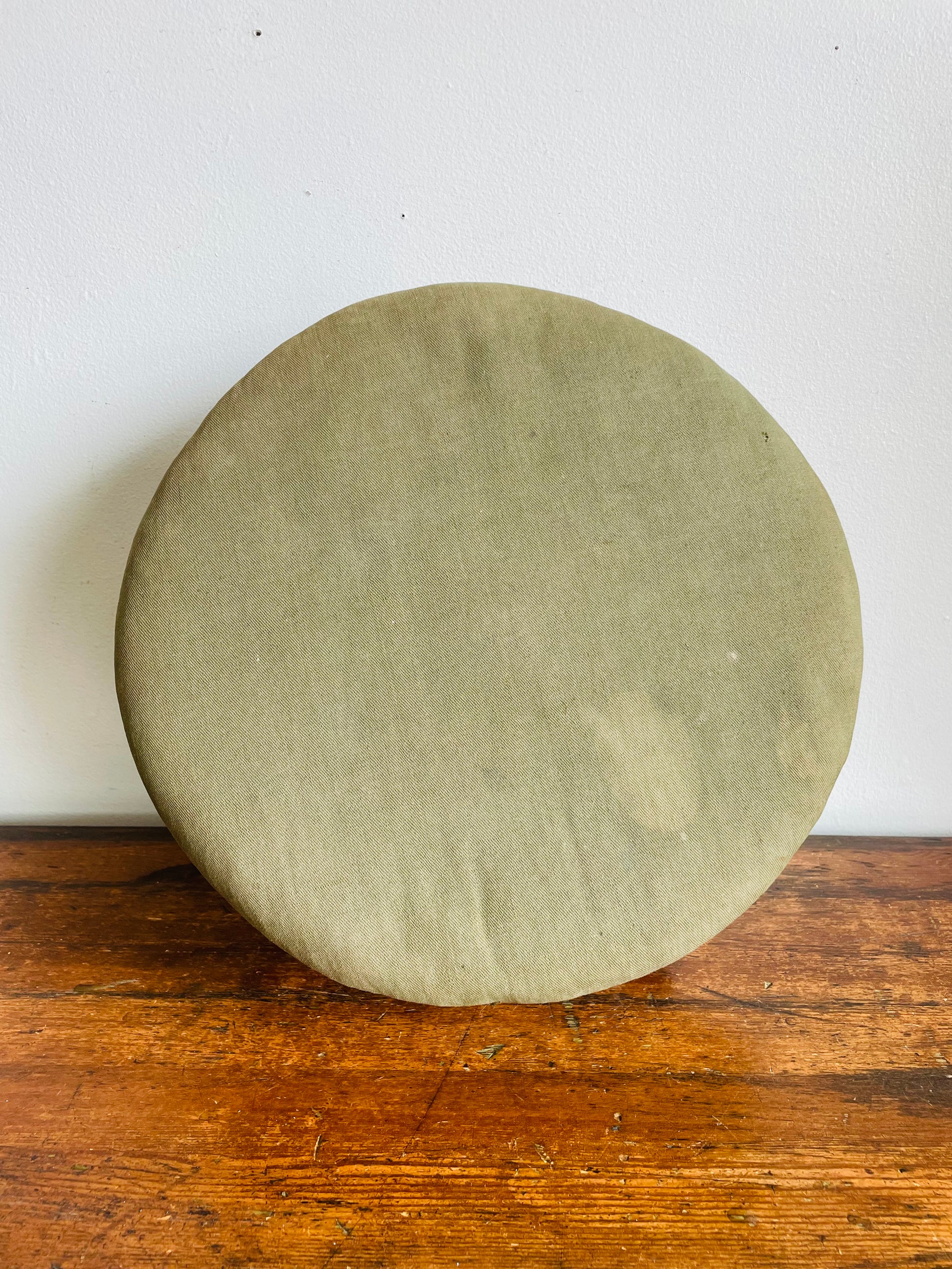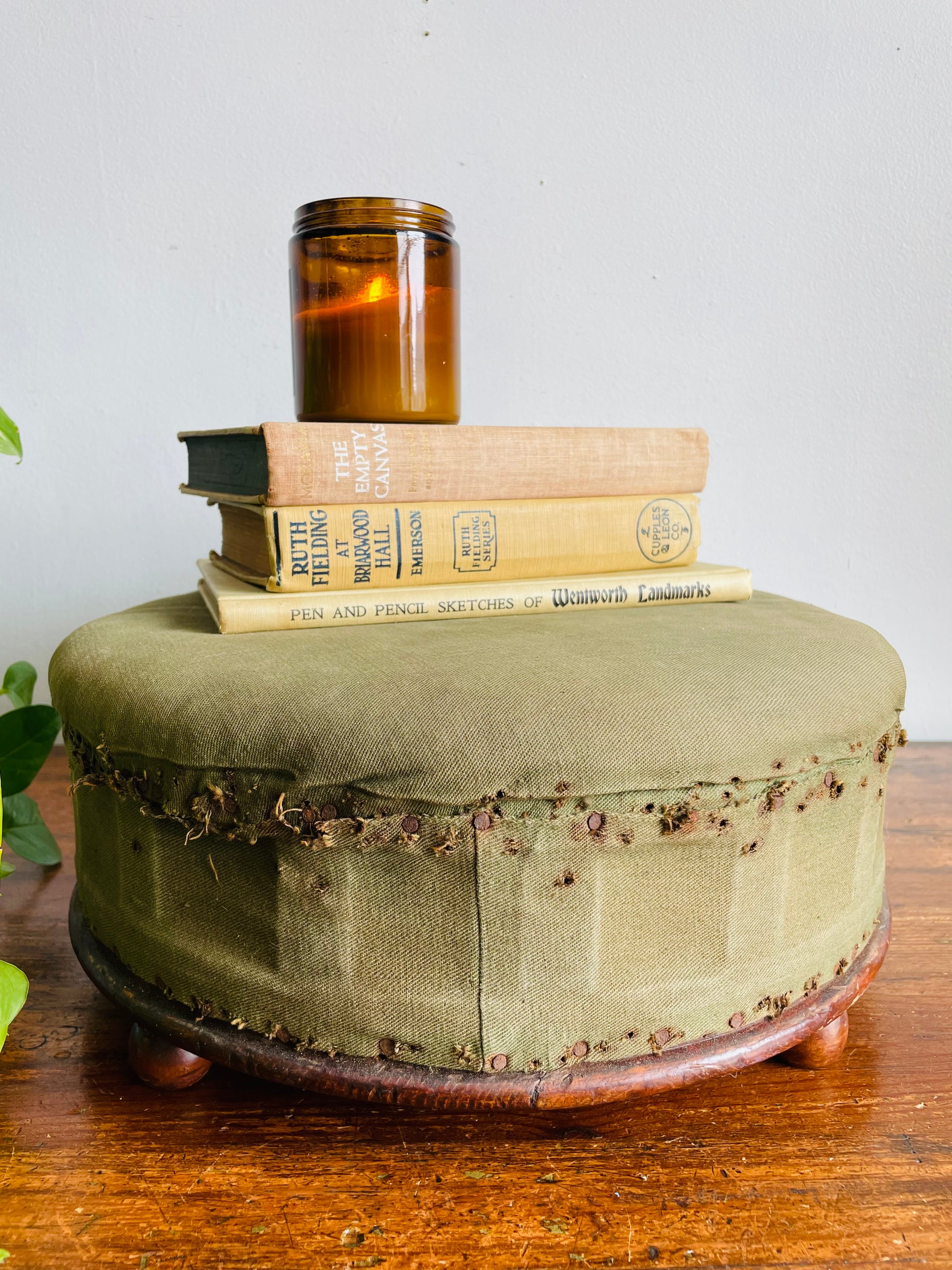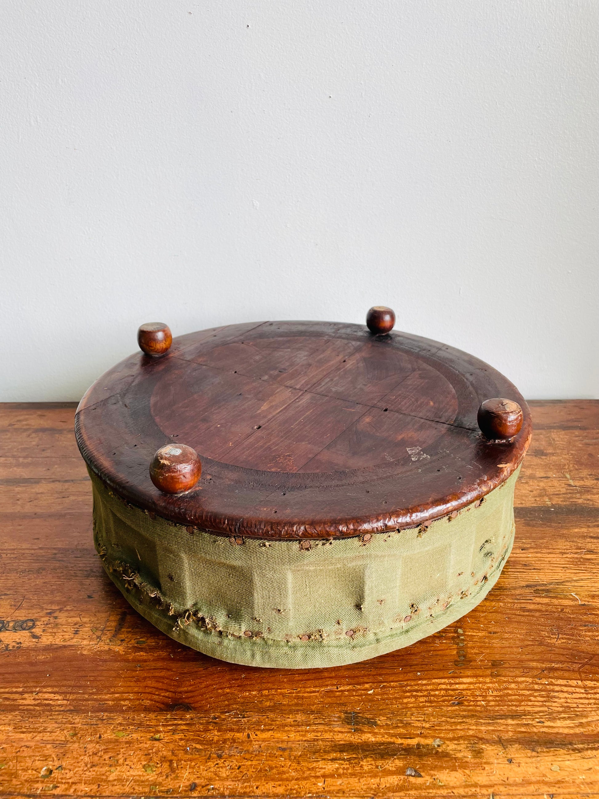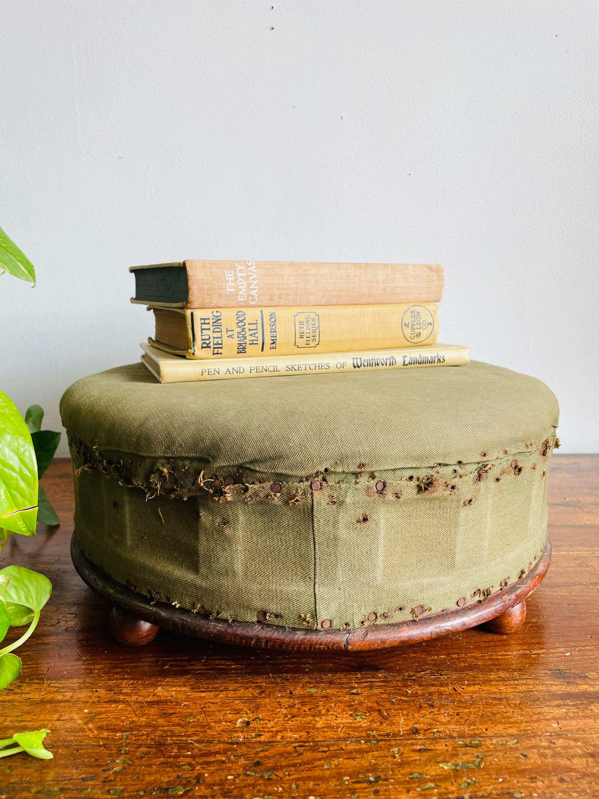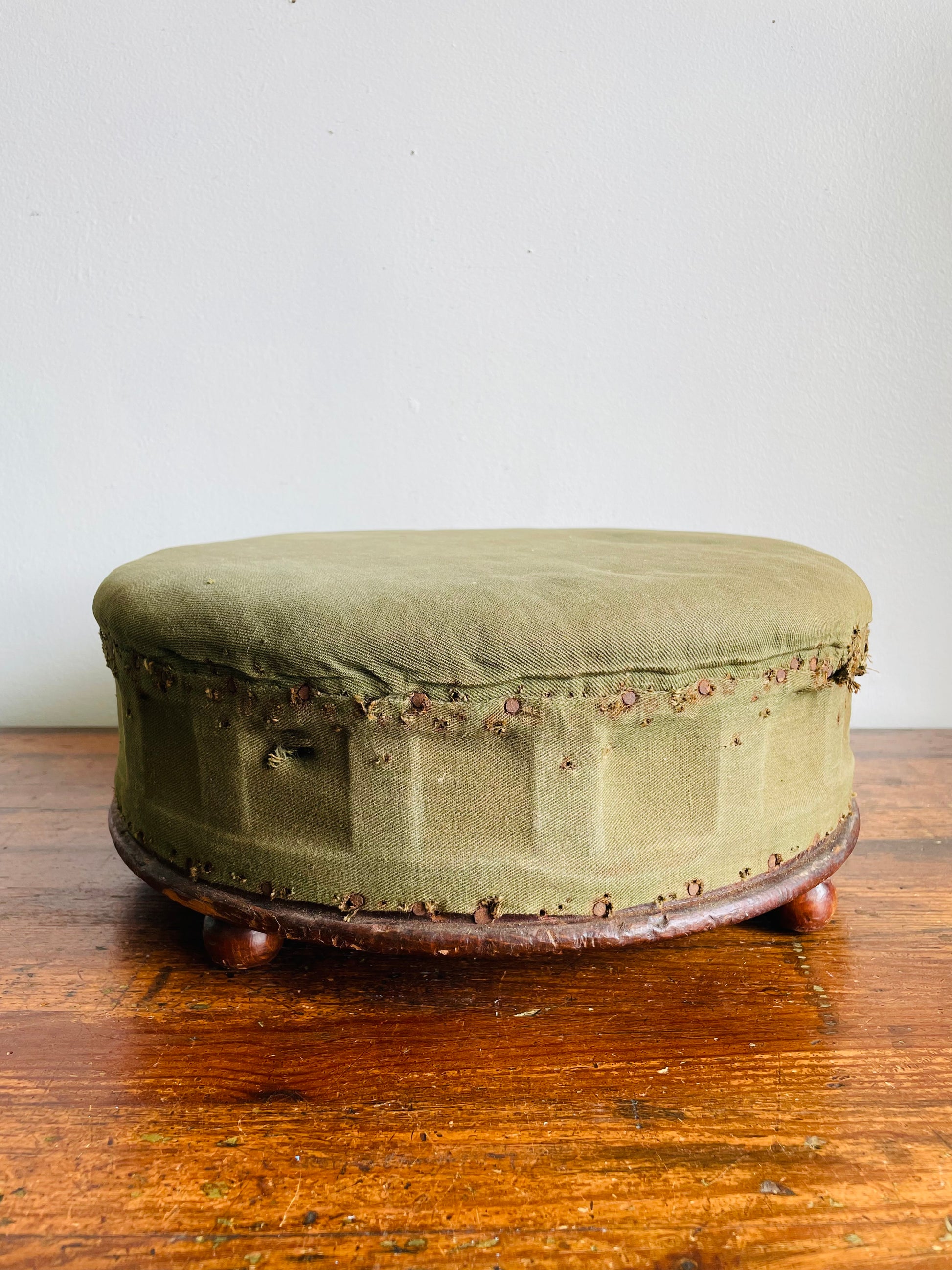 Antique Round Green Straw Stuffed Footstool with Solid Wood Base & Knob Feet