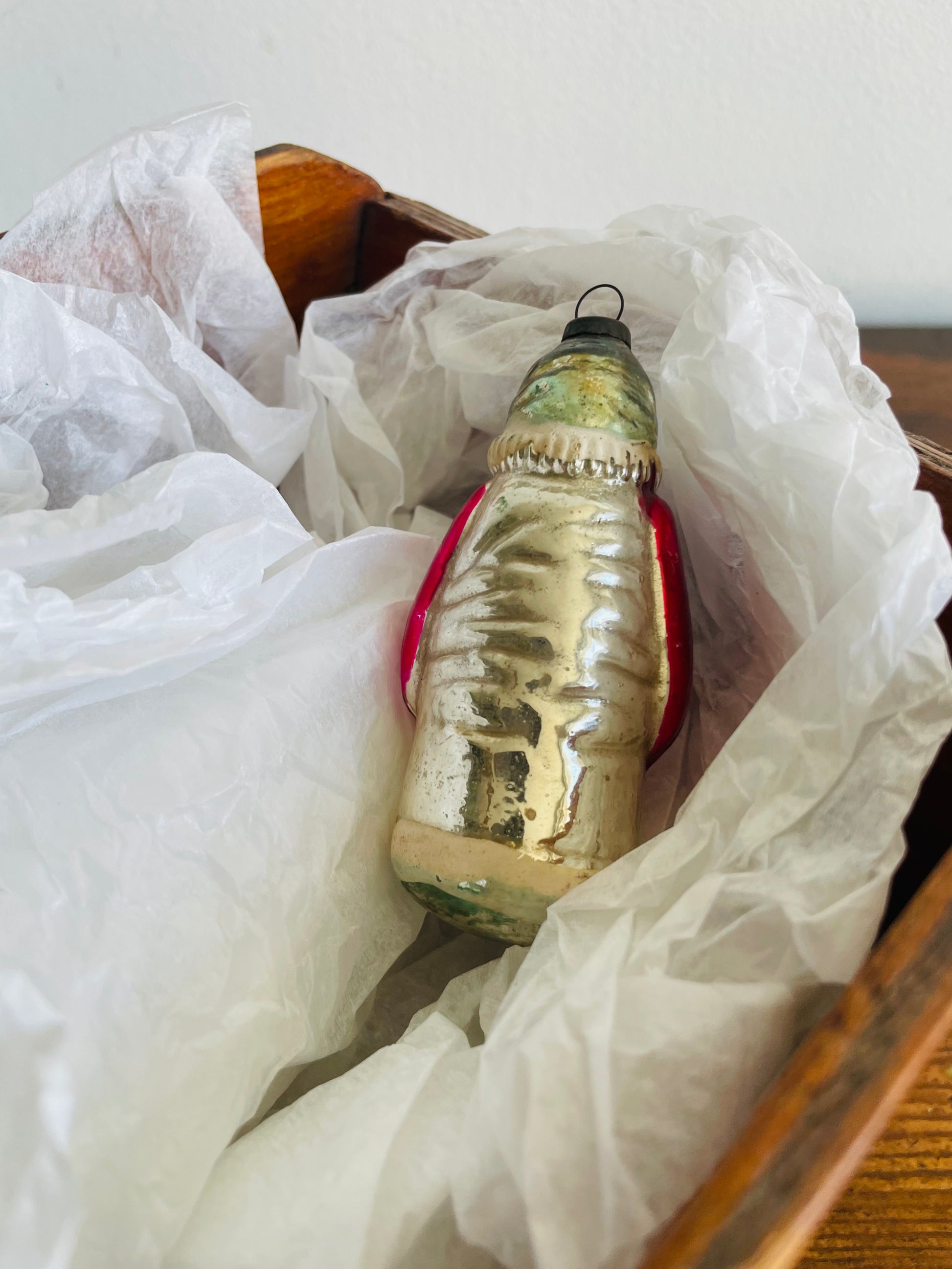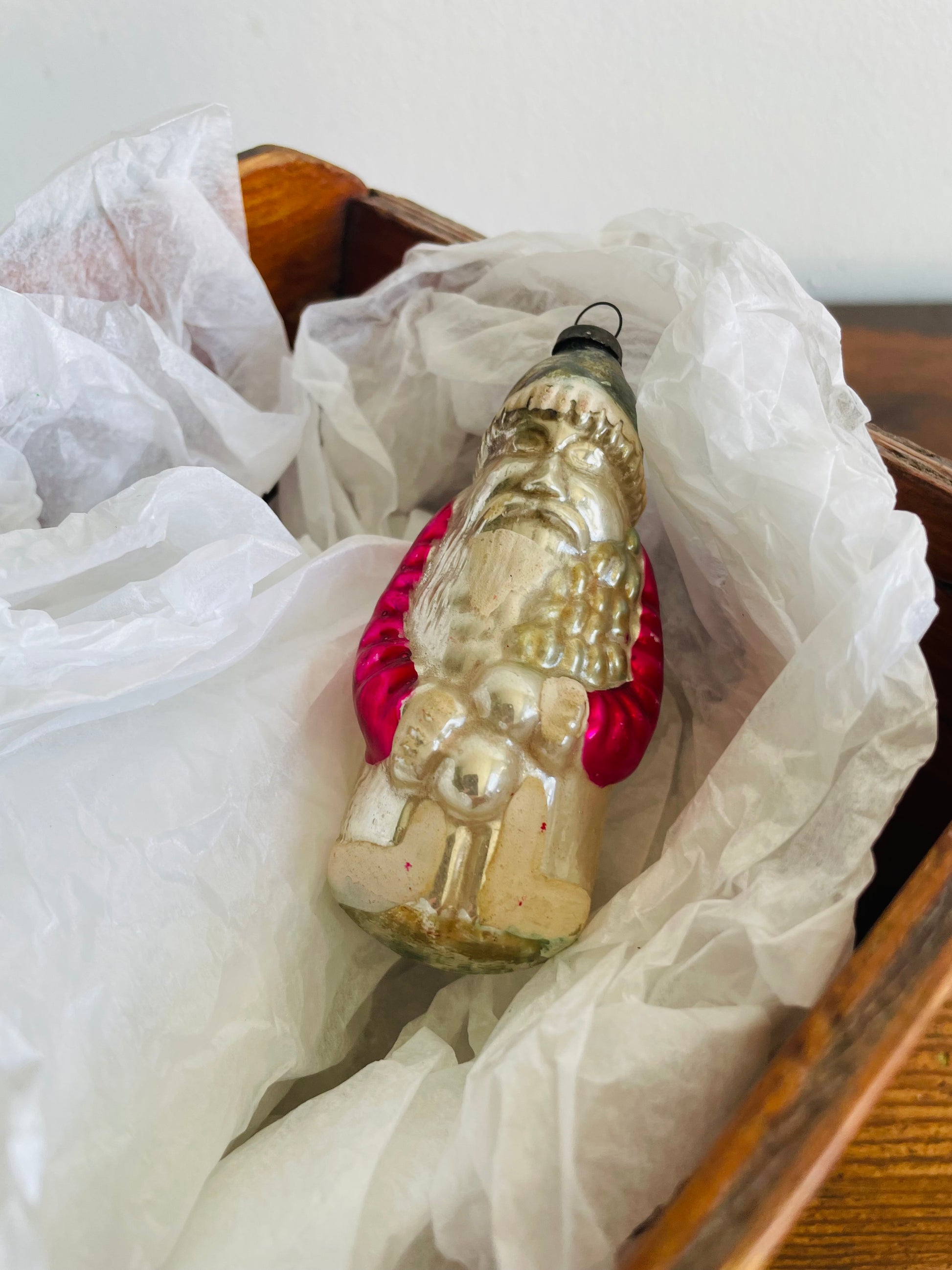 An absolutely beautiful glass Santa ornament with a wonderful, aged patina.