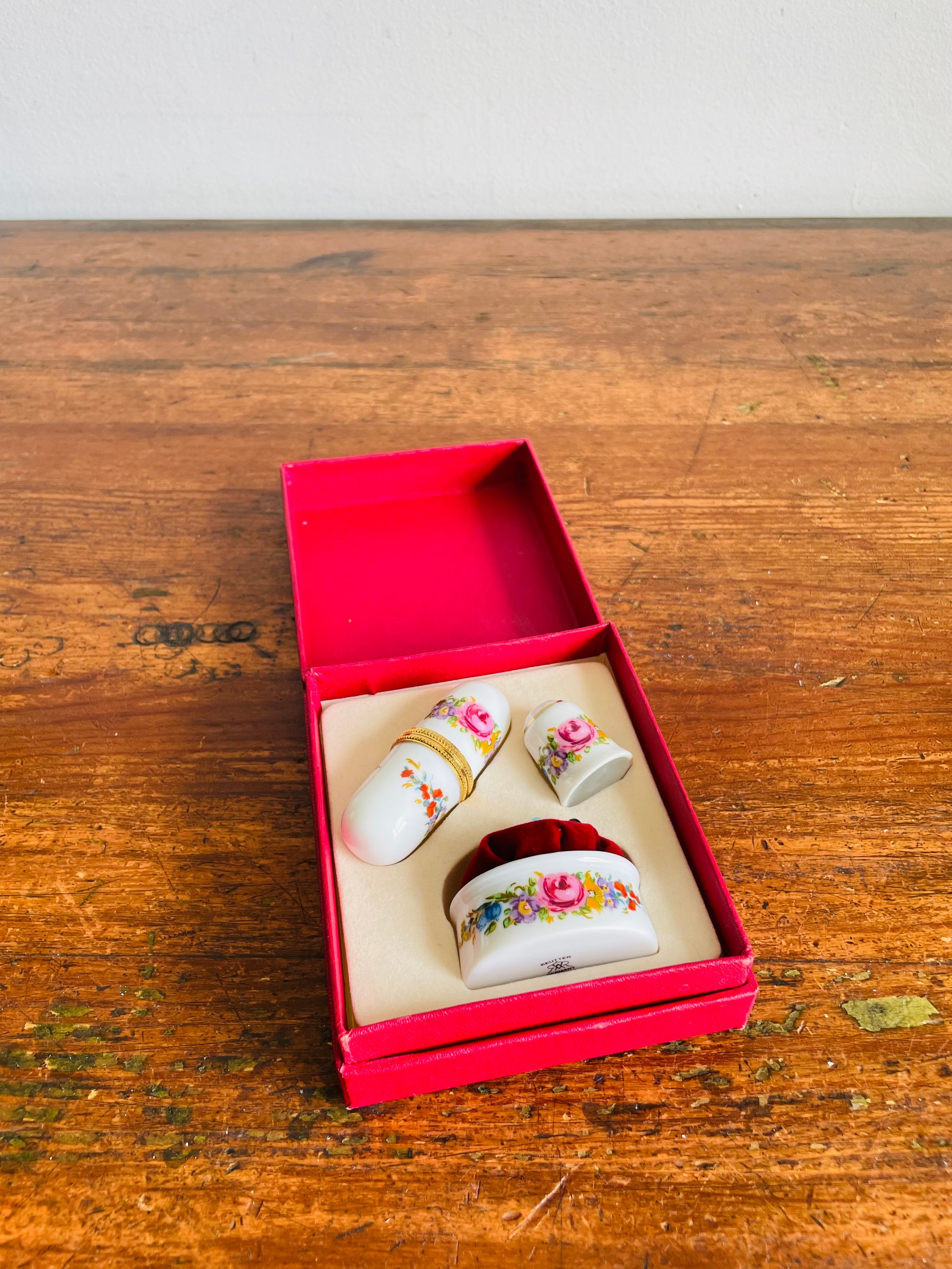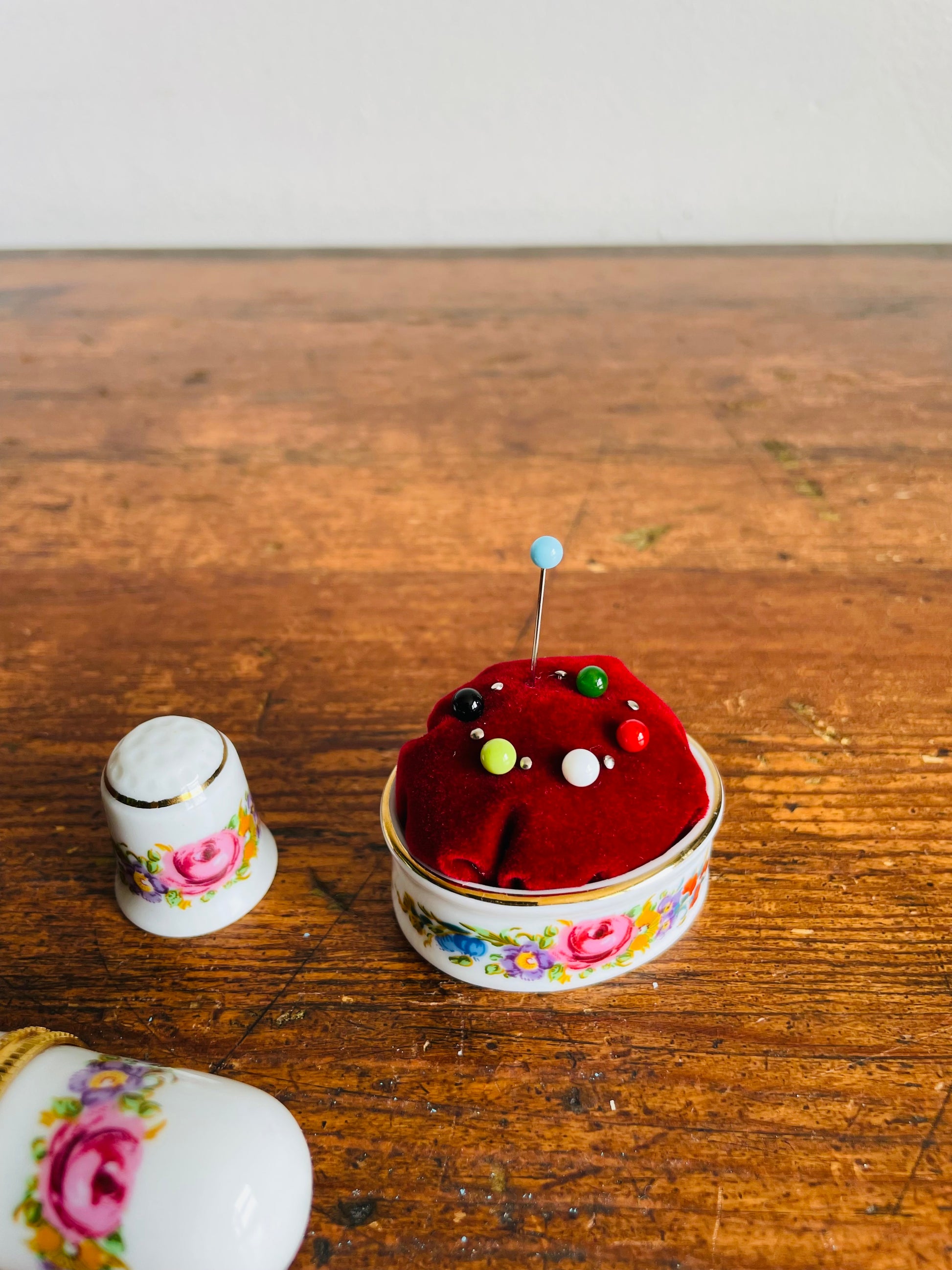 Brand New Vintage Porcelain Sewing Notions Gift Set in Original Box - Reutter Porzellan Germany - Includes Thimble, Pincushion & Needle Holder
