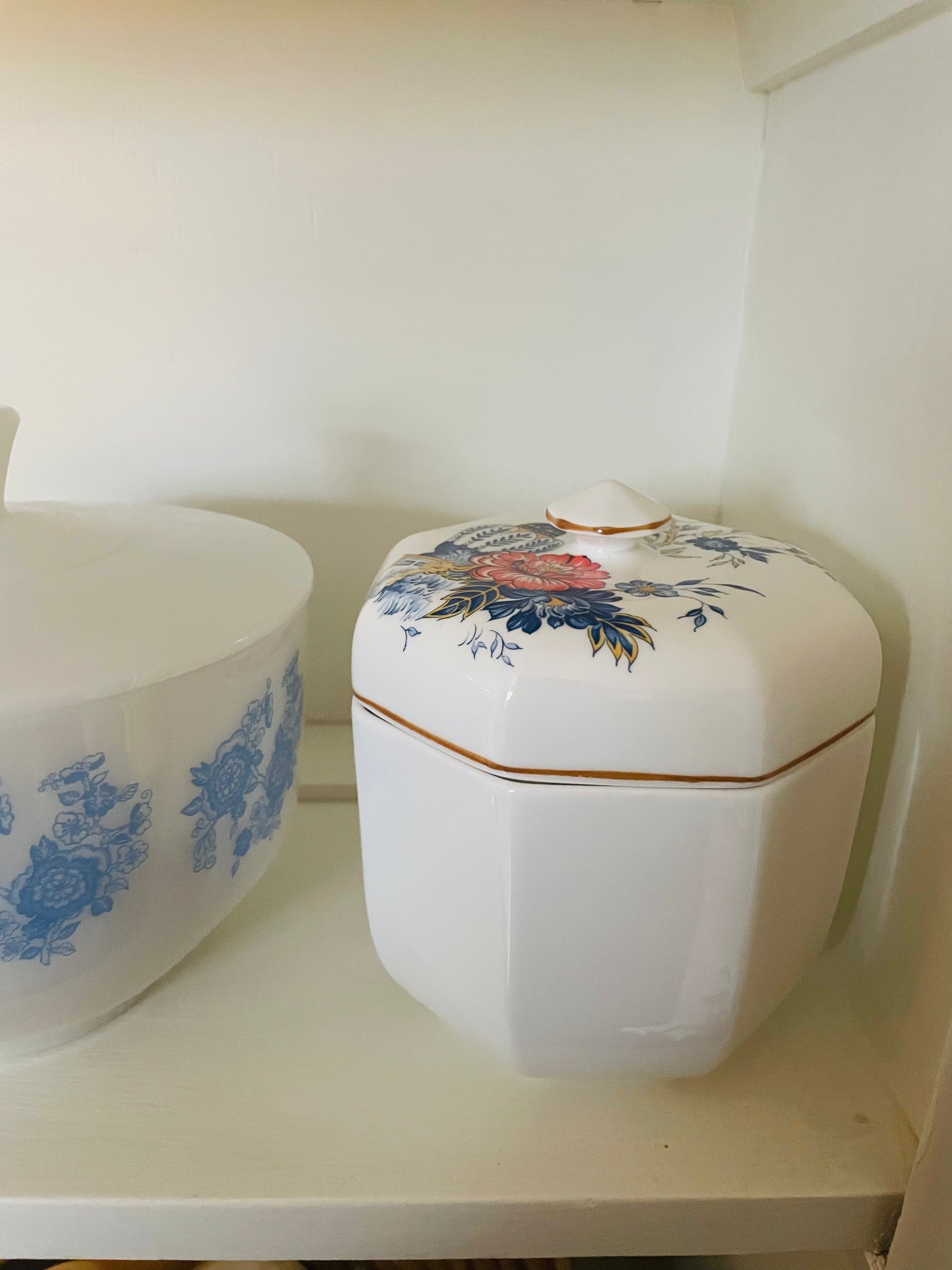 There aren't any markings on the jar that I can see but when I researched this pattern online, it says it's Crown Staffordshire Penang fine bone china. There is a faint mark of something on the bottom of the jar so it probably was labelled at one point, but it has worn away with time. These pieces sell for higher prices online but because I can't see the label properly, I have priced it lower accordingly.