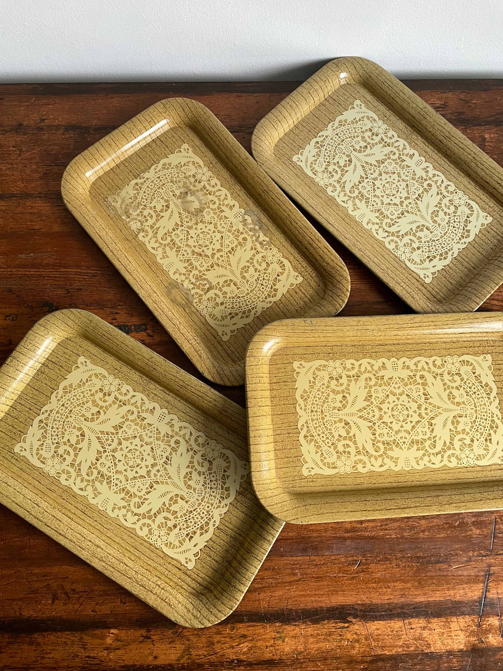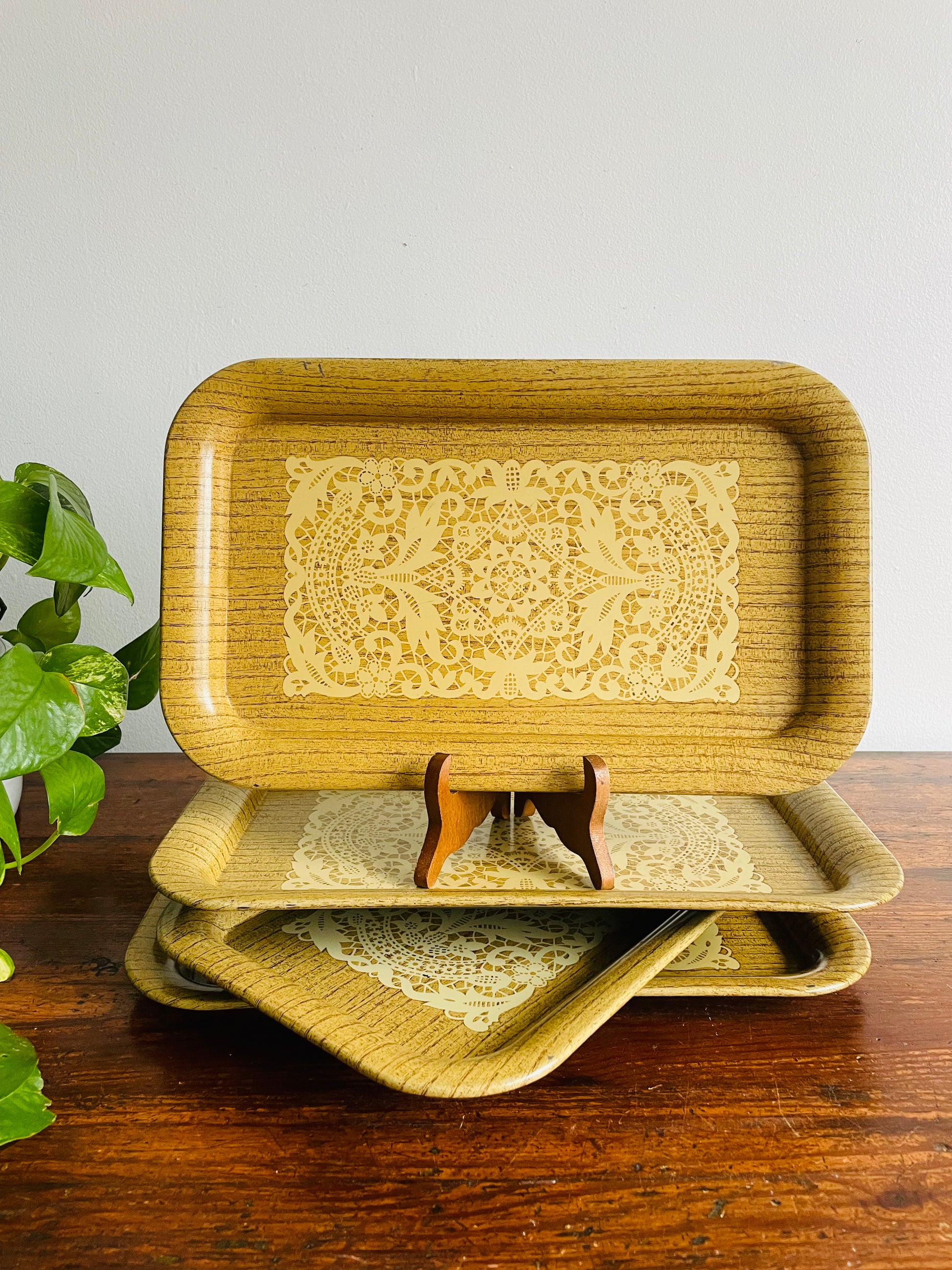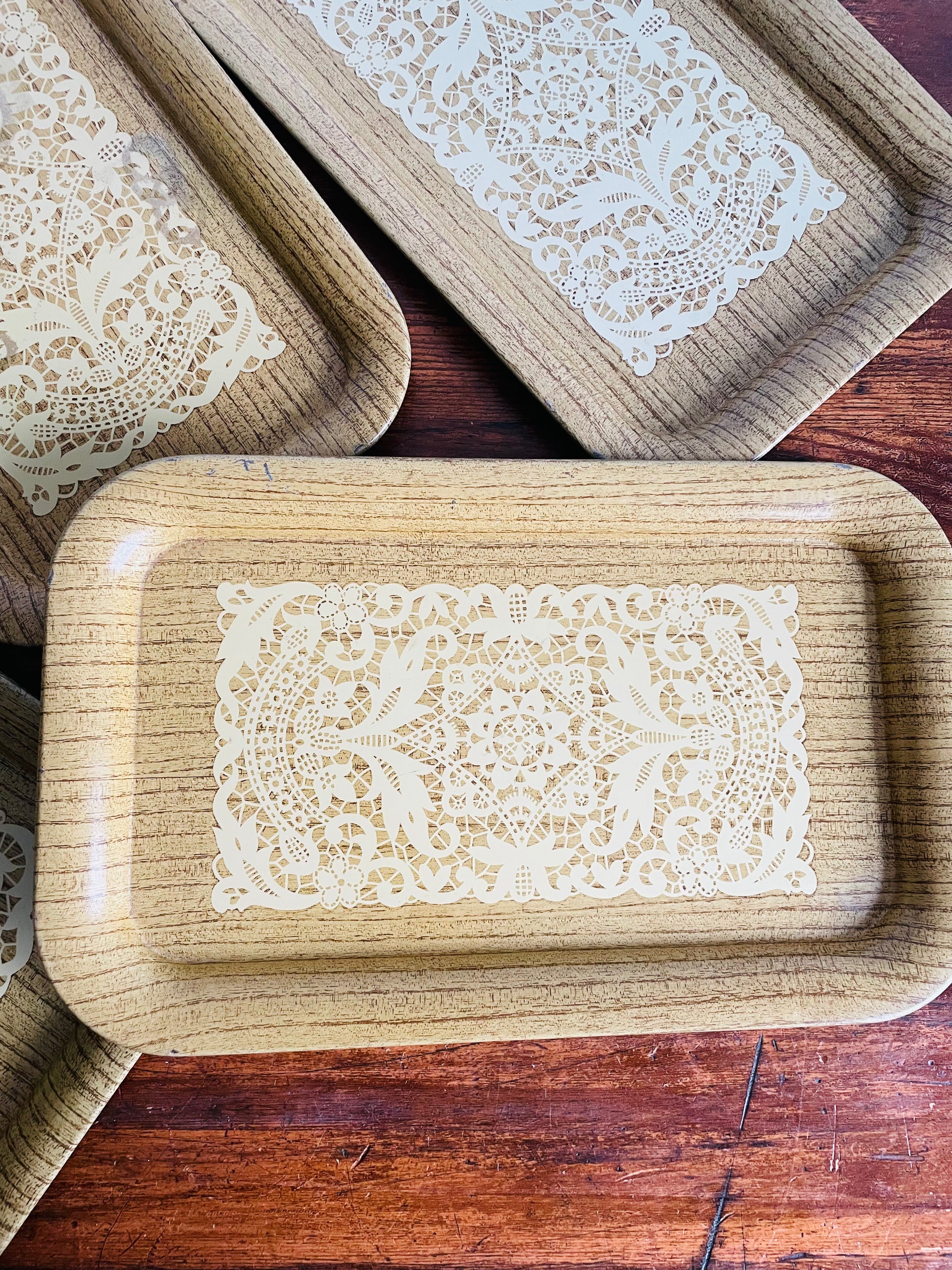 Faux Wood & Doily Design Tin Metal Individual Serving Trays - Set of 4