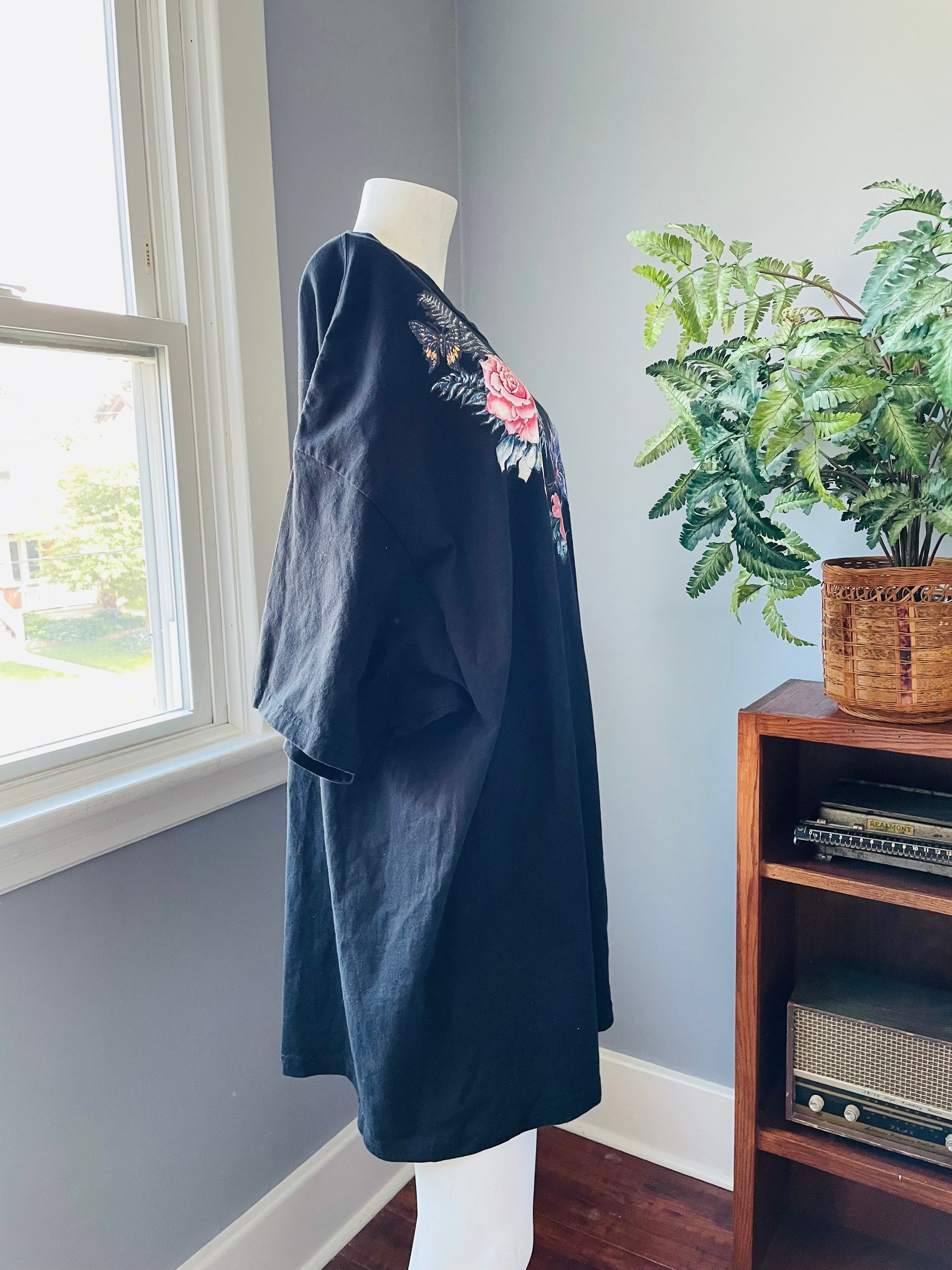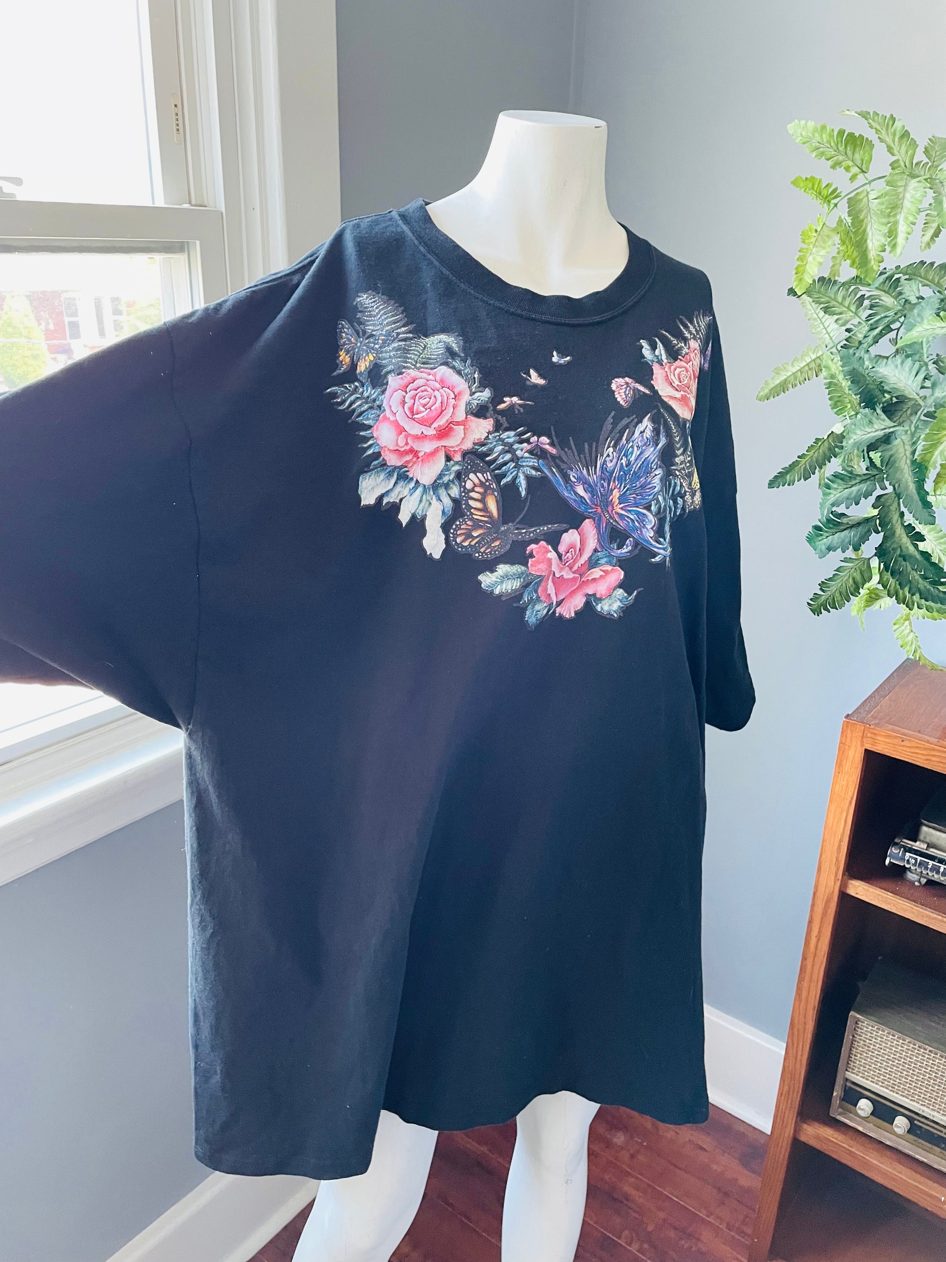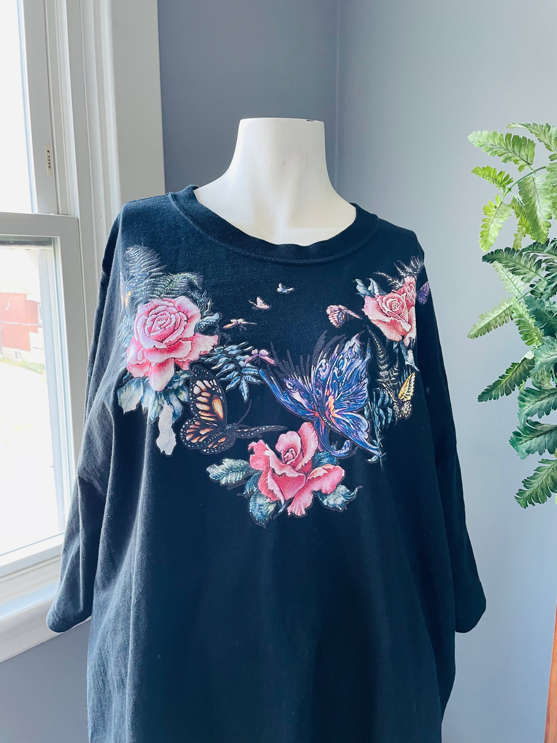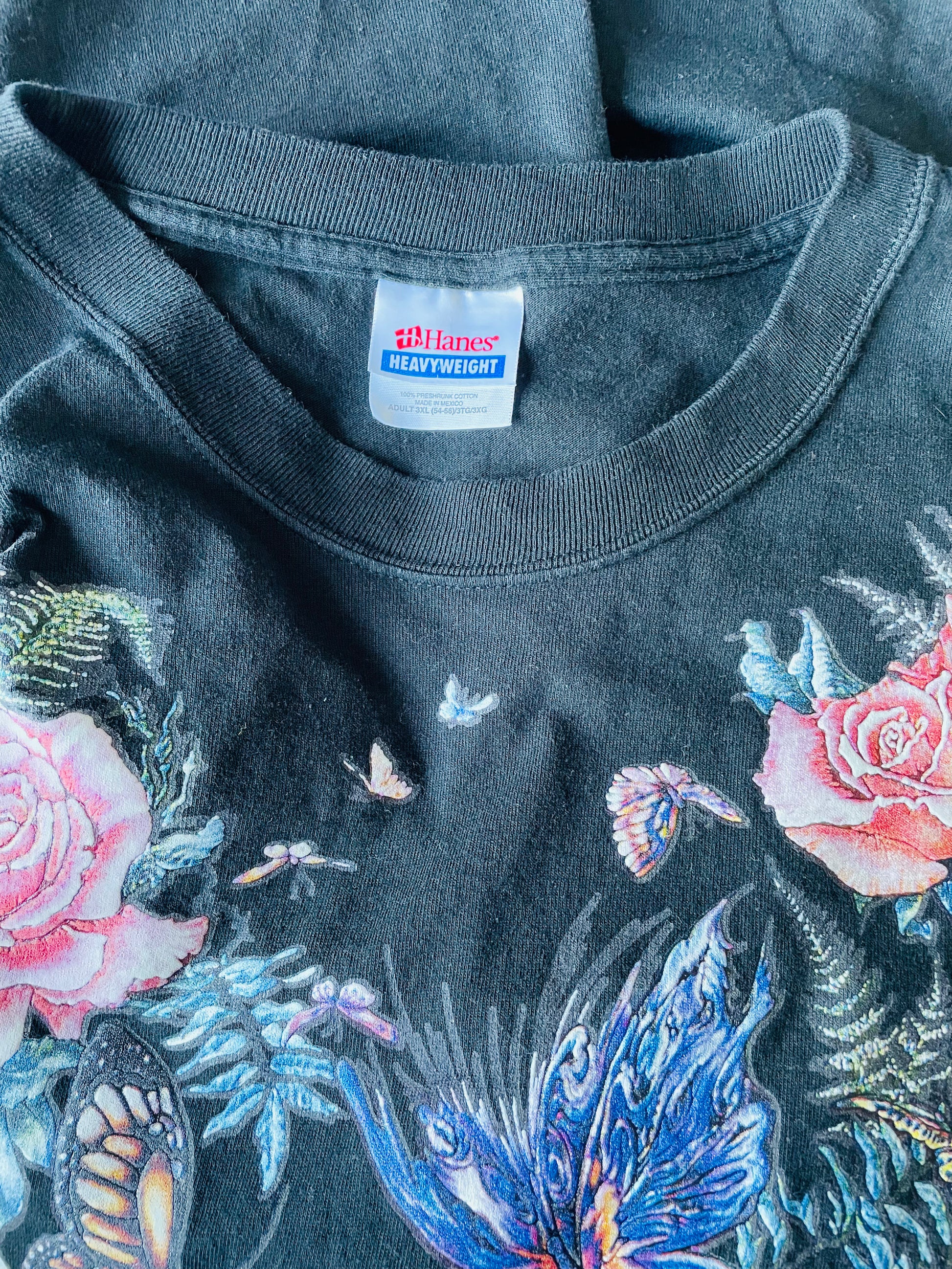 Hanes Heavyweight Plus Size Black T-Shirt with Flower Garden & Butterfly Graphic