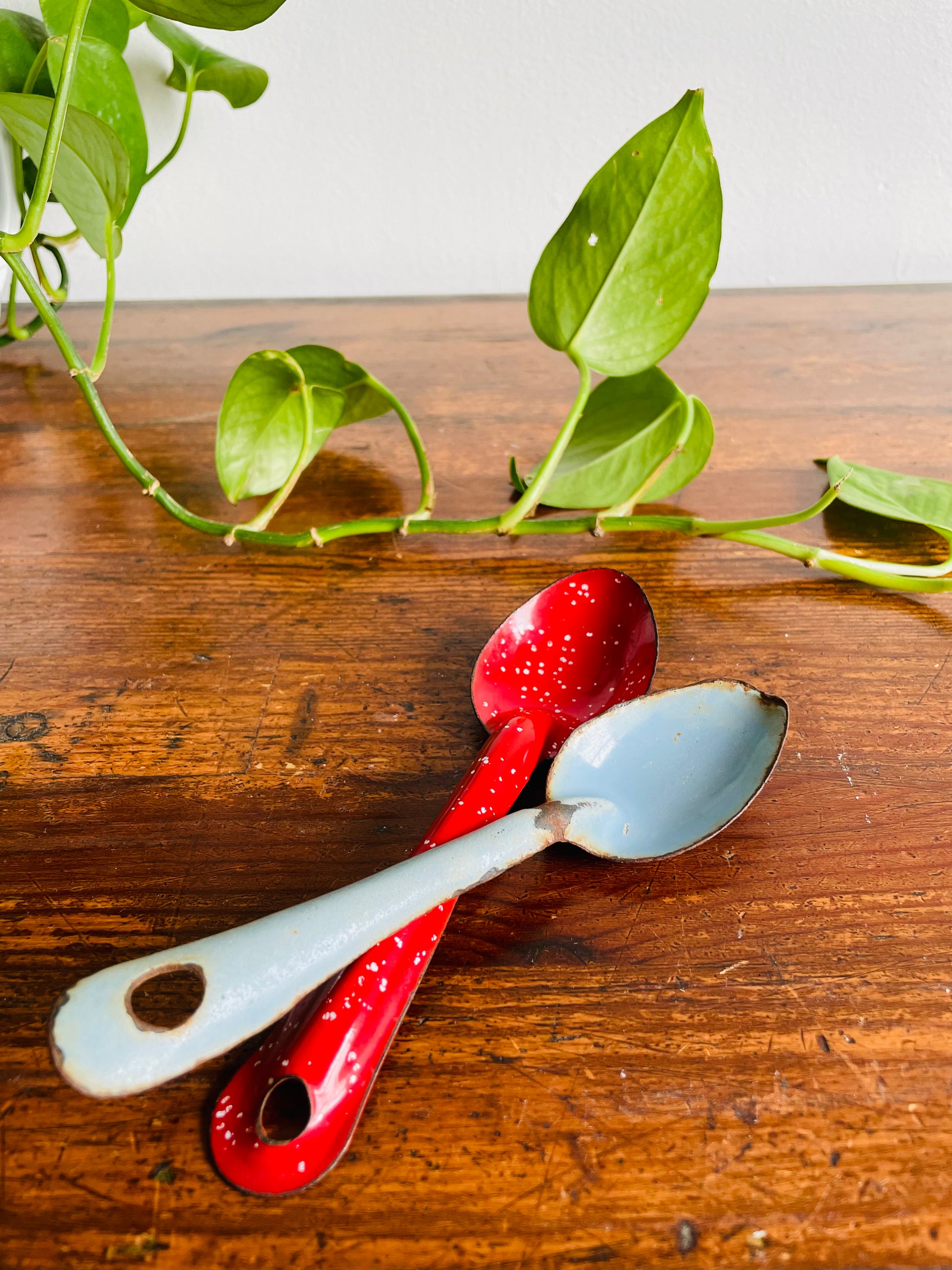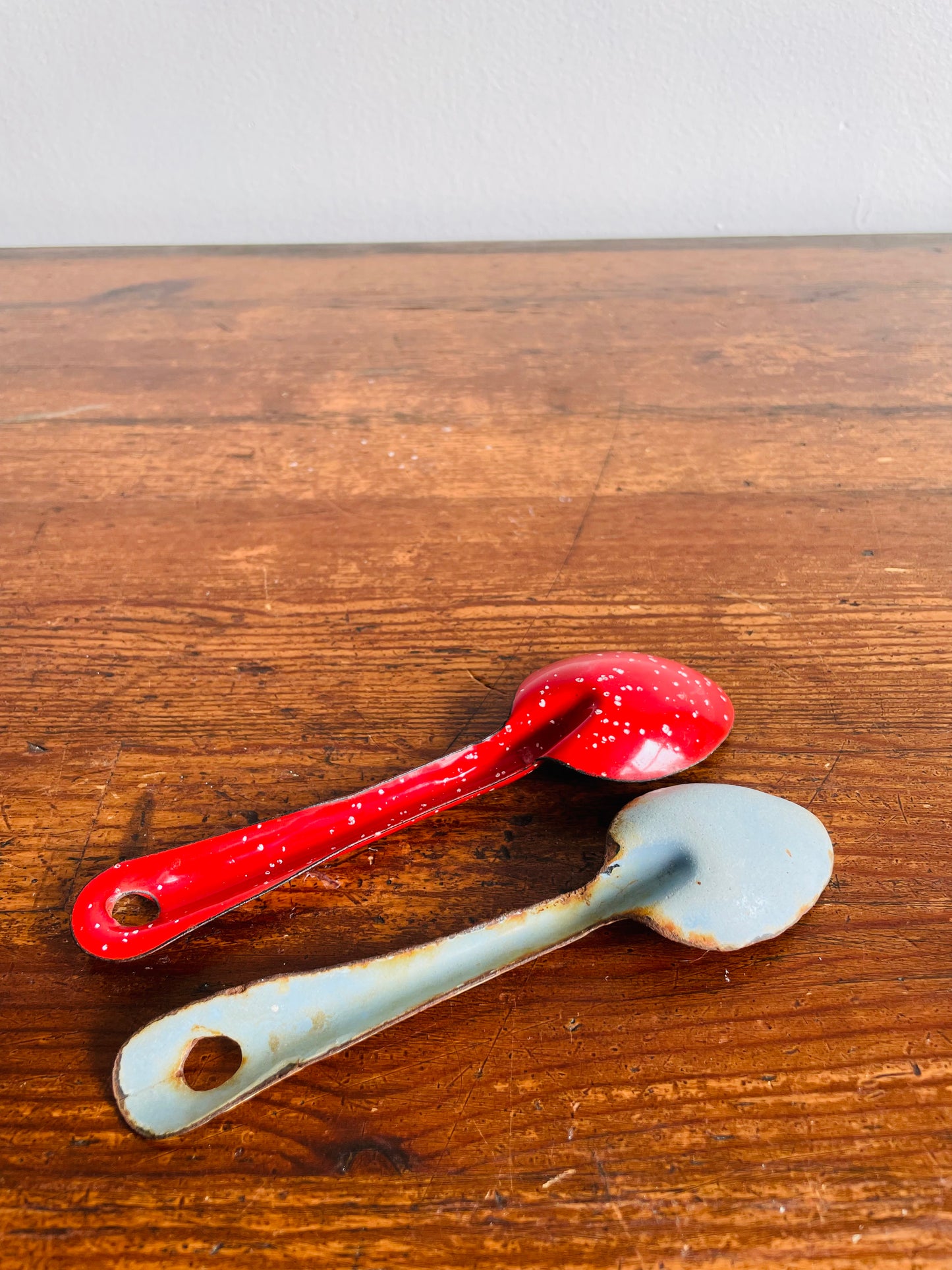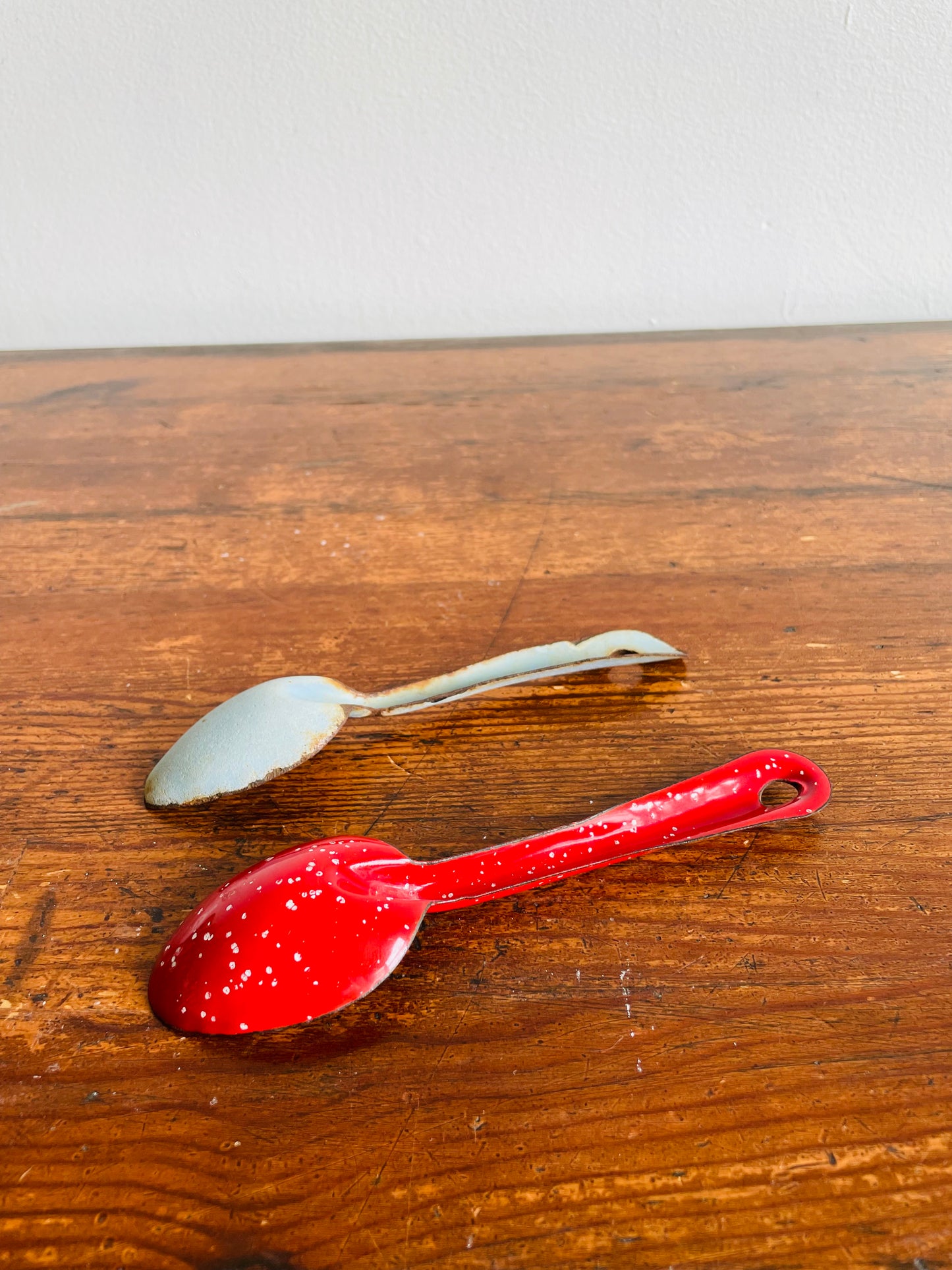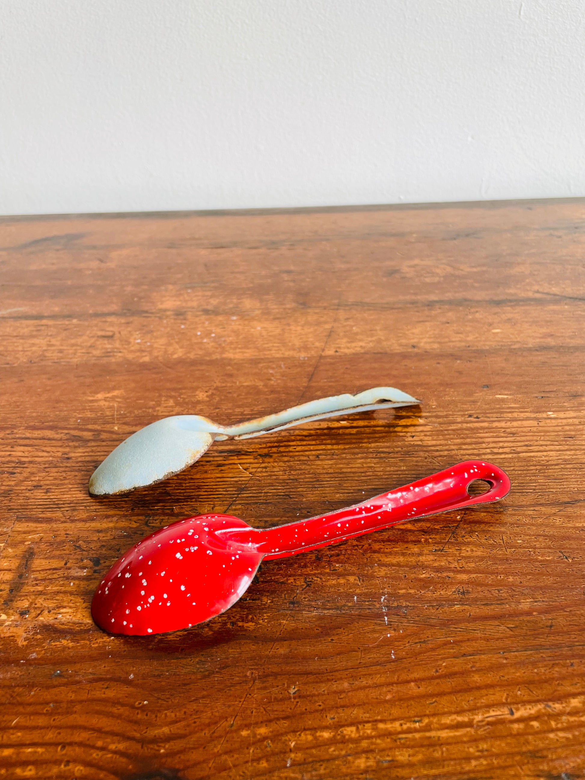Graniteware Enamelware Set of Two Spoons - Red with White Flecks & Robin Egg Blue