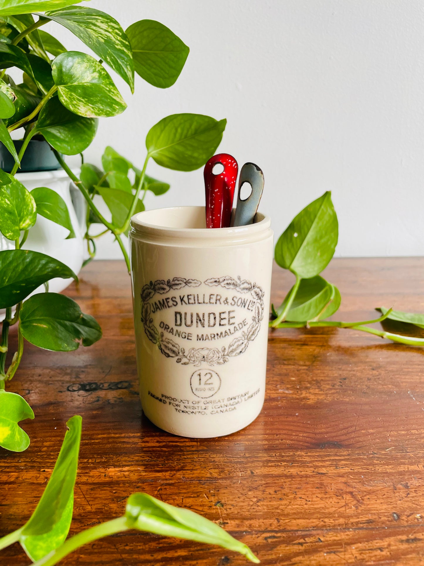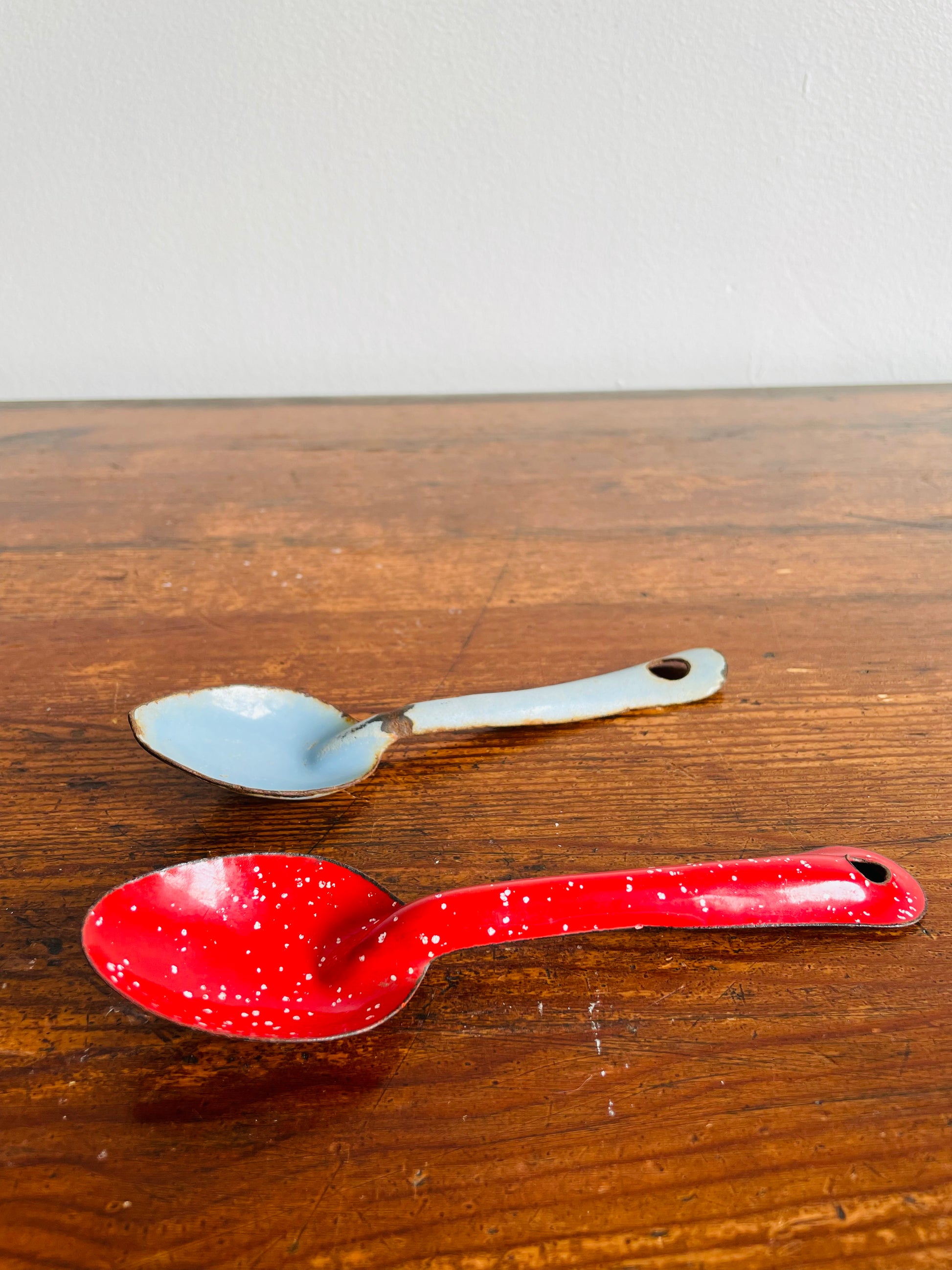 A set of two graniteware/enamelware spoons. These would look so cute on display or to be used as a measuring scoop. You could also hang them in your kitchen, hang them to make a wind chime, or use them as markers in a garden for a rustic touch!