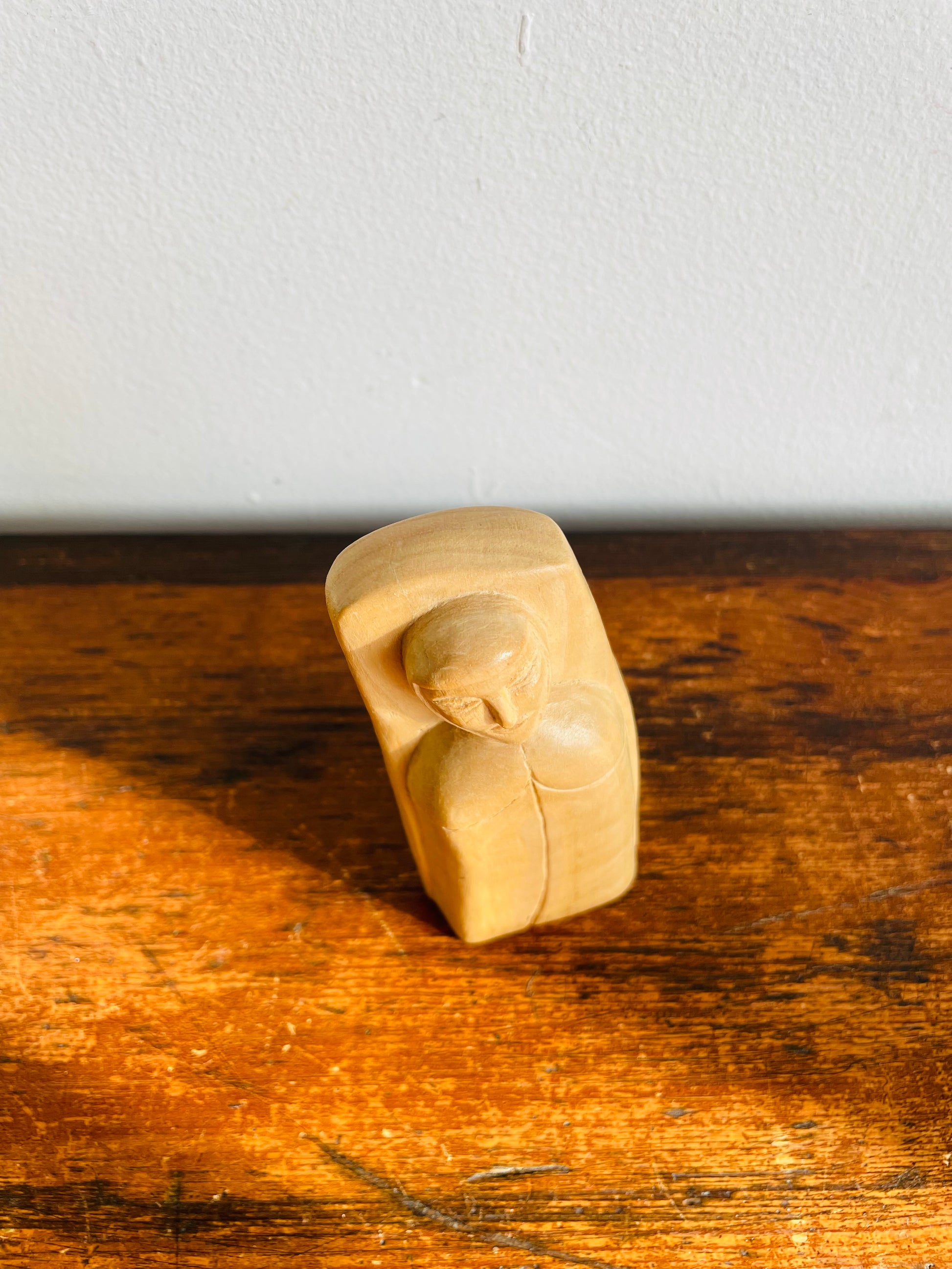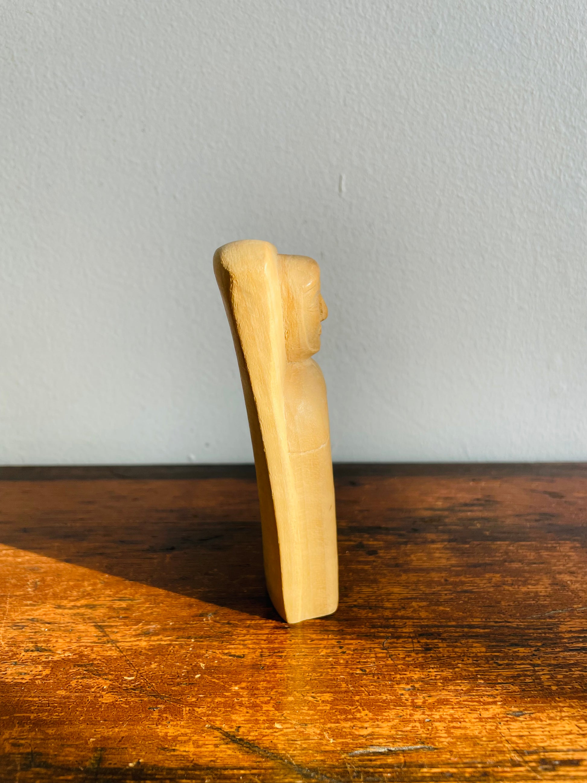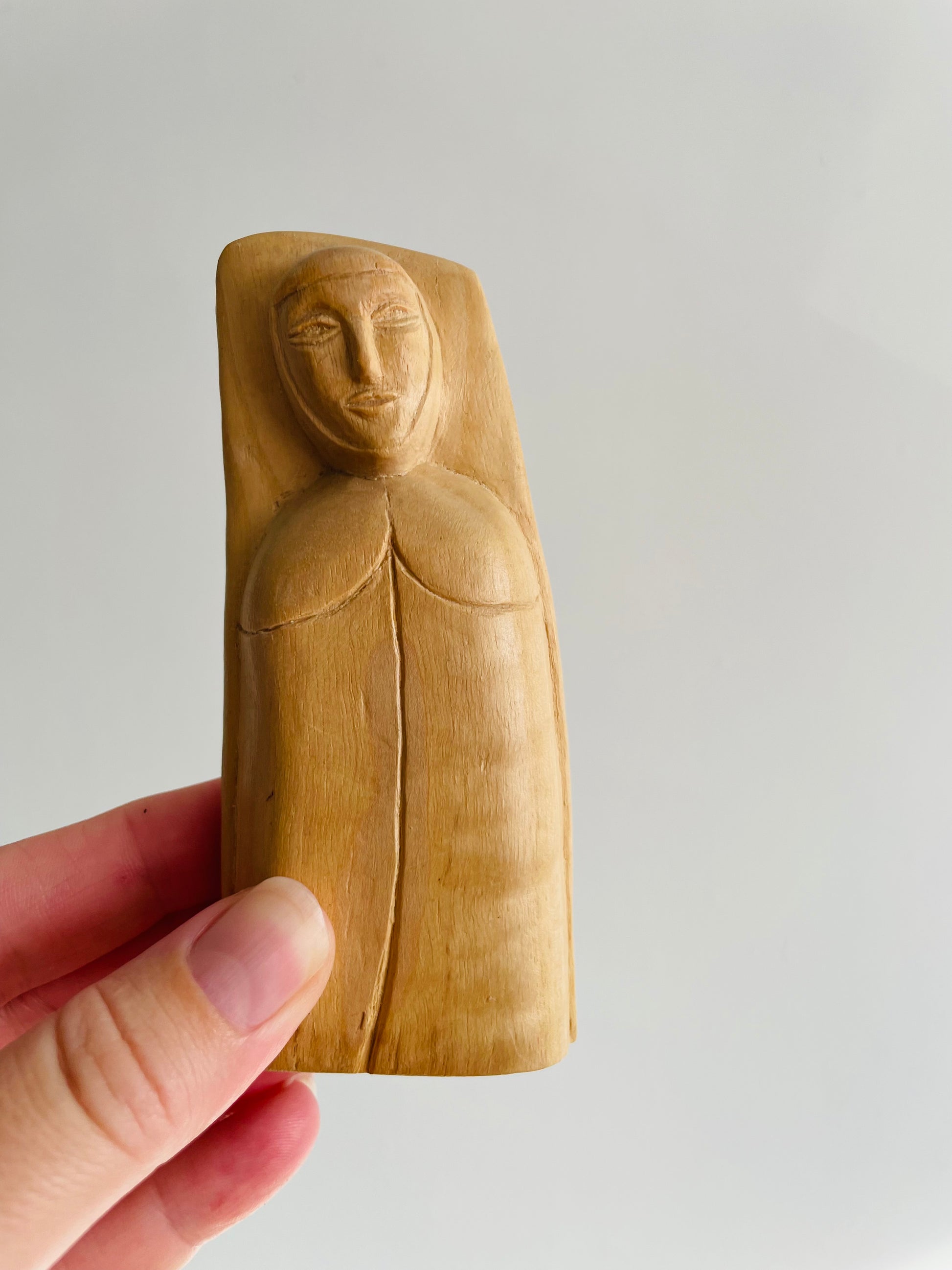A hand carved wood figurine that is carved entirely from a single piece of wood. Although I believe it to be a religious statue, I couldn't find anything online when I tried to research it. I also tried to research the name that is carved on the bottom but I couldn't find anything either.