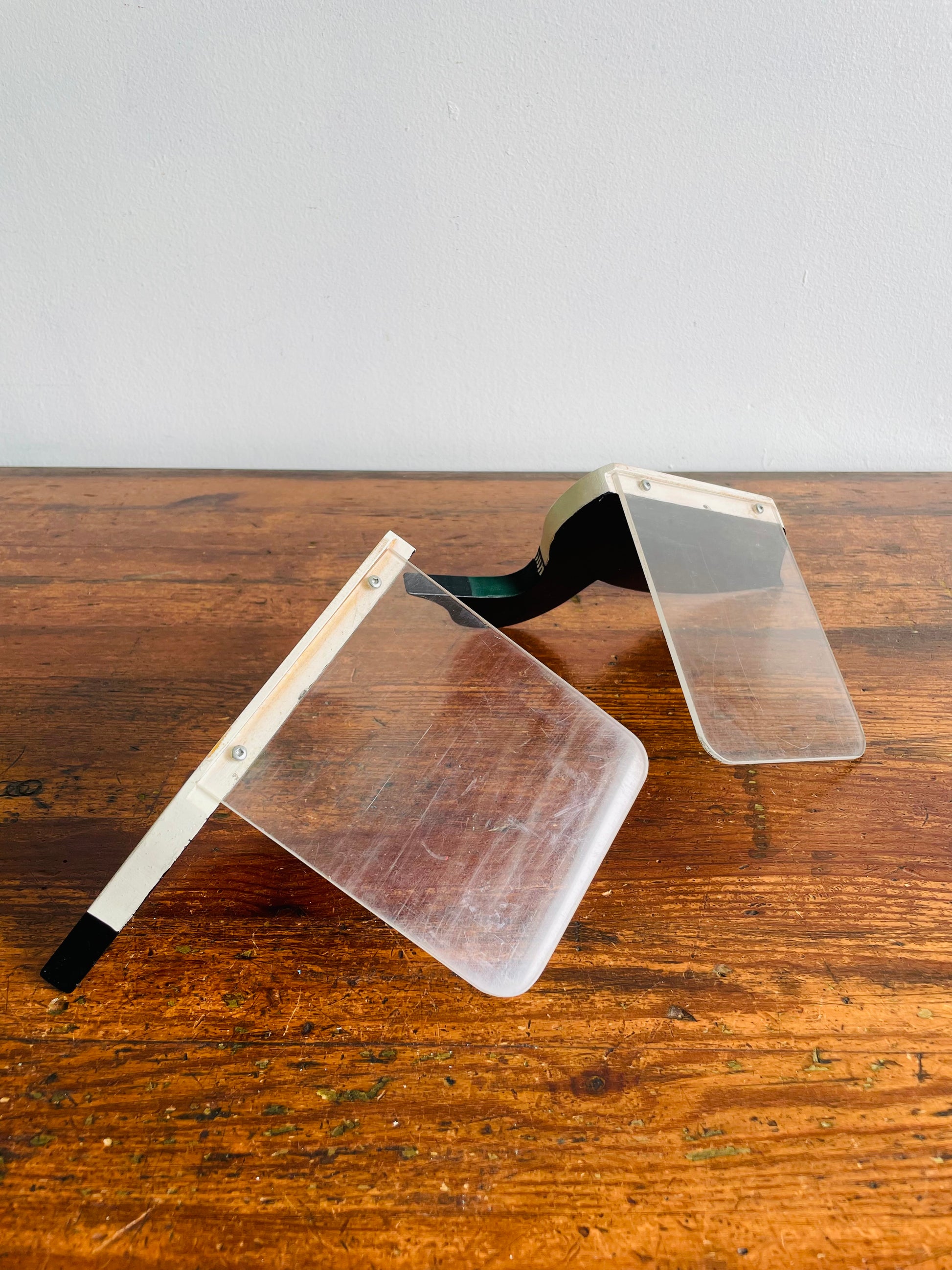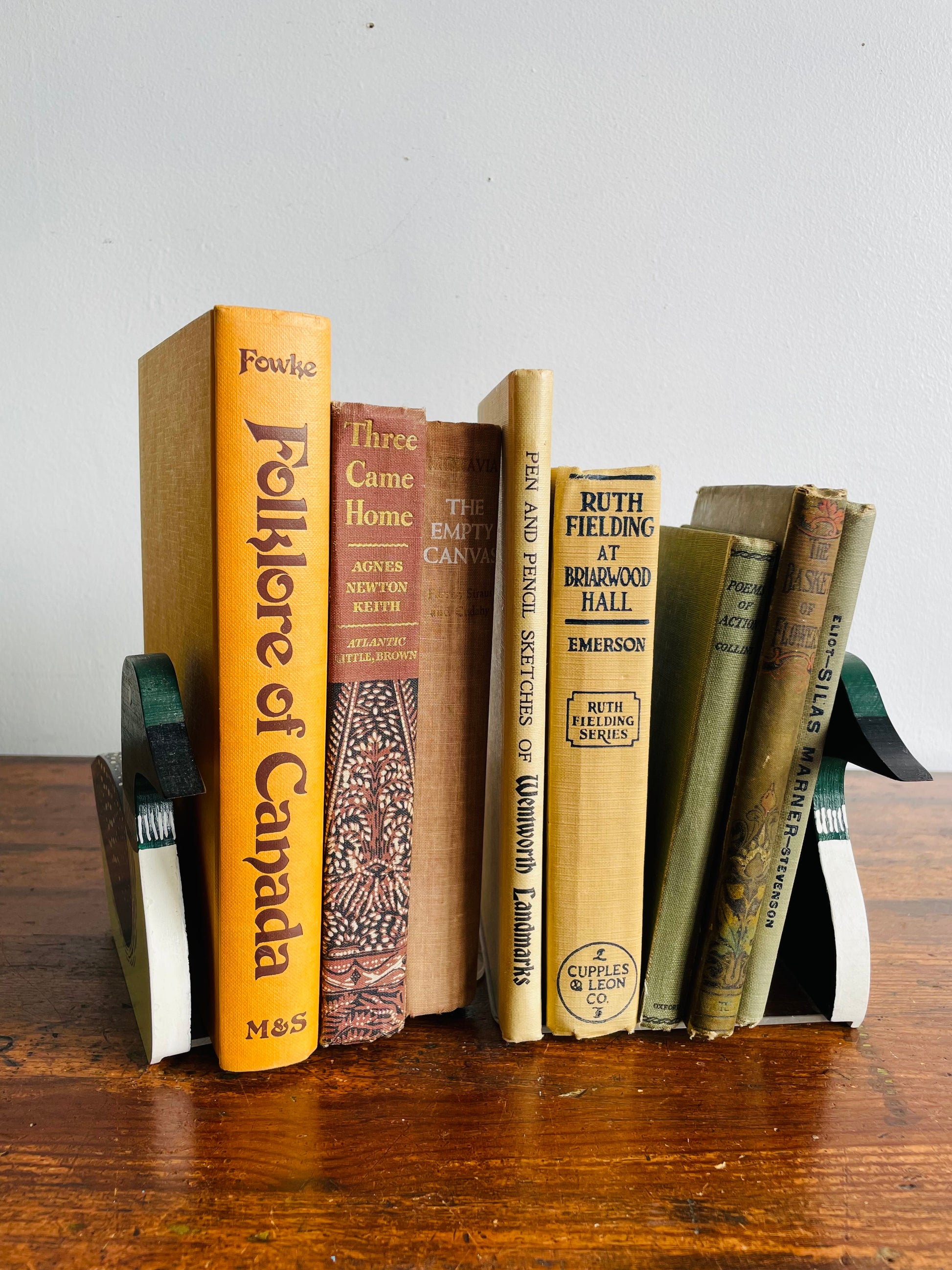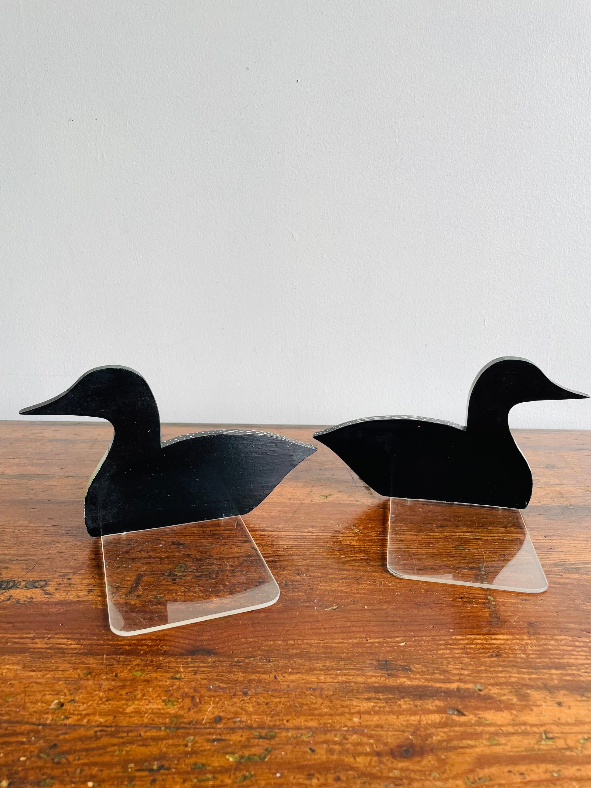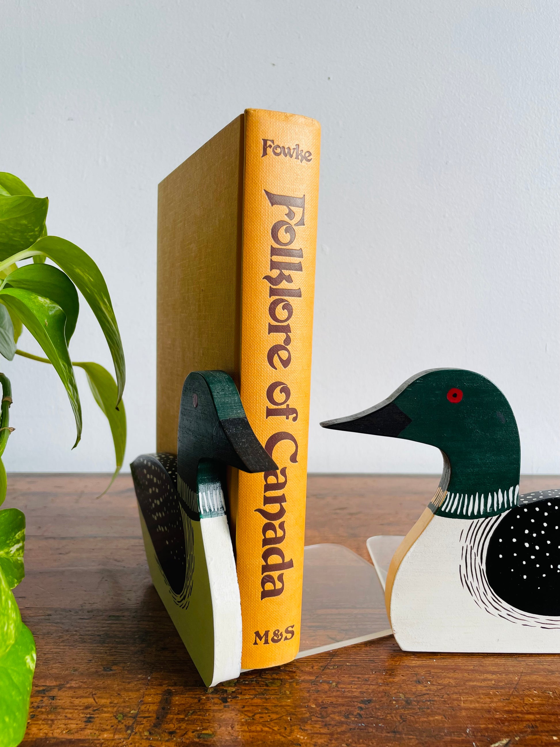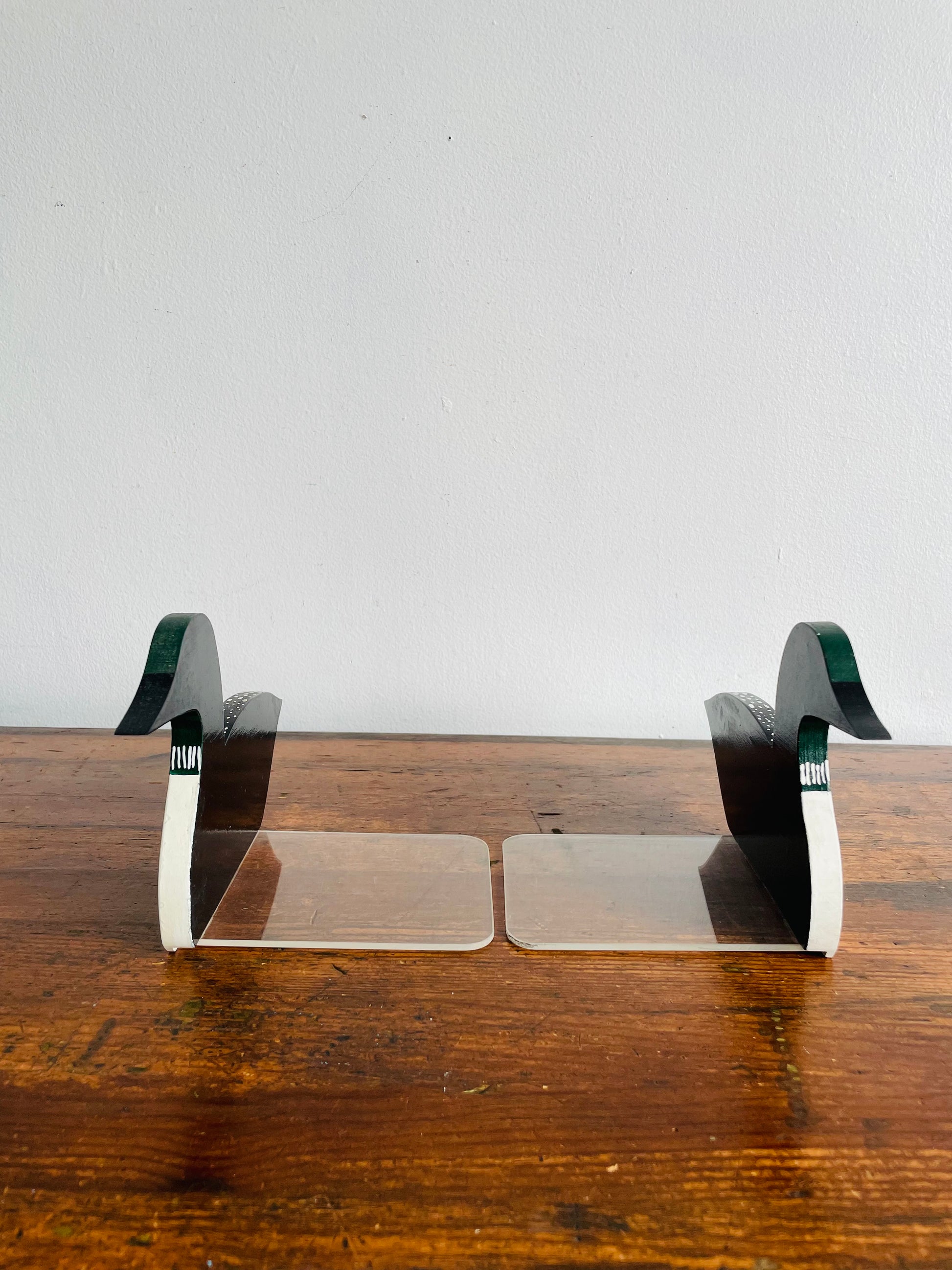 The loons are made from wood and screwed into the plexiglass bases which slide under to hold up the books.