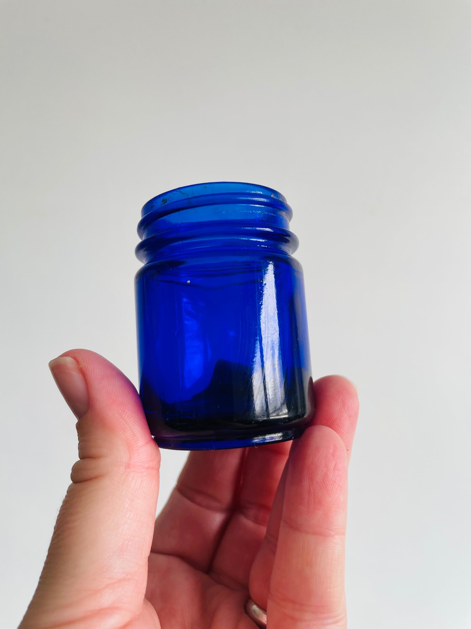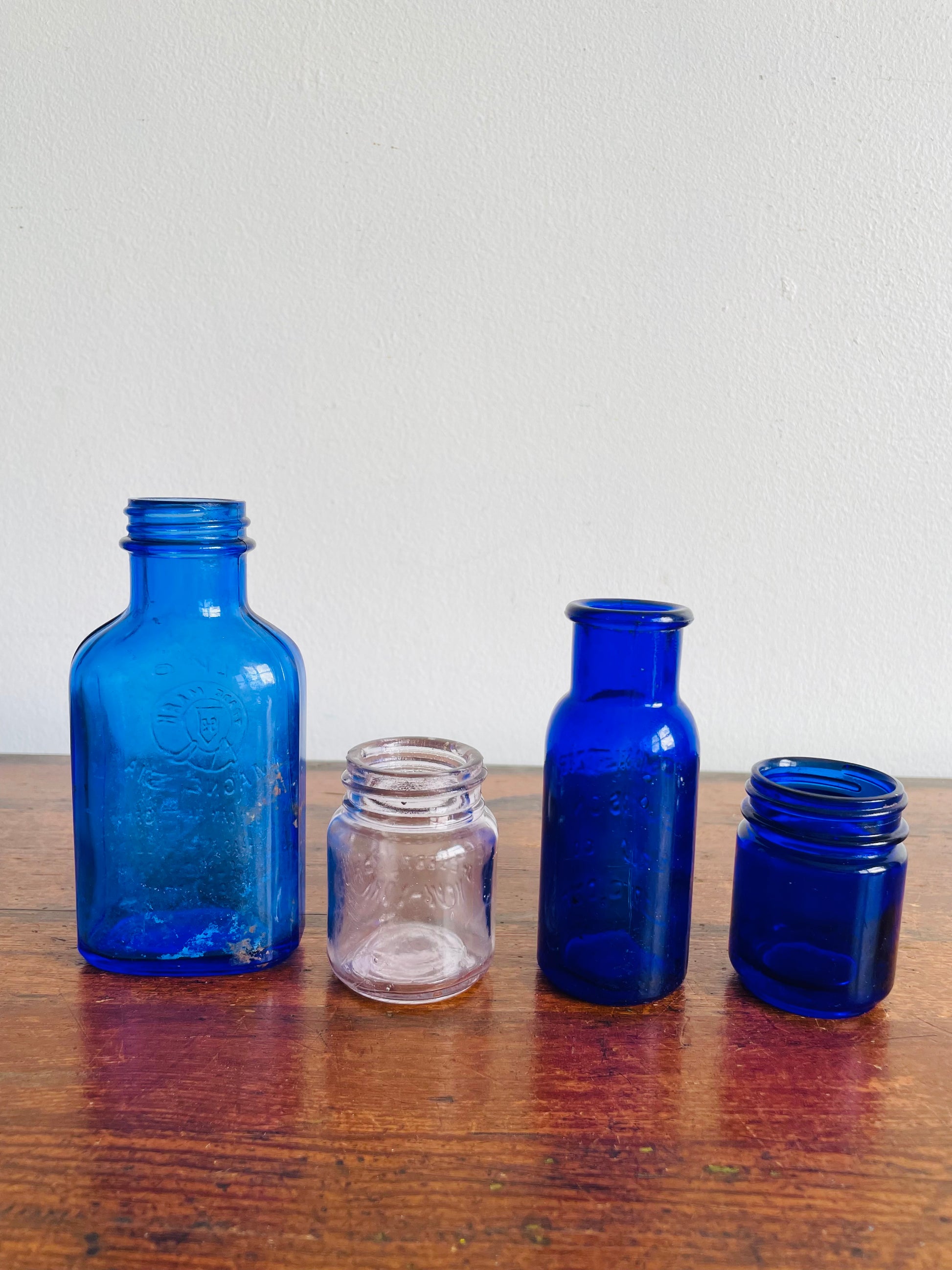 Instant Collection of Cobalt Blue & Clear Medicinal Glass Bottles - Set of 4 - Milk of Magnesia, Bromoseltzer, Vaseline & Vicks