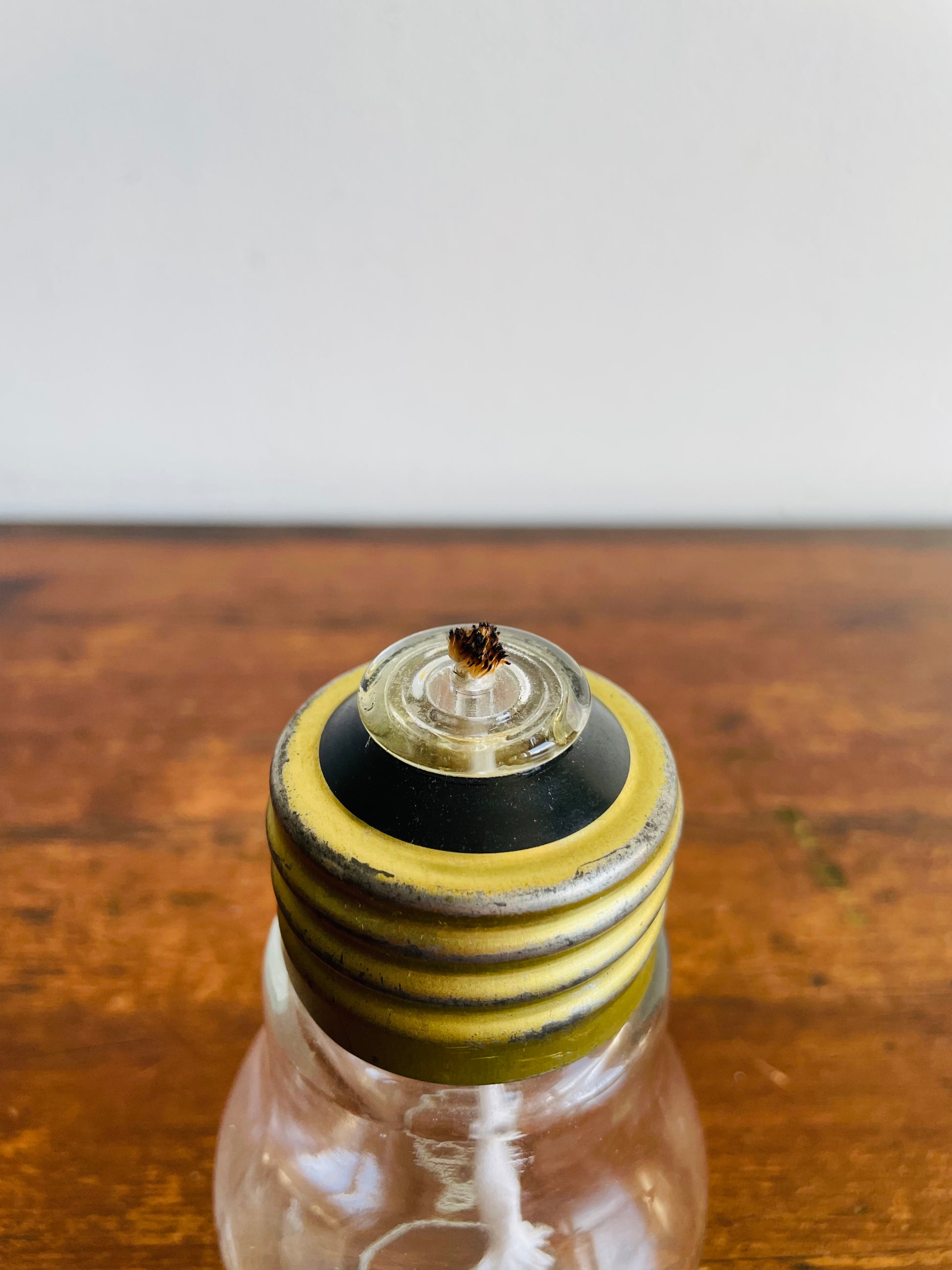 When I researched this online it looks like it was originally a liquor bottle shaped like a light bulb. When I purchased it in Sweden it had holes in the top of it so it looked like someone had converted it into a salt shaker. My husband then converted it into an oil lamp.