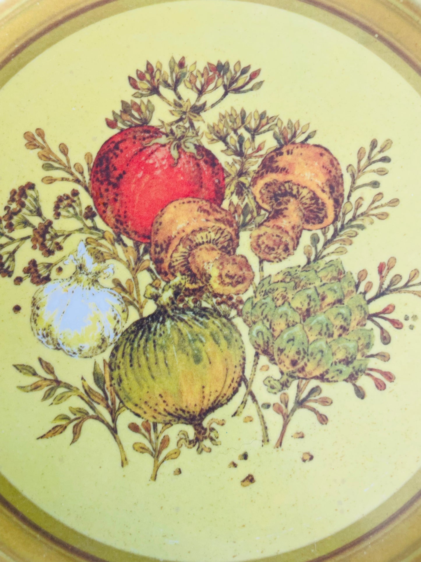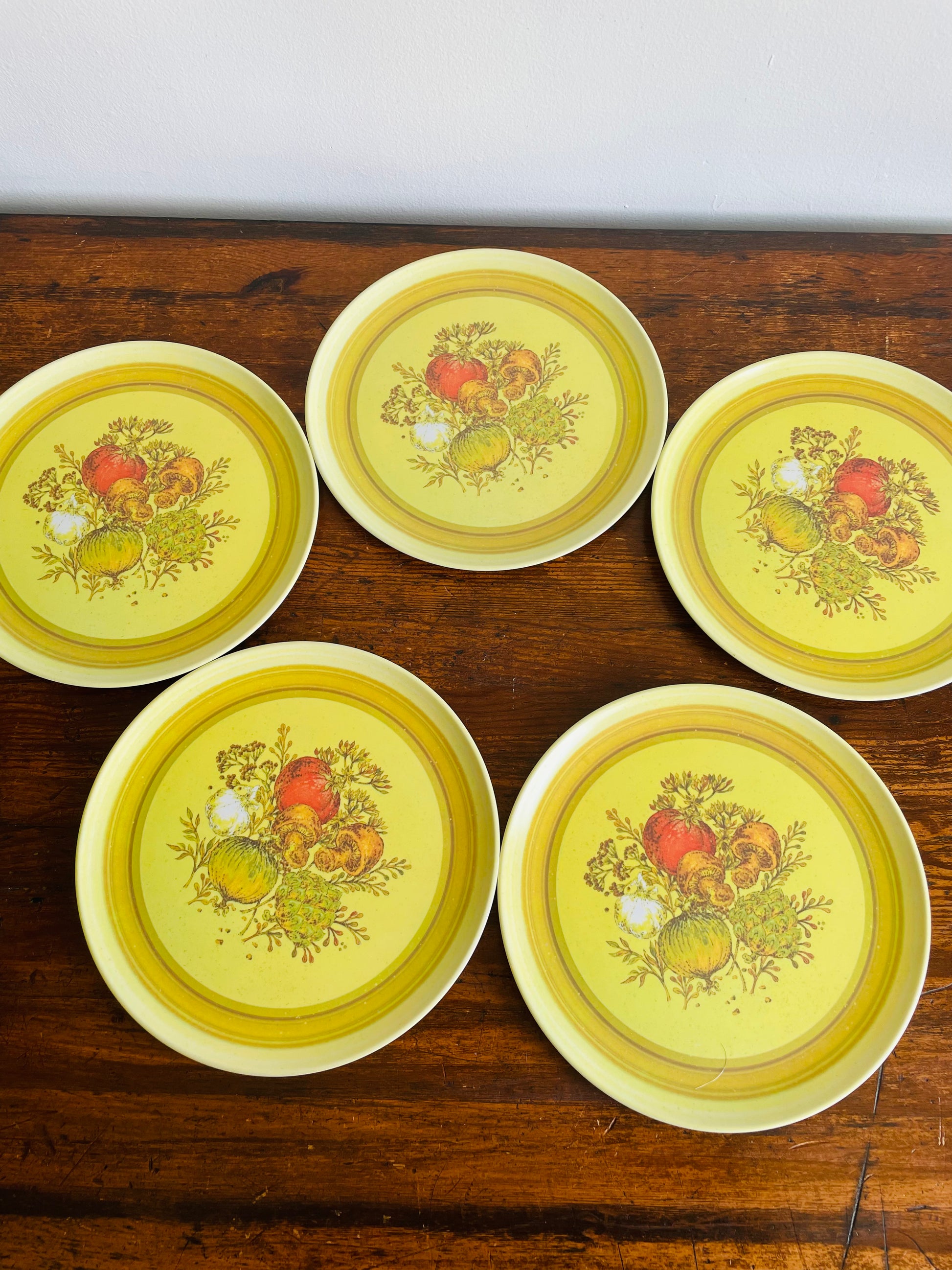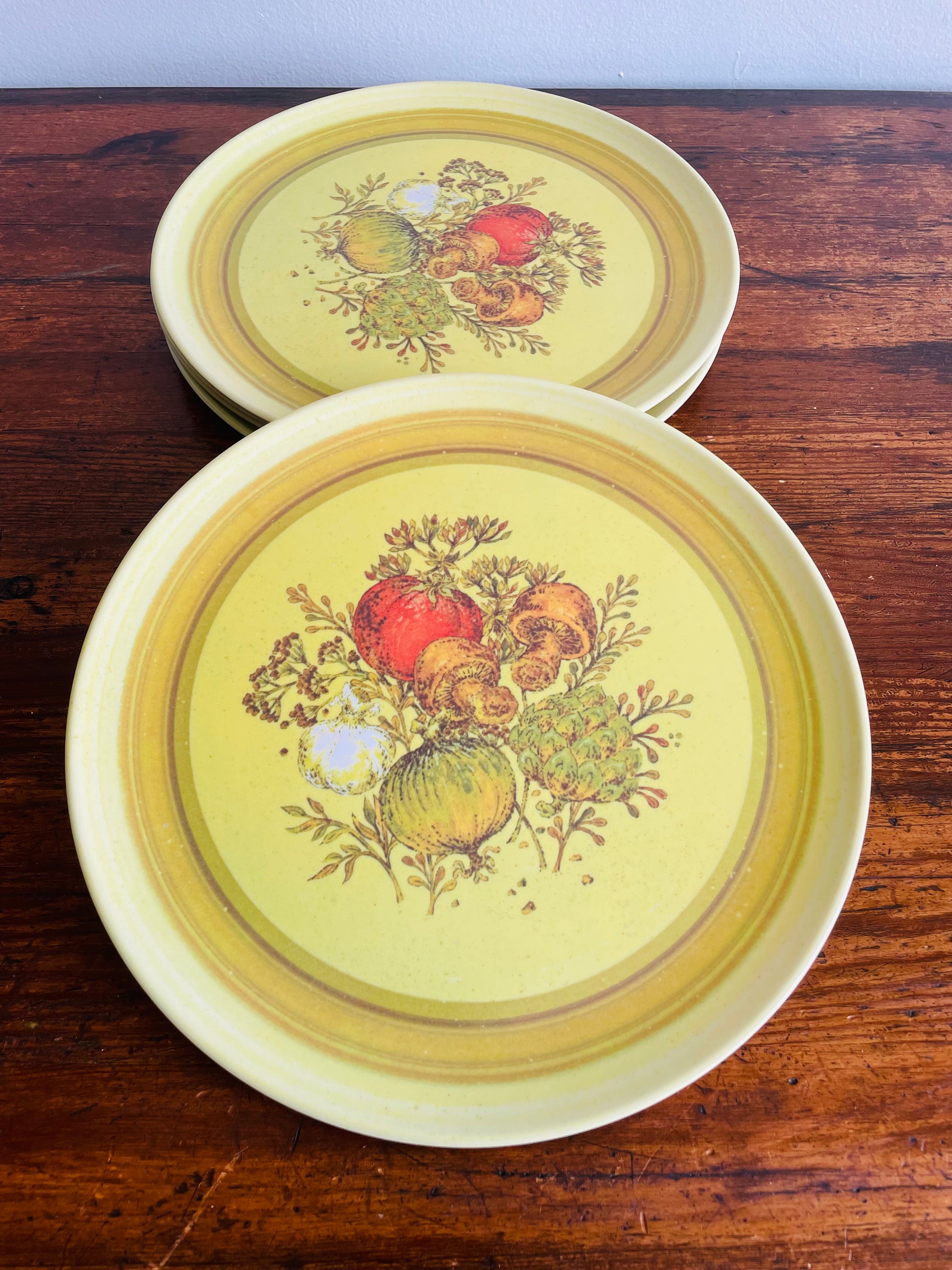 An adorable set of five melamine plates with a cute vegetable design including mushrooms, tomatoes, garlic, onions, artichokes and herbs.
