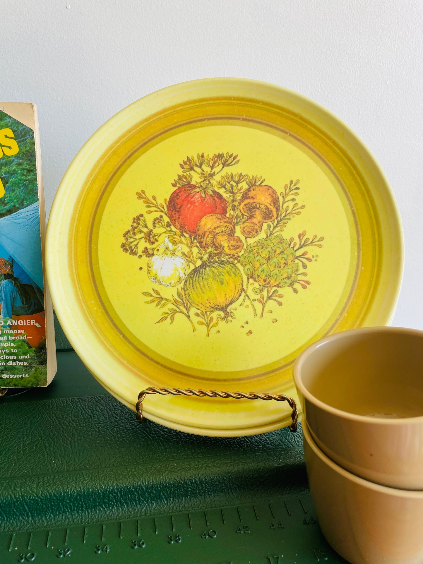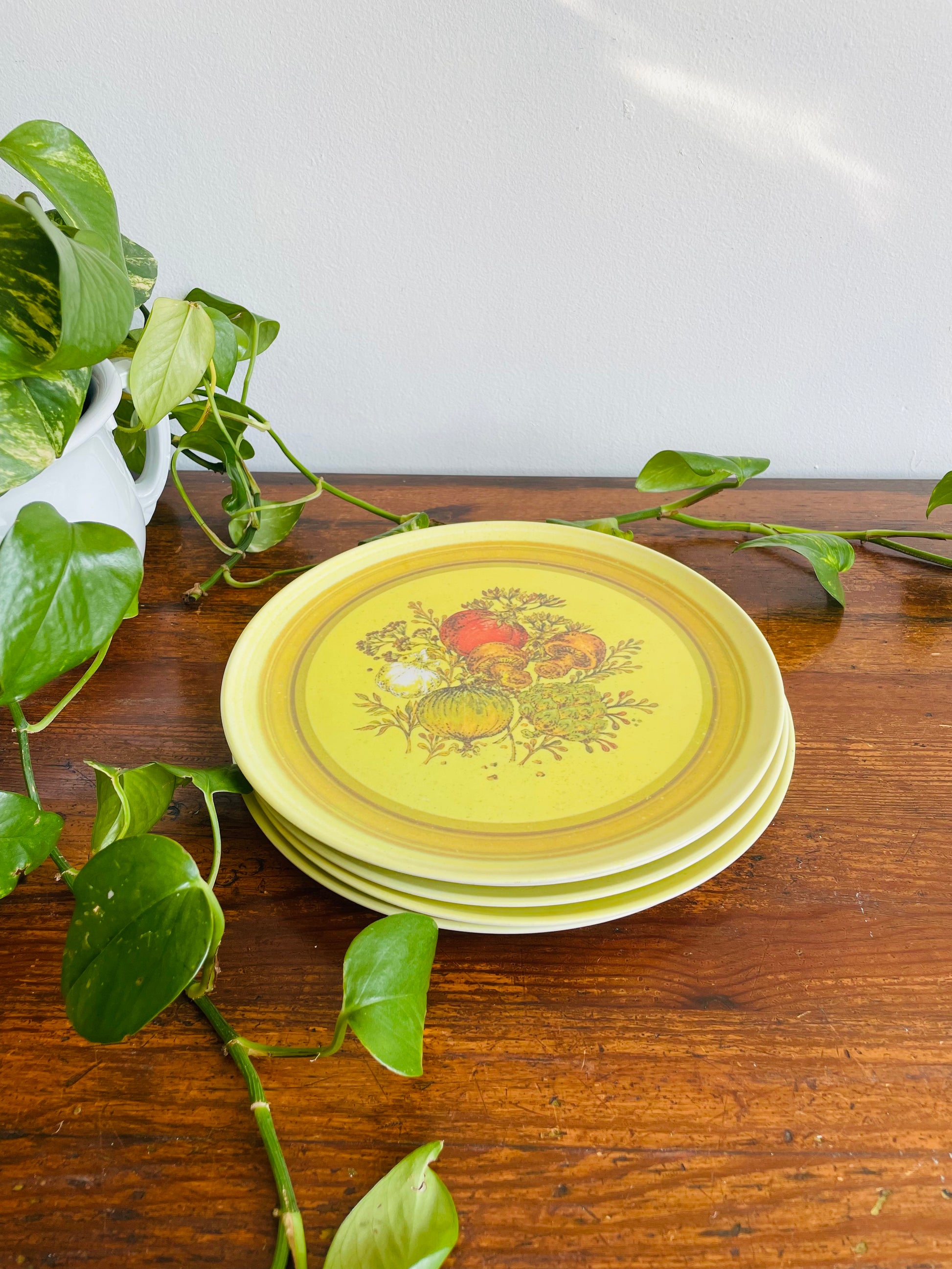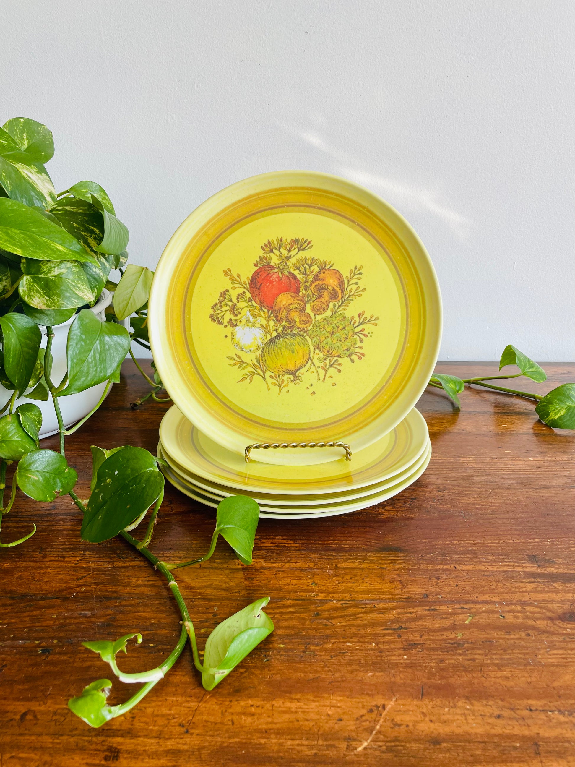 An adorable set of five melamine plates with a cute vegetable design including mushrooms, tomatoes, garlic, onions, artichokes and herbs.