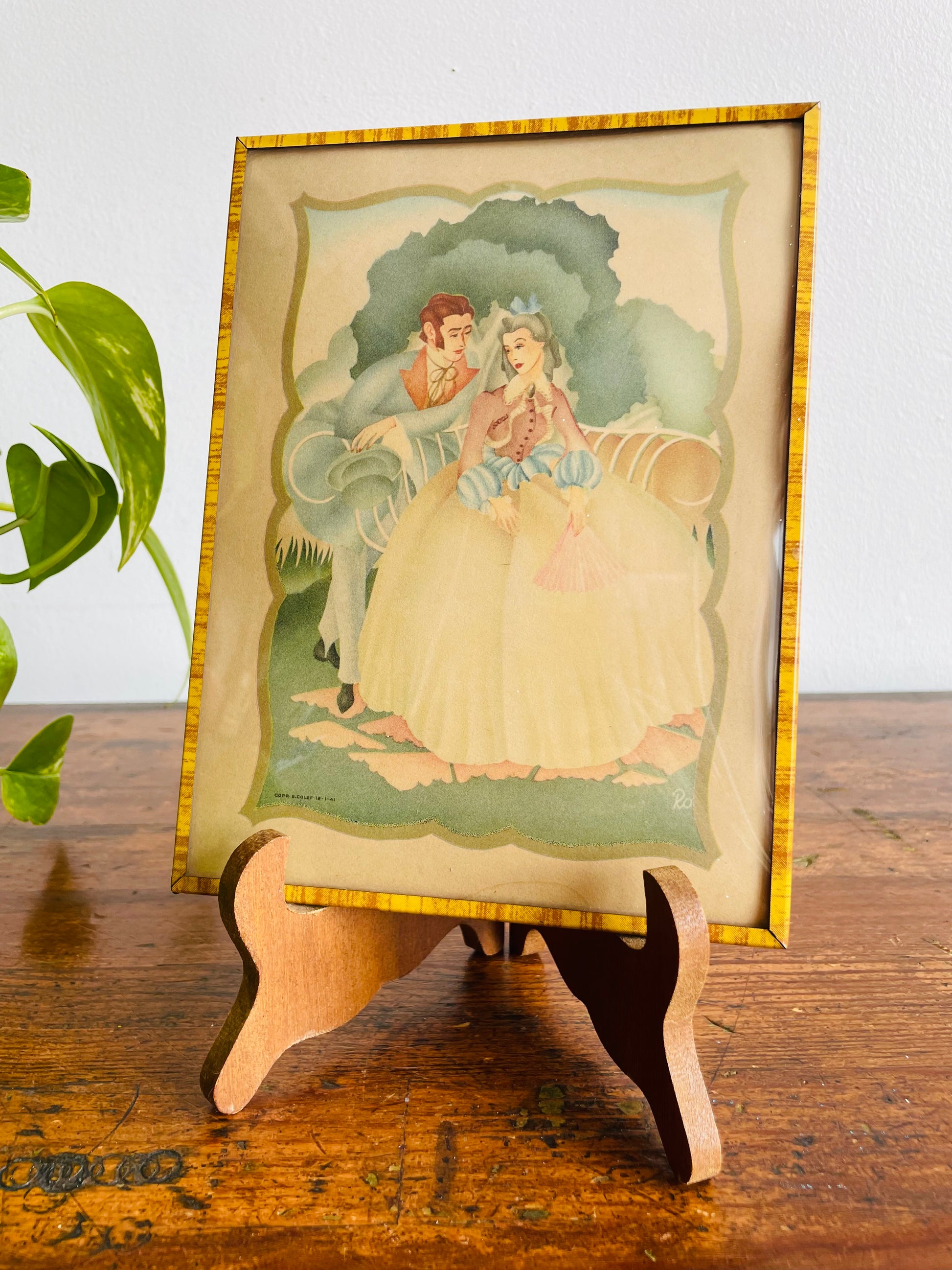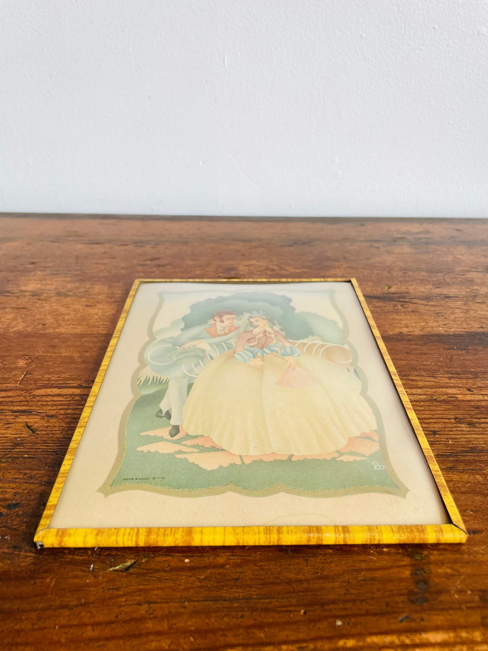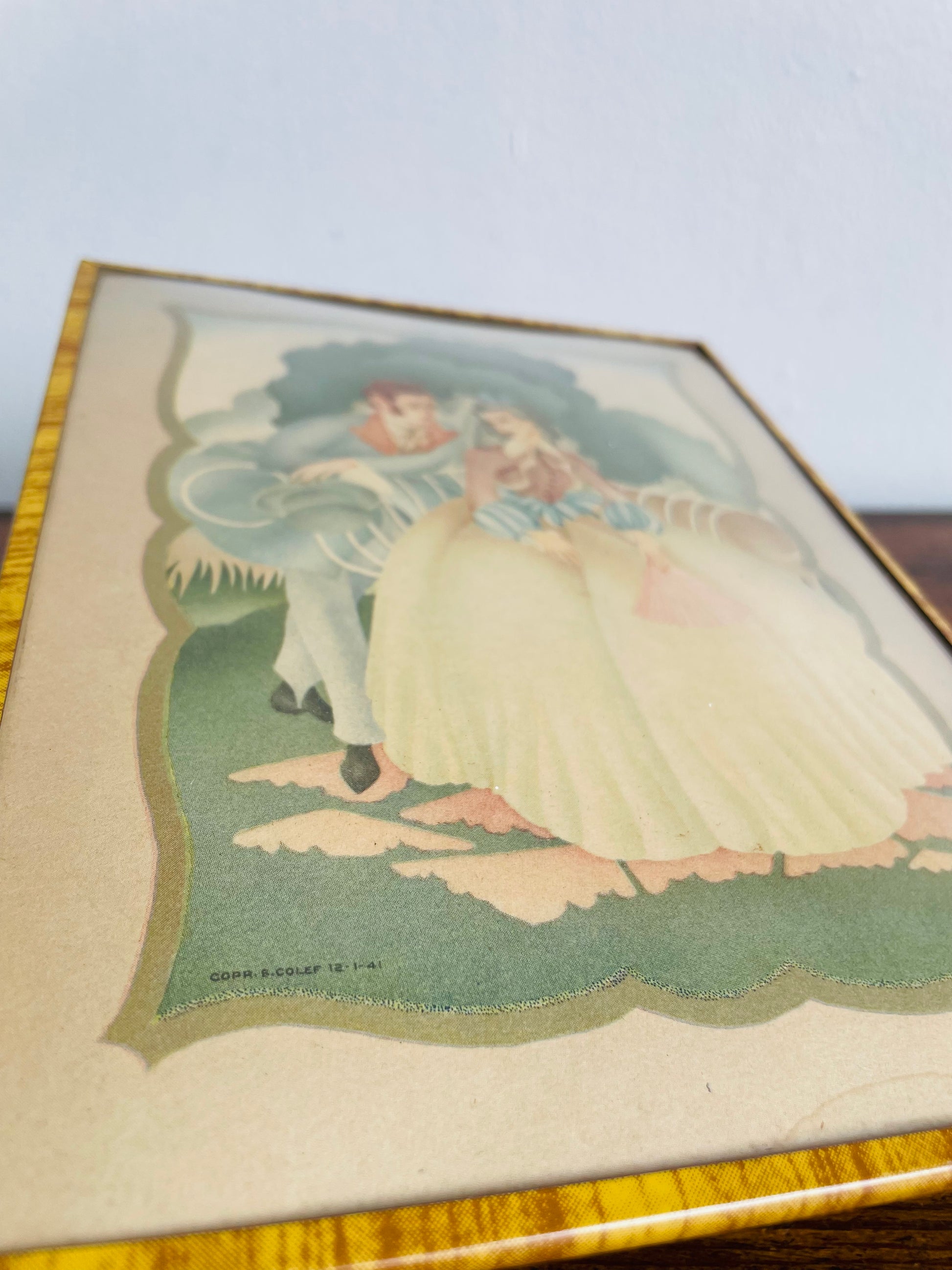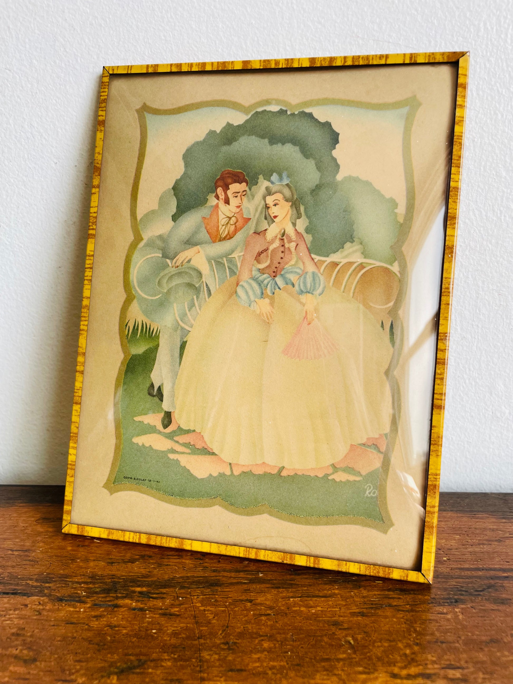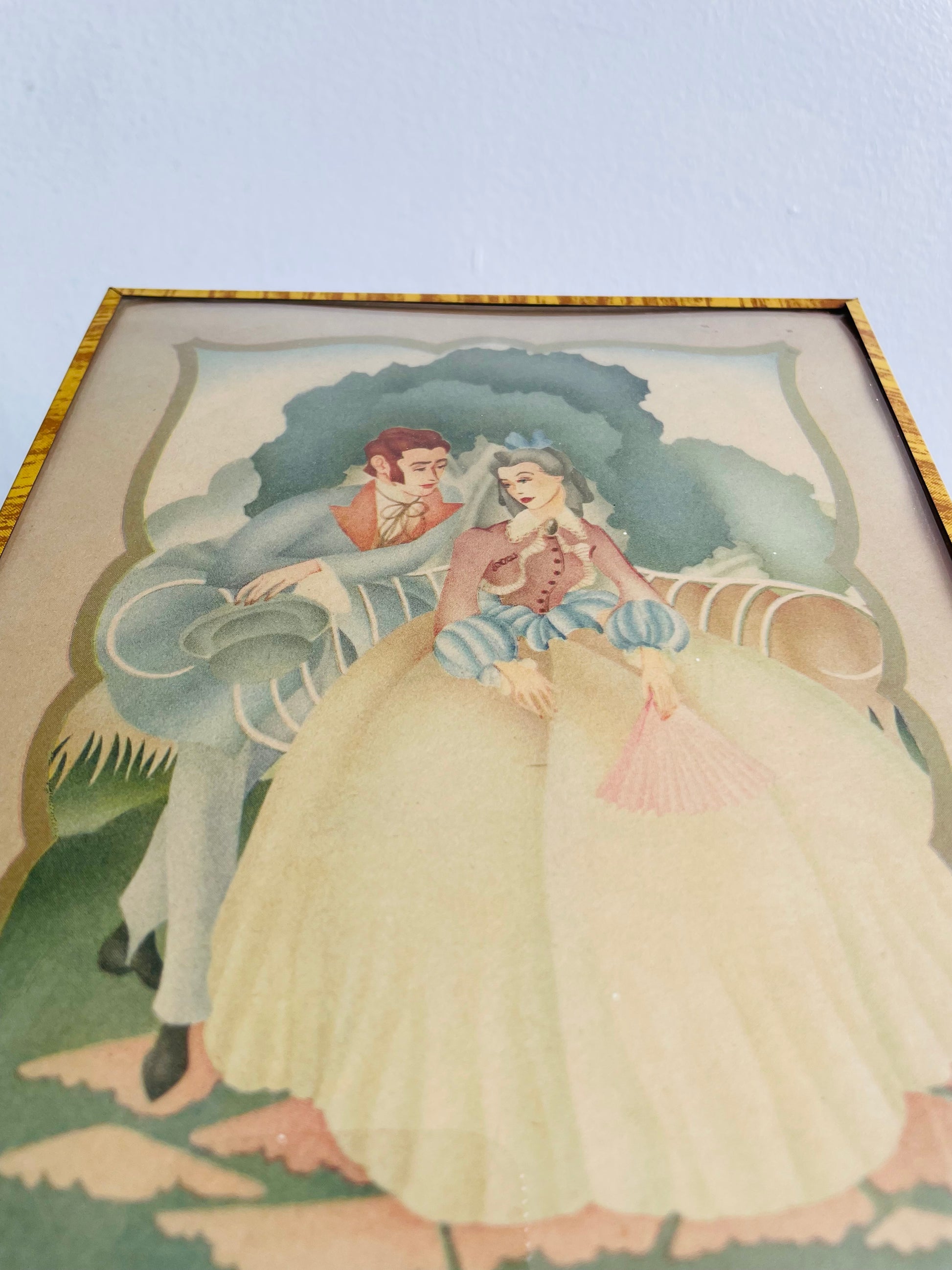 Lithograph Print Picture of Man & Woman in Victorian Dress Courting in Garden - Convex Bubble Glass - Copr. S. Colef