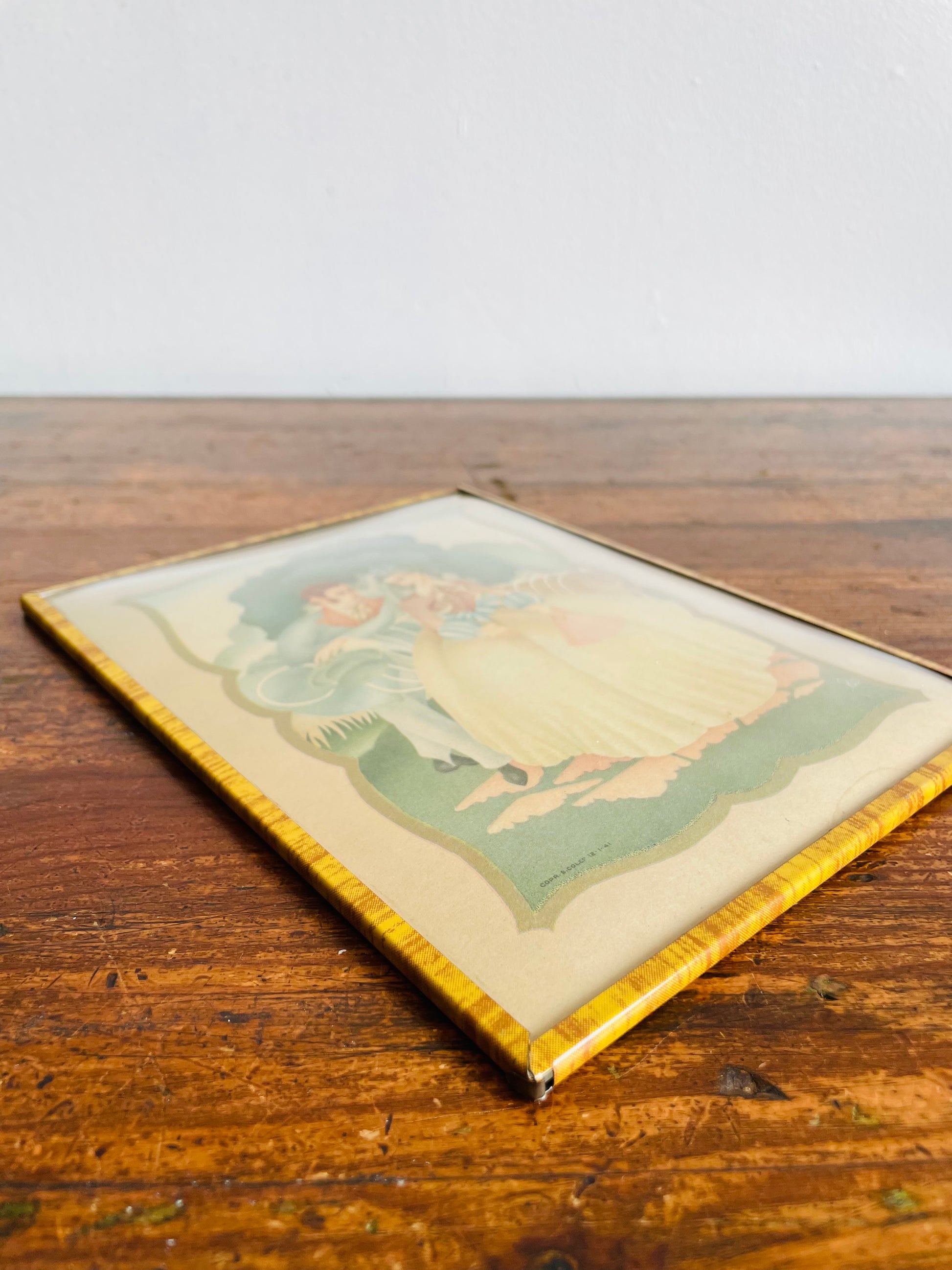 A vintage lithograph print which sits behind glass in a tin frame. The glass is convex style which rounds out in a slight bubble dome (not flat glass).