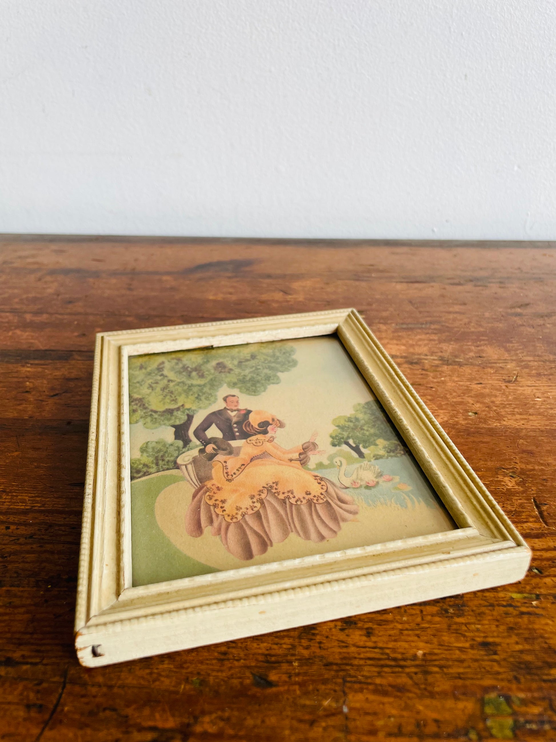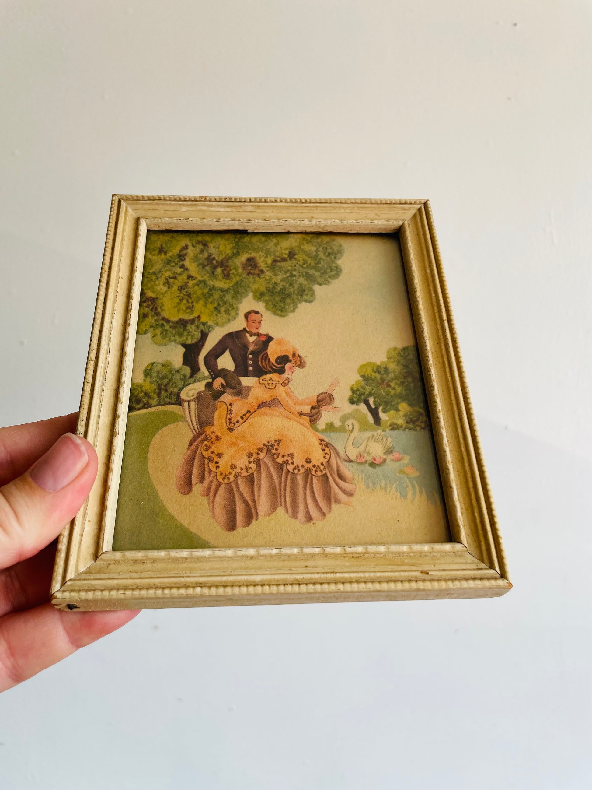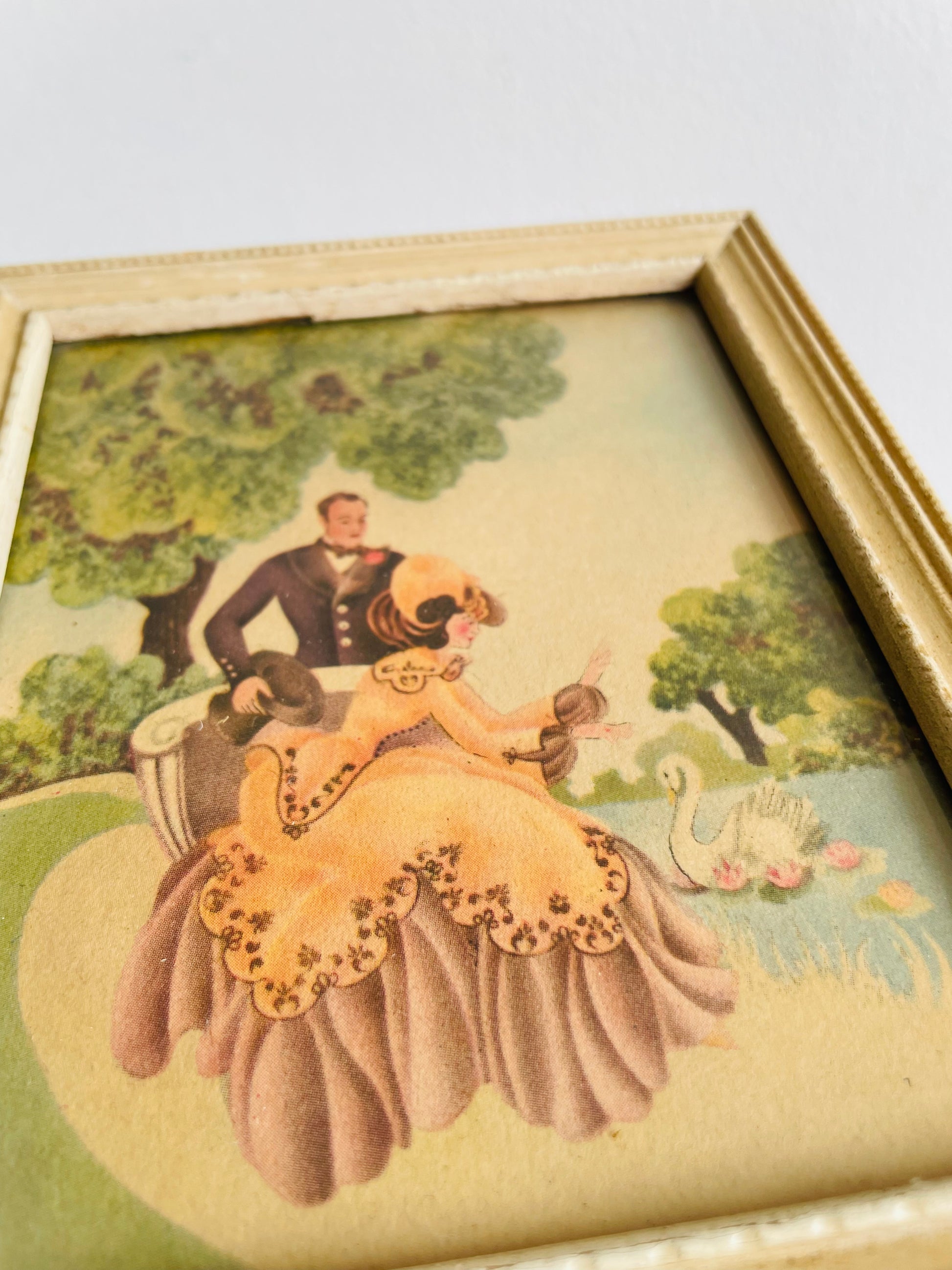 Lithograph Print Picture of Man & Woman in Yellow Victorian Dress Beside Lake with Swan