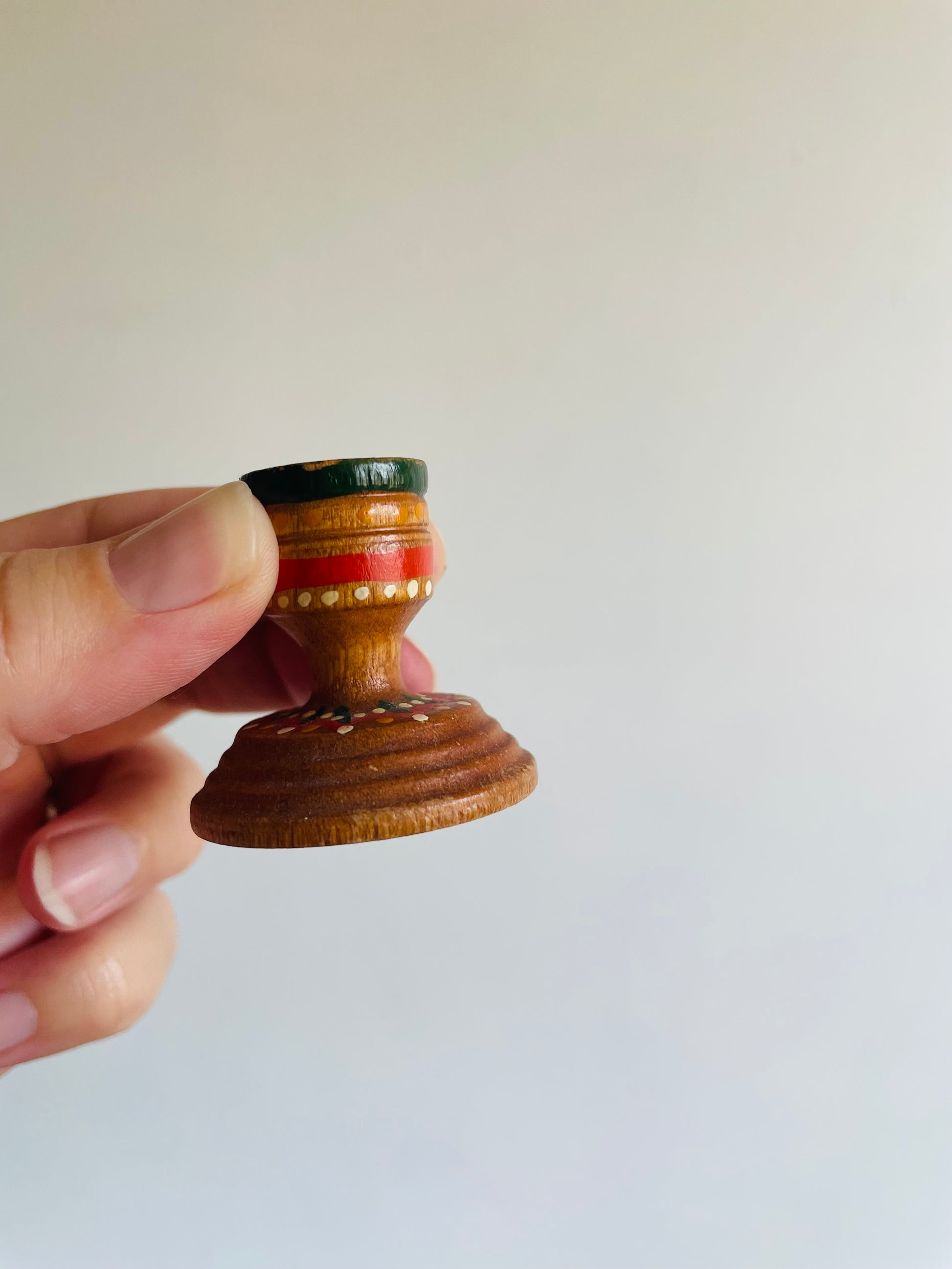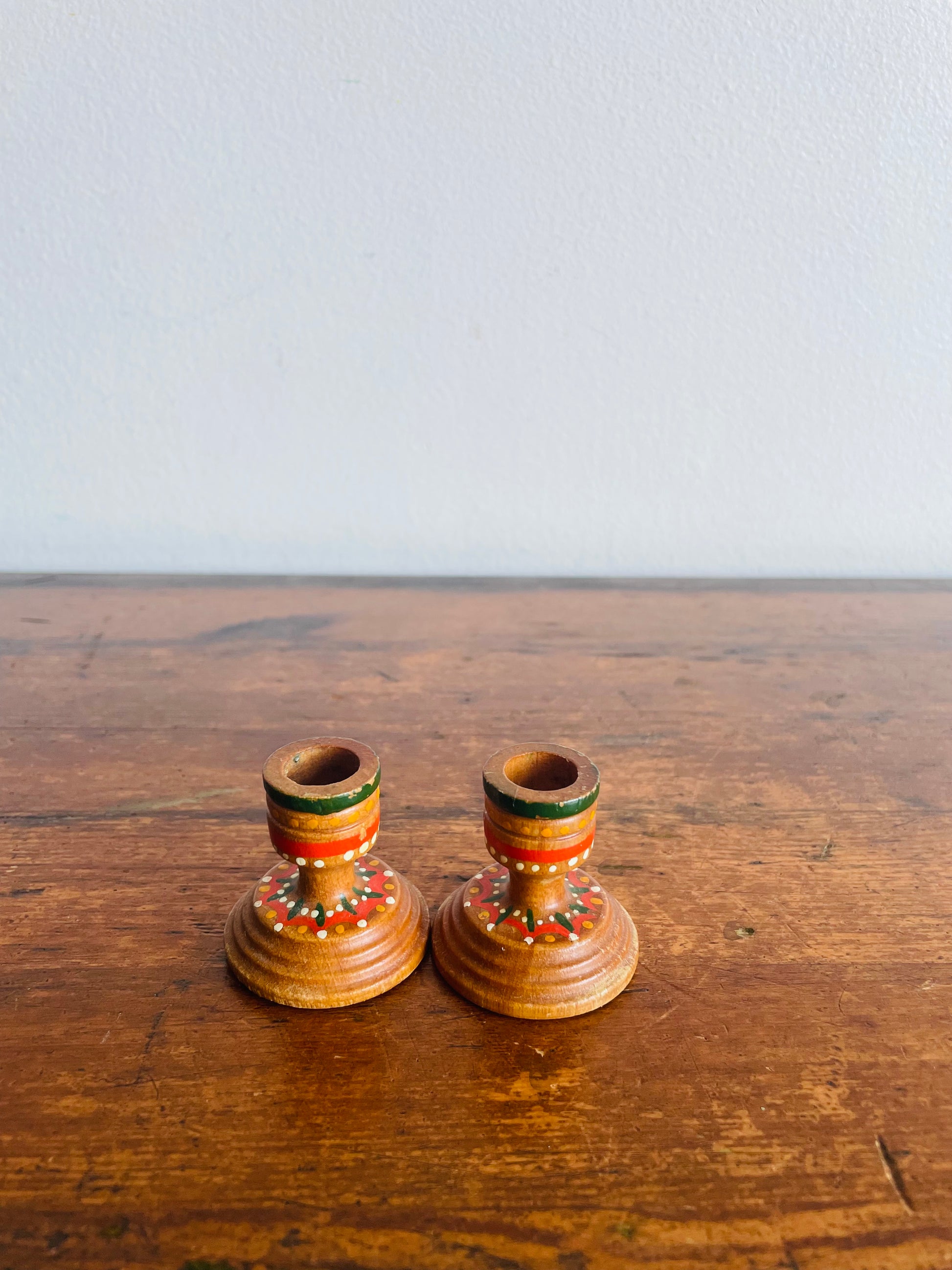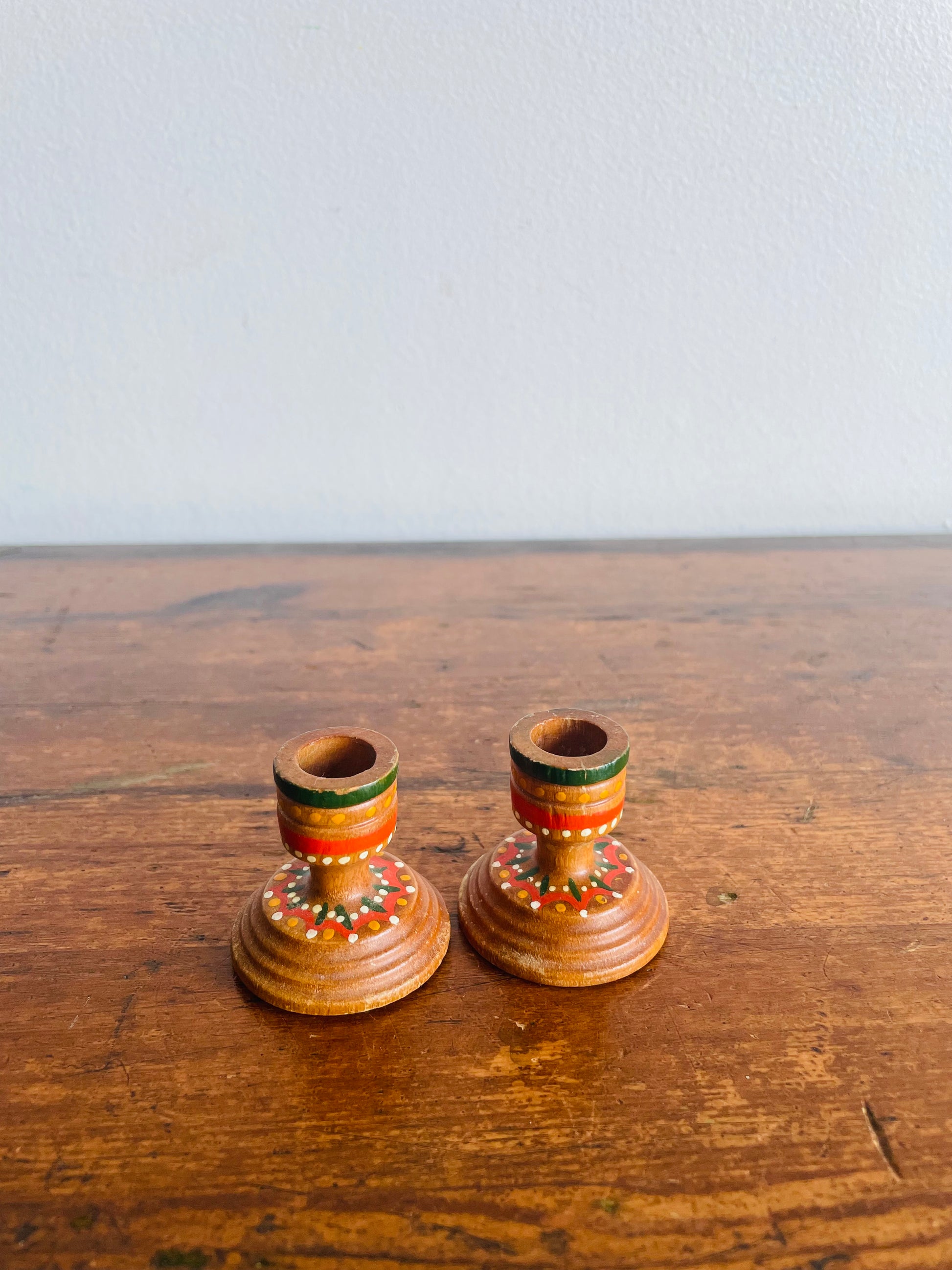 Miniature Hand Painted Wood Candlestick Holders with Folk Art Design - Set of 2