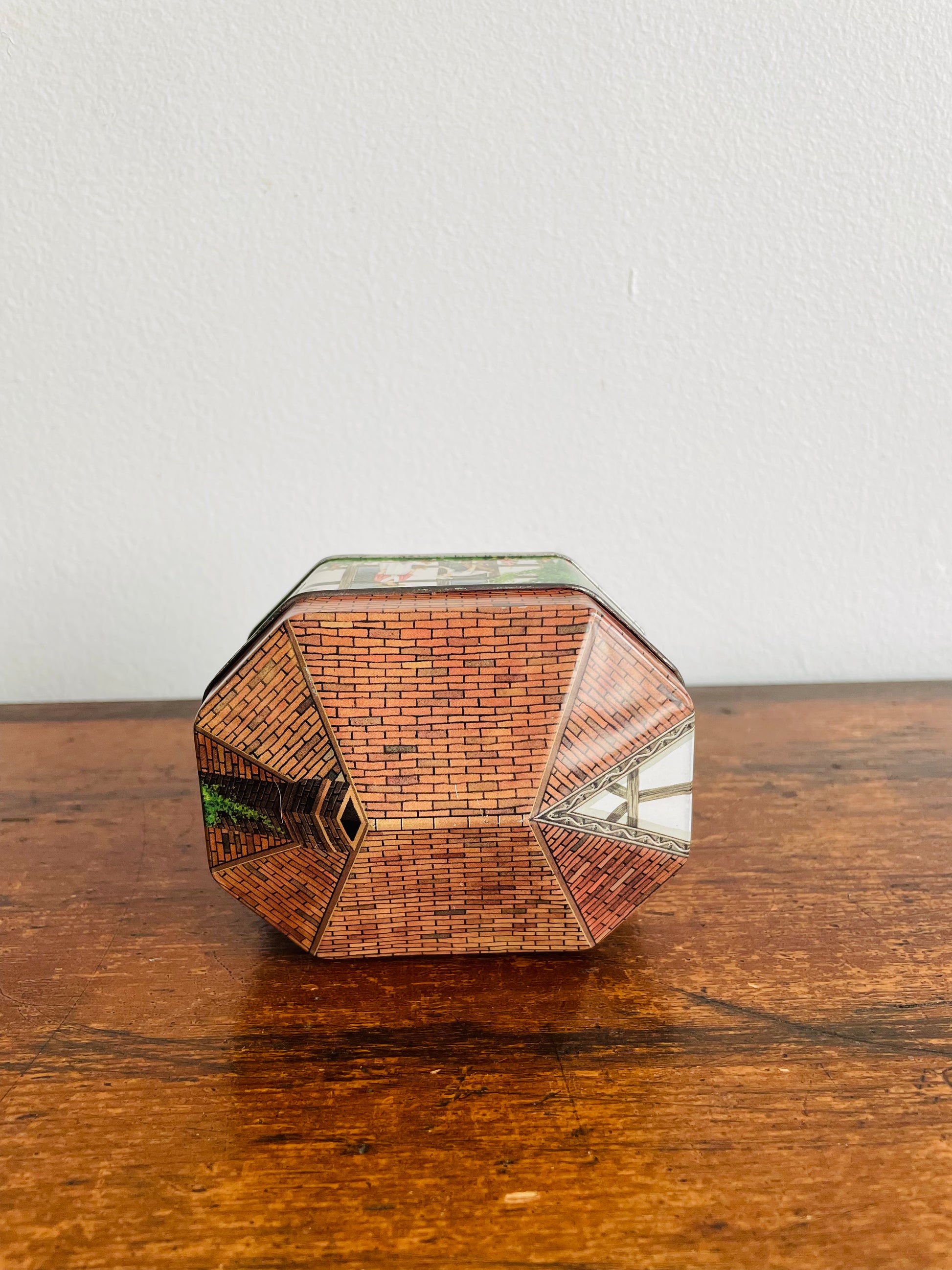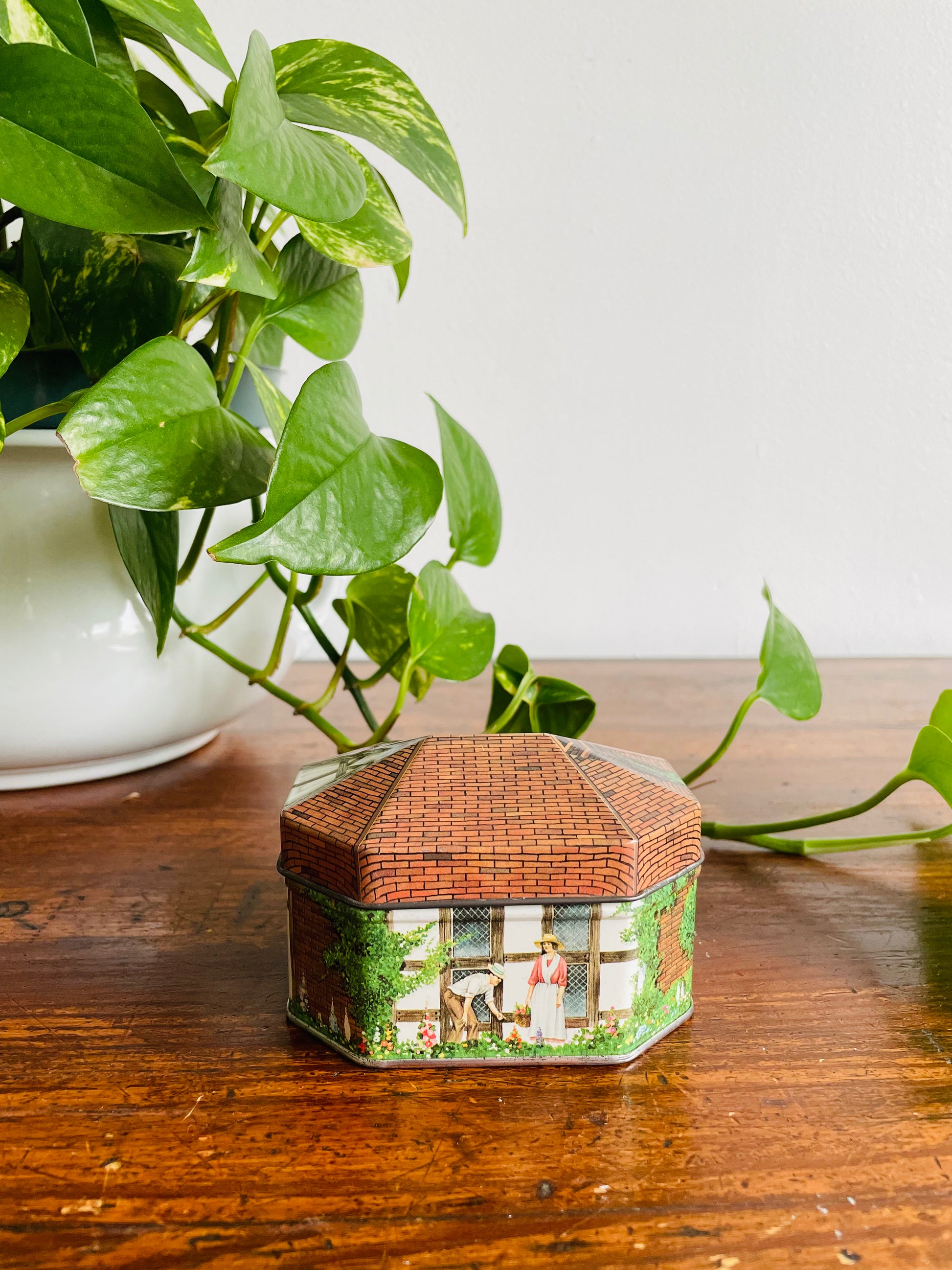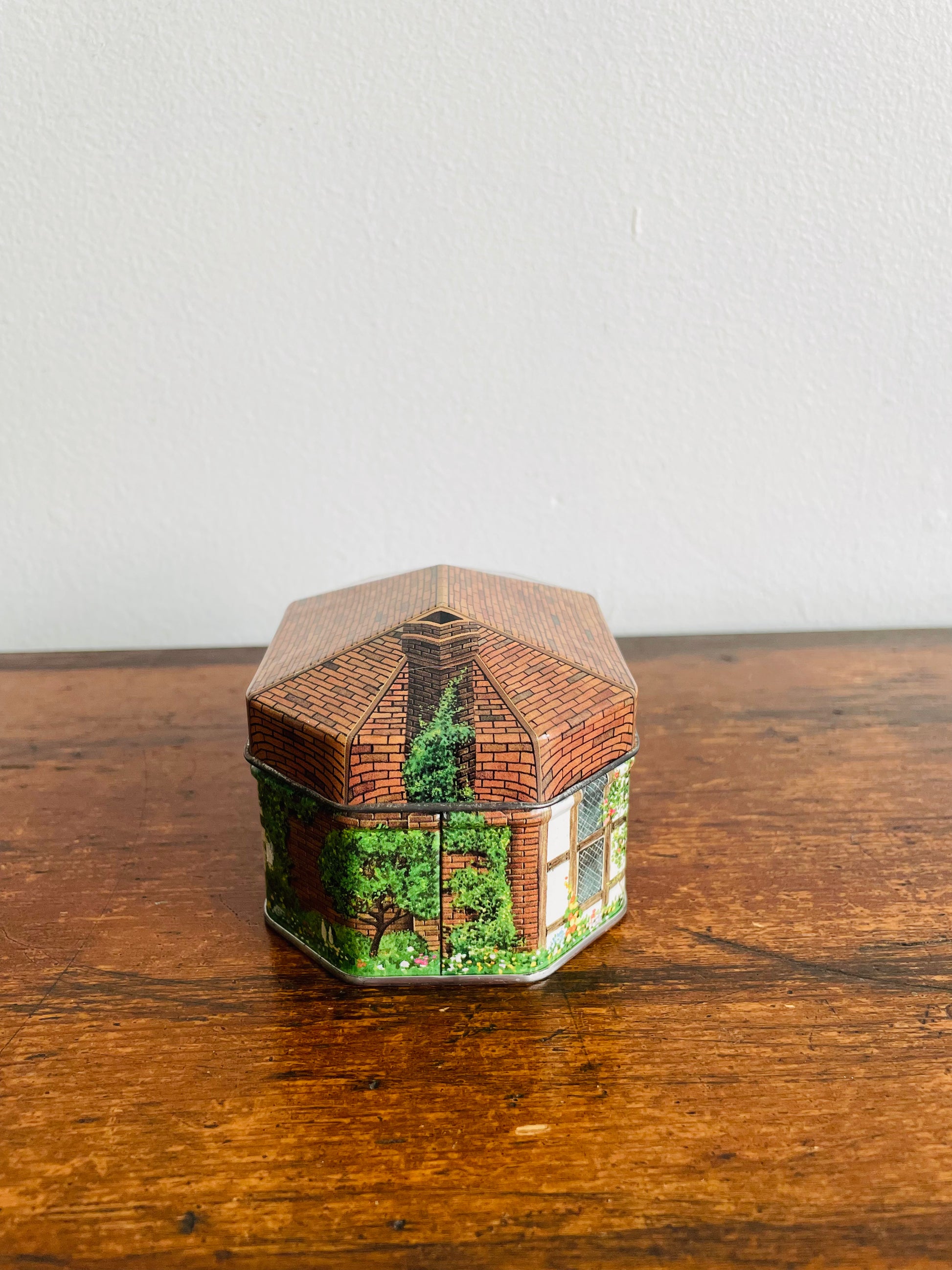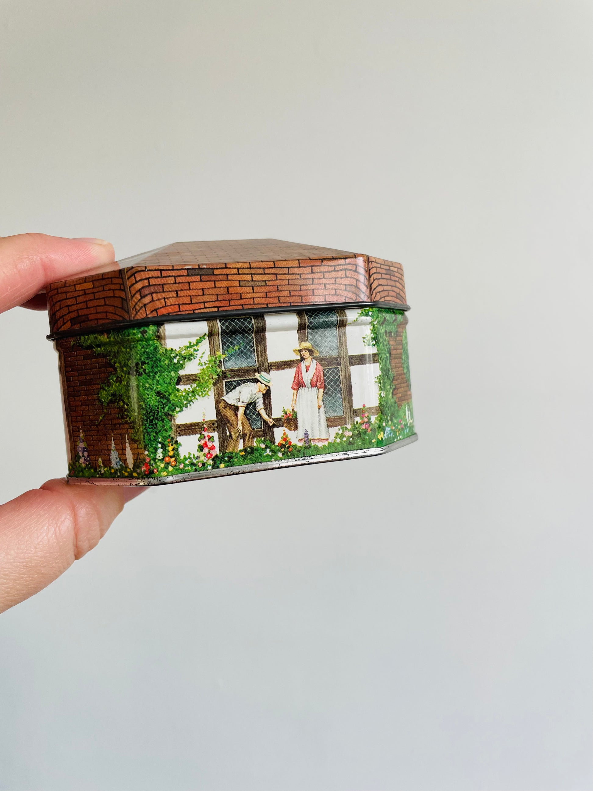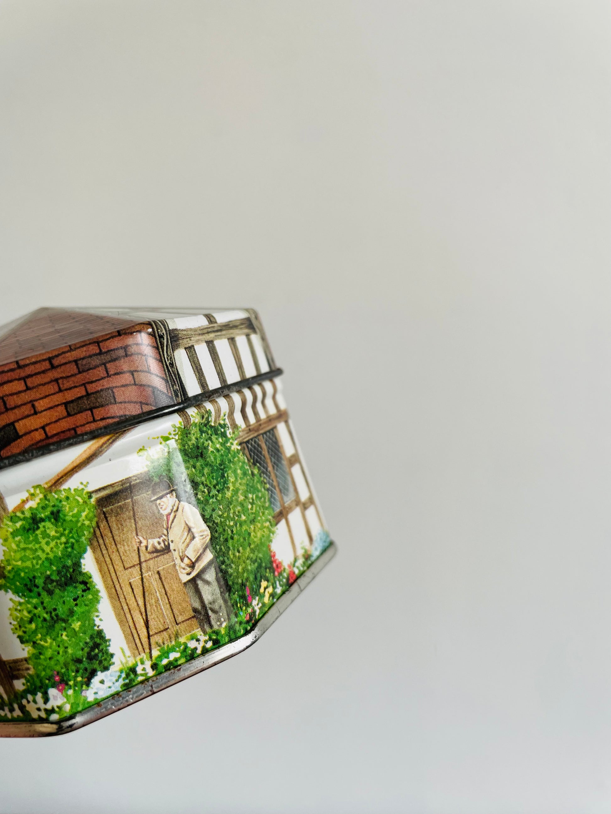 An adorable tin container shaped like a cottage. The lid comes off and is shaped like a roof. You can see two people gardening at the front of the cottage and a man with a walking stick at the side of the cottage.