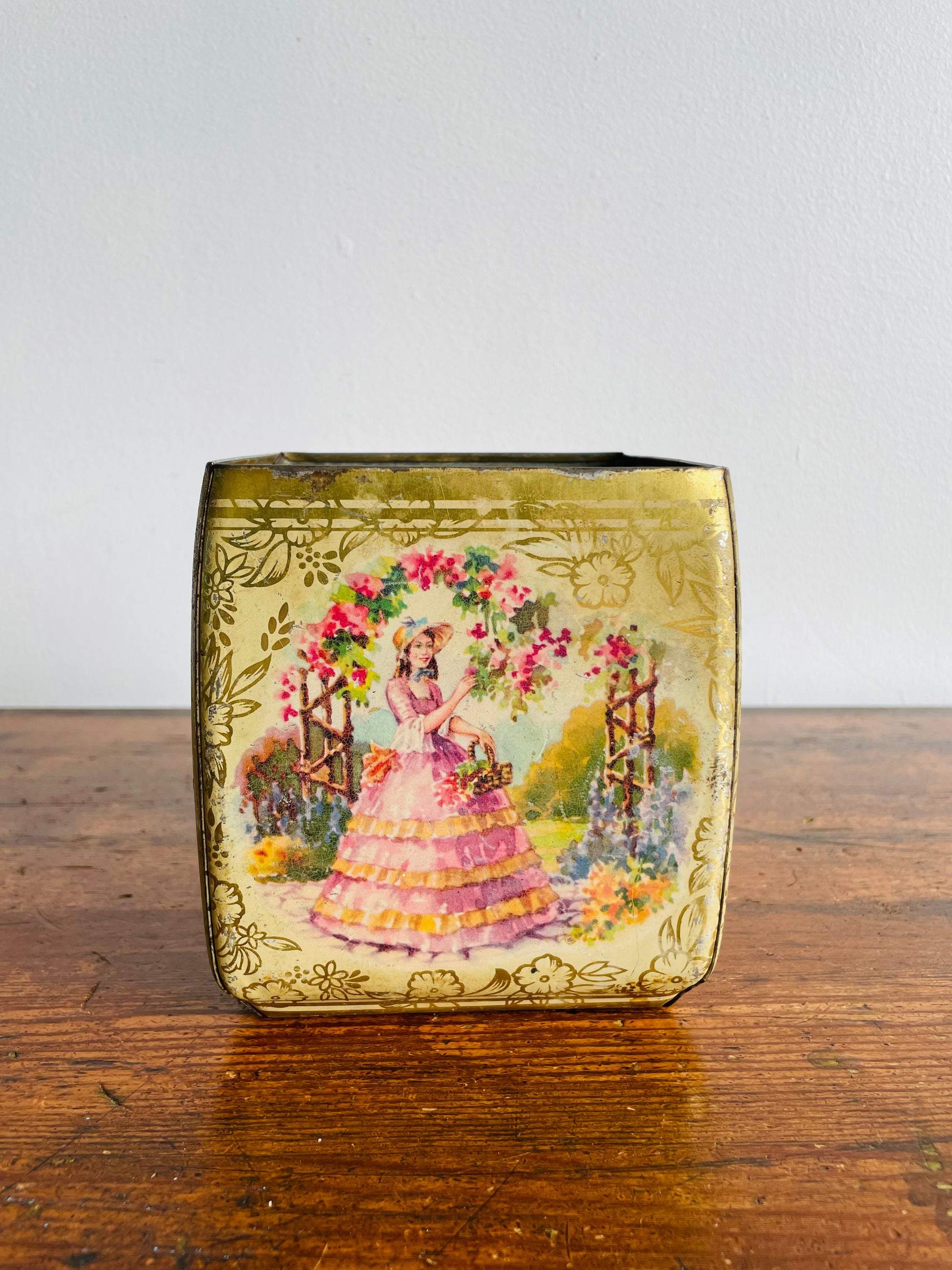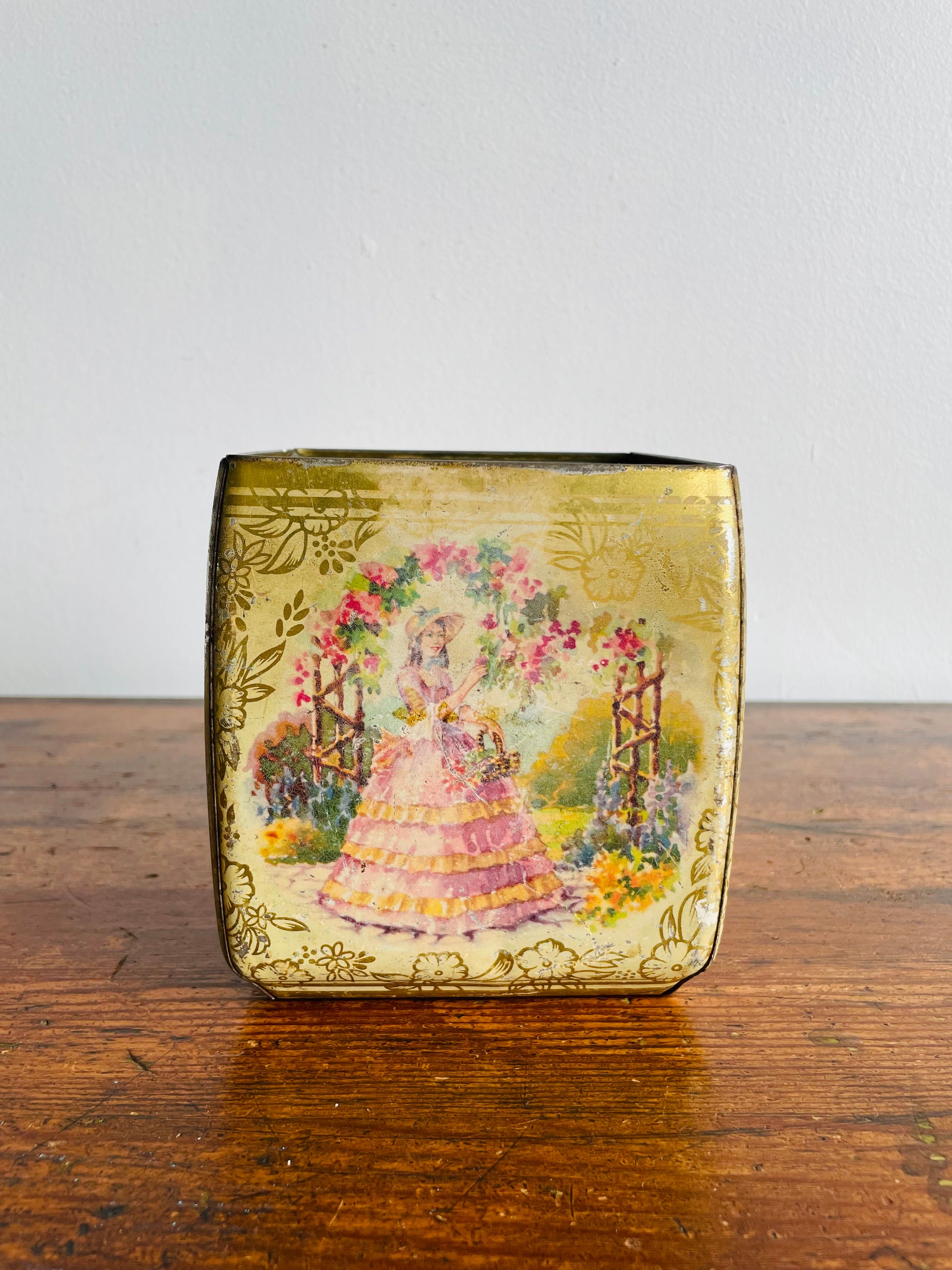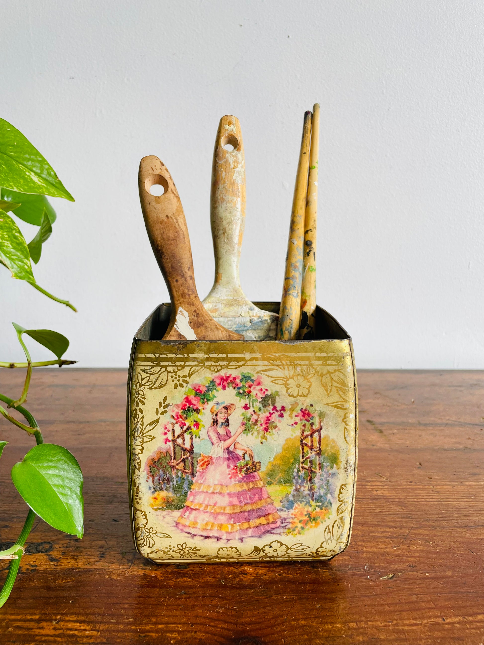 Pretty Toffee Candy Tin with Lady in Crinoline Dress - Made in England - Makes a Great Plant Pot or Utensil Caddy!