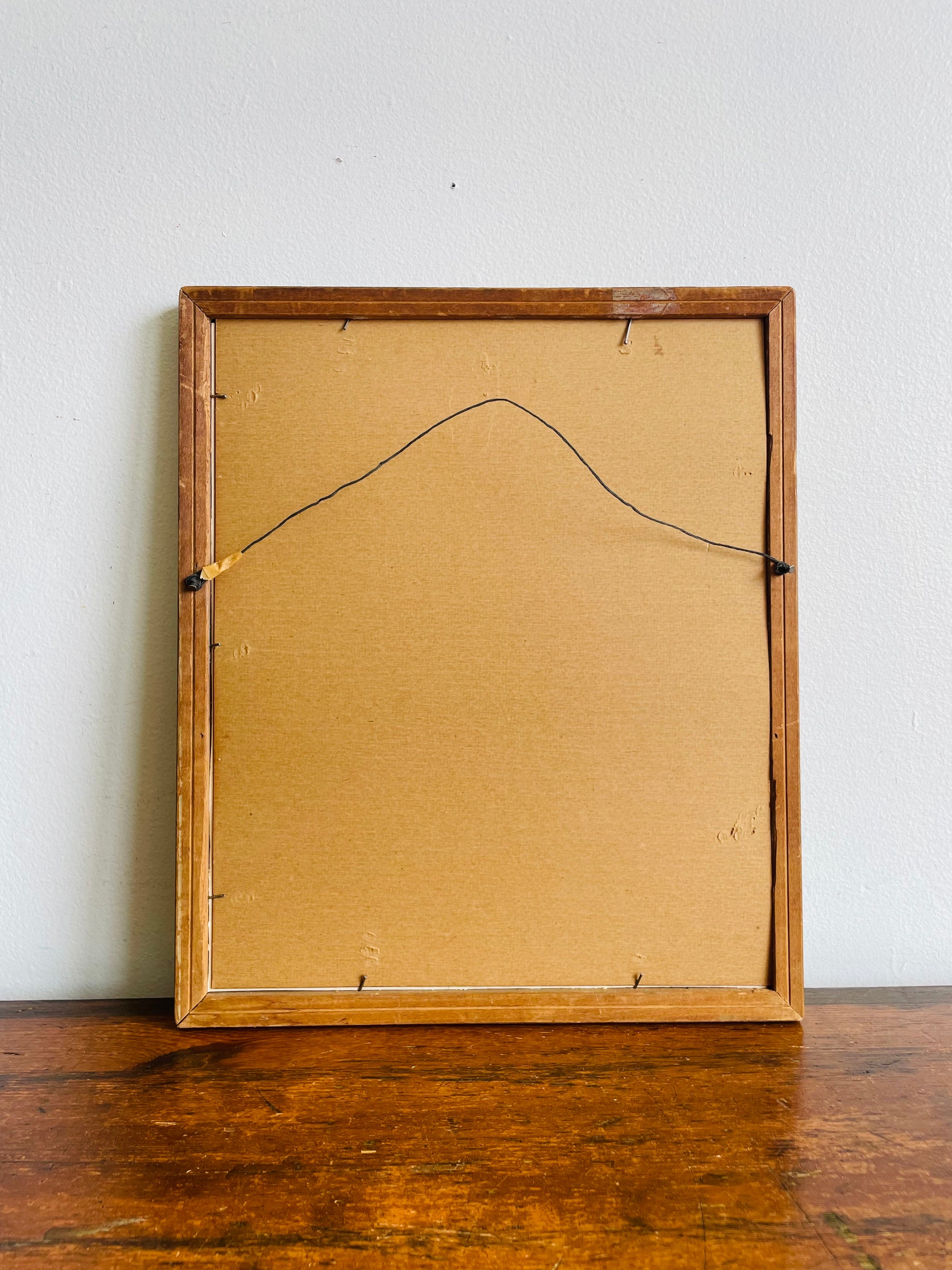 A beautiful print that looks like an etched book plate page. It sits in a dark green mat, behind glass, in a carved wood frame that has been painted gold. There is a wire on the back for hanging.
