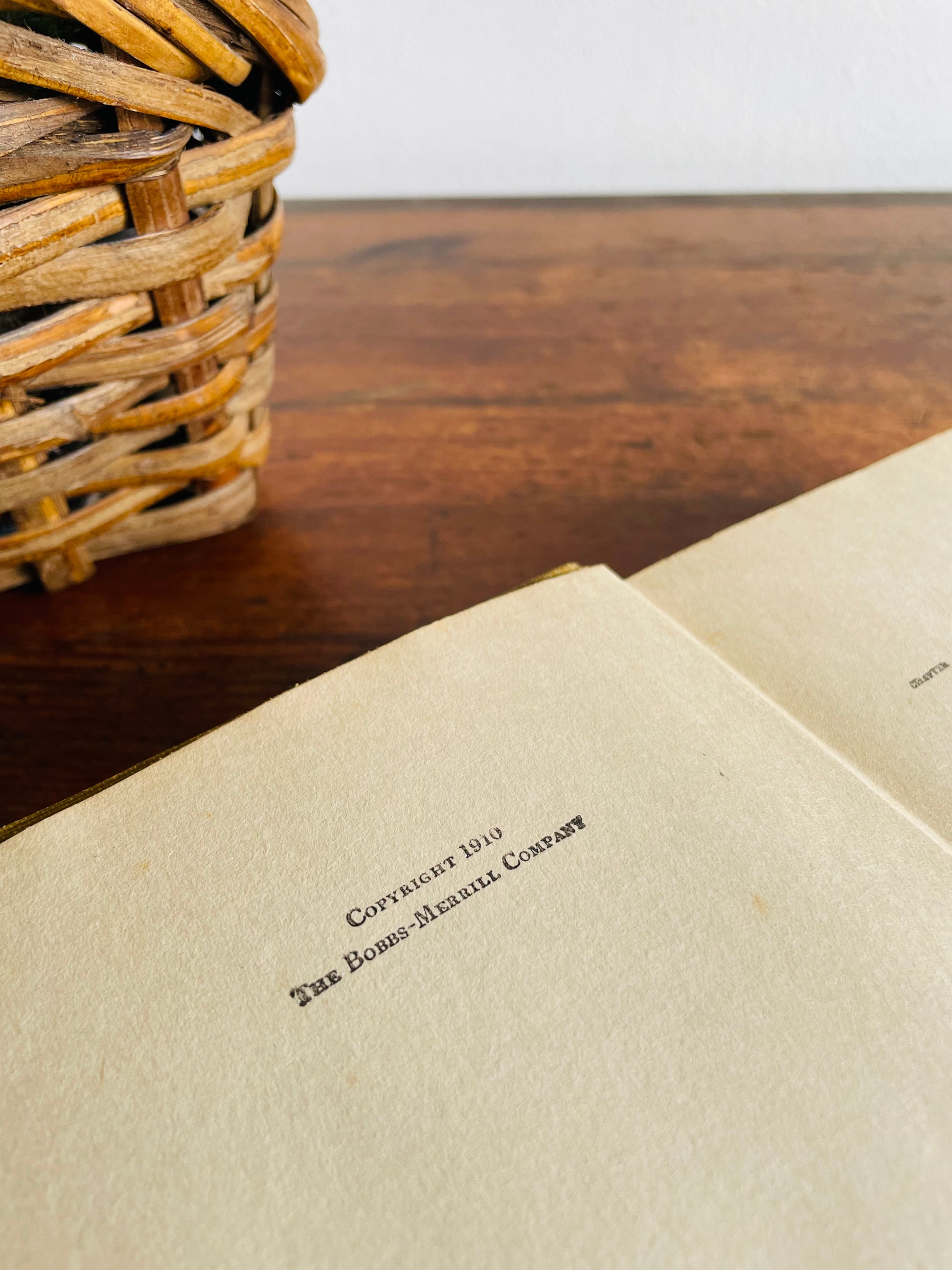 Clothbound hardcover with a paper print image attached to the cover. 1910. 306 pages.