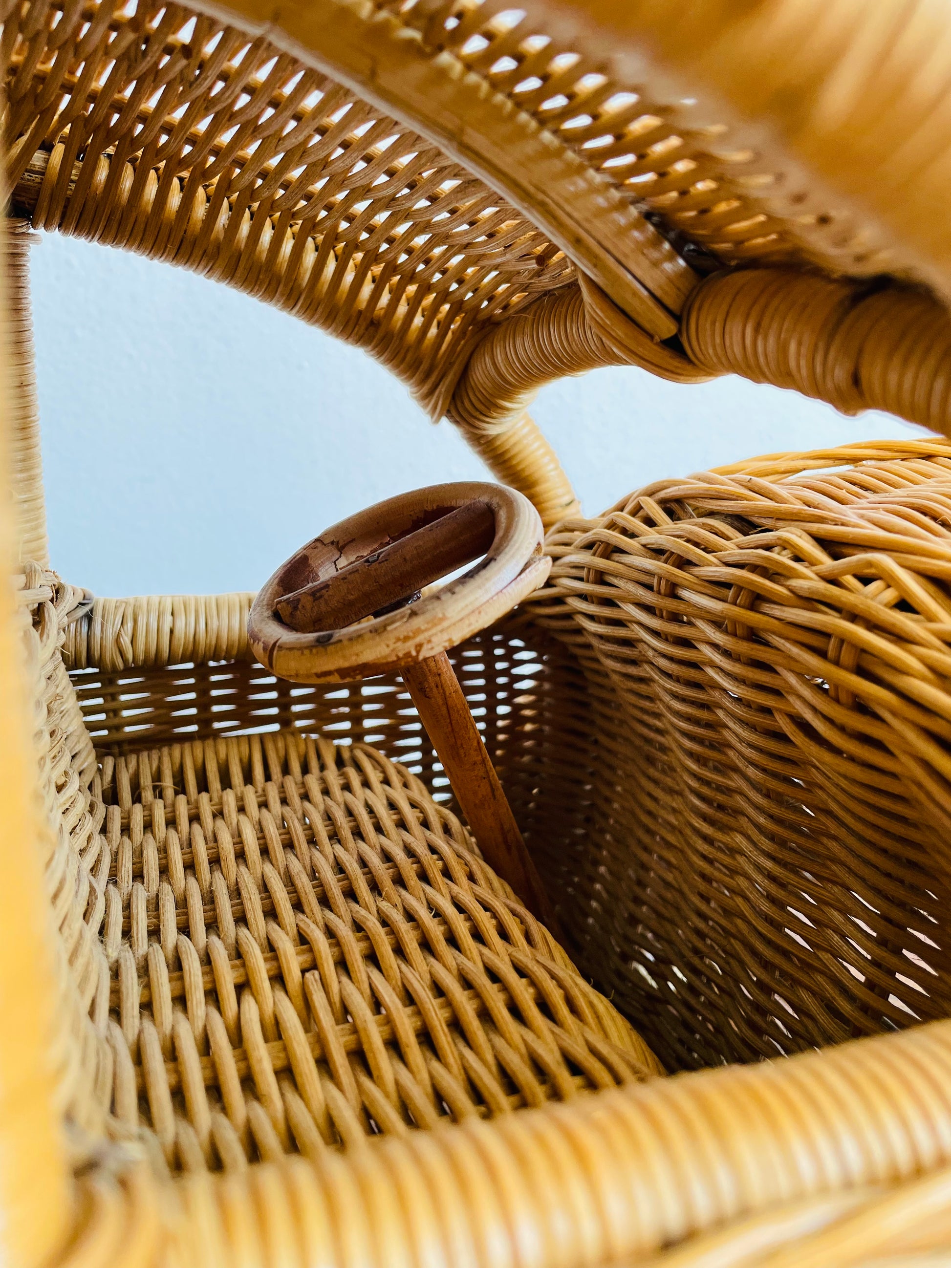 The structure is bamboo/rattan which has been wrapped in wicker and held together with nails. The wheels are on bamboo spokes and can rotate.