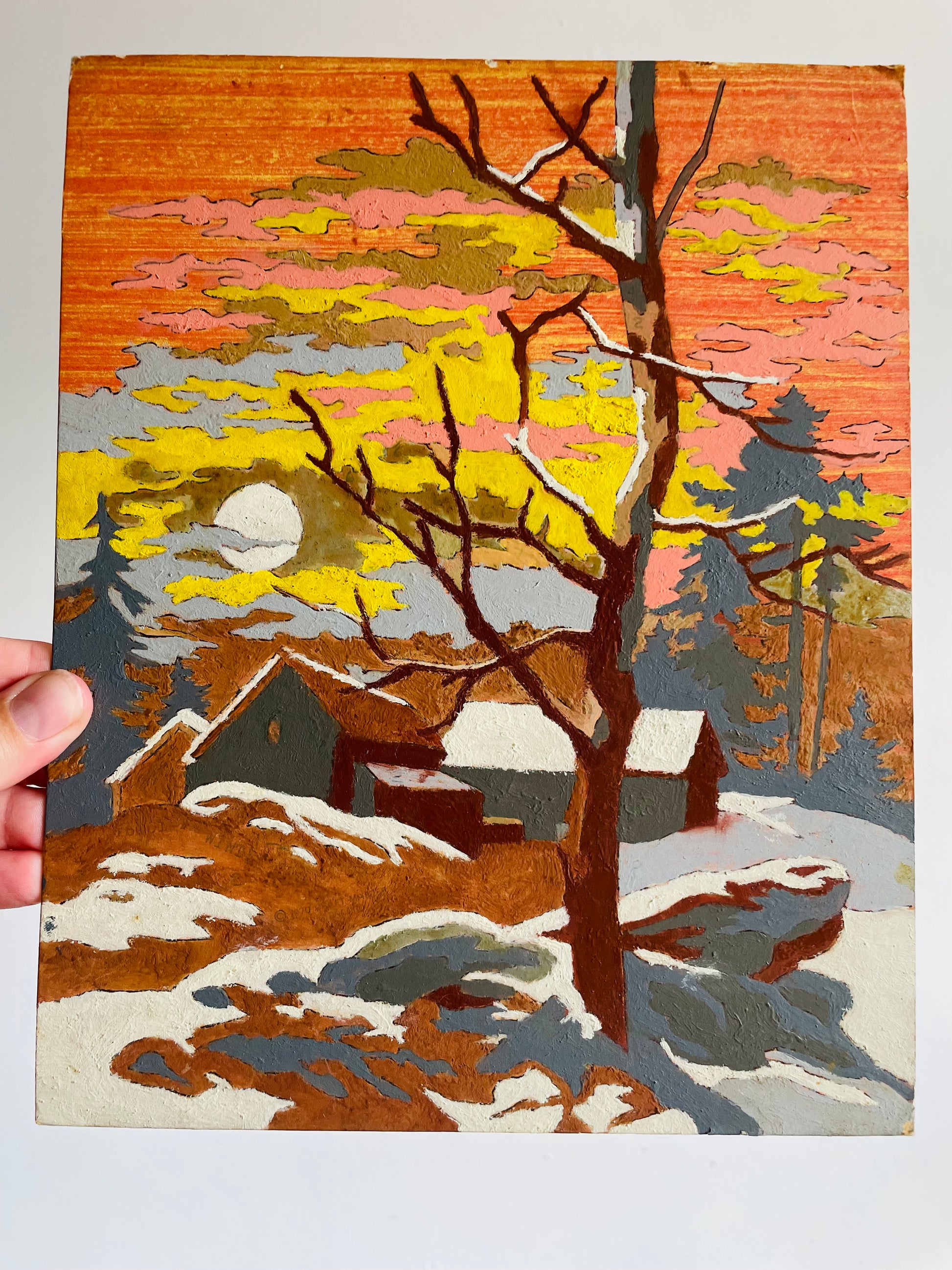Vintage 1960s Paint by Number (PBN) Picture on Board of Sunrise or Sunset Over Cabin in Forest - 8" x 10"
