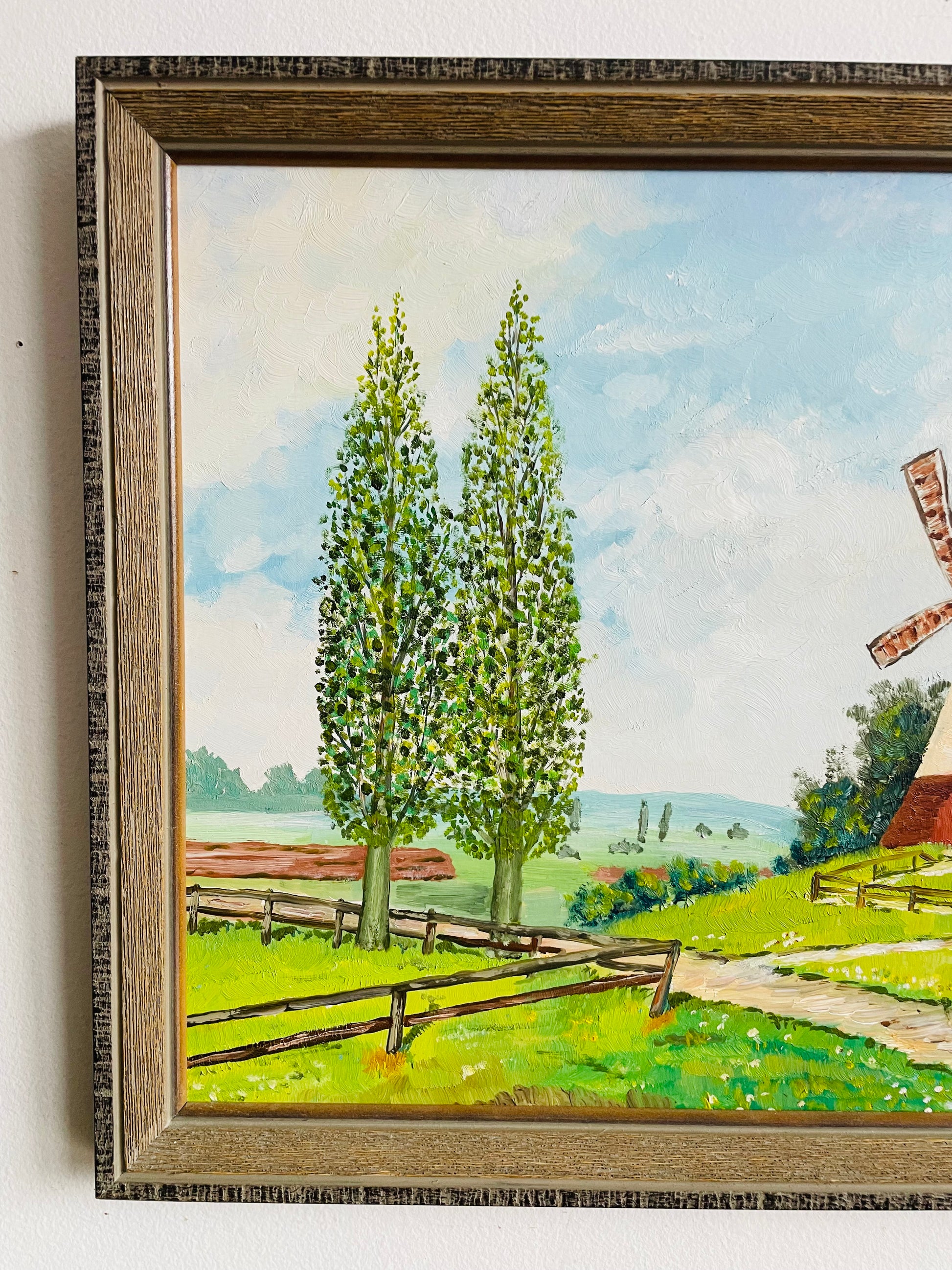Vintage 1982 Original Art Painting of Dutch Countryside Scene - Green Grass Meadow & Windmill Cottage - Artist Signed