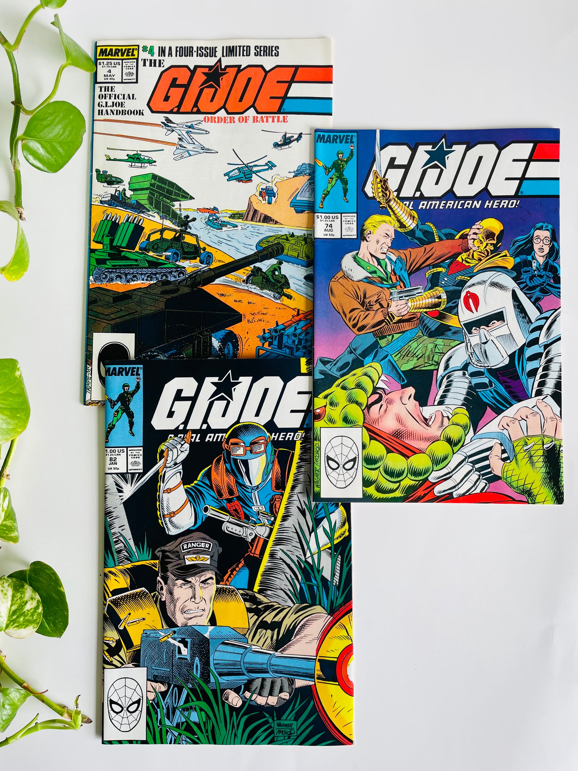 Vintage 1987, 1988, 1989 Marvel G.I. Joe Comic Book Bundle - Includes 3 Comics - Issue 4, Issue 74, Issue 82 - G.I. Joe Order of Battle The Official G.I. Joe Handbook