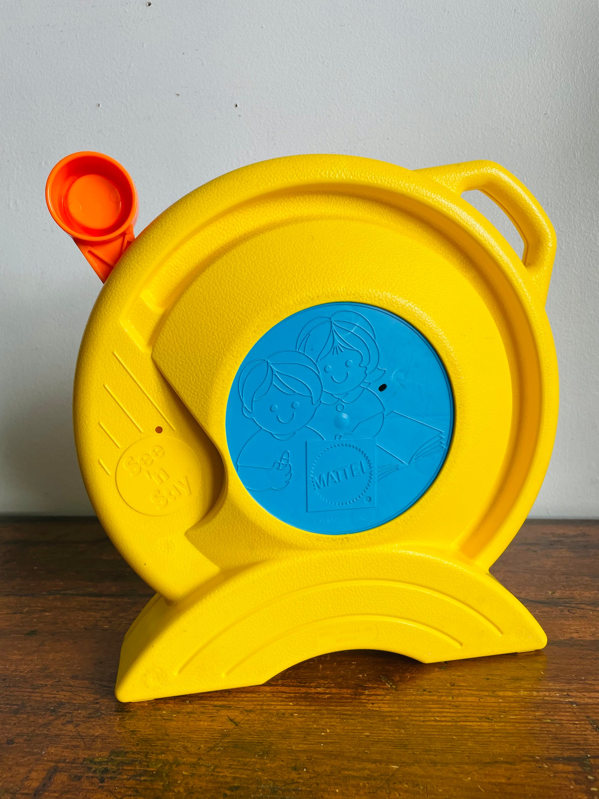 When you pull the lever on the side the centre arrow spins and lands on a number while talking. There is some wear to the sticker in the centre but it still works and is fine for playing.
