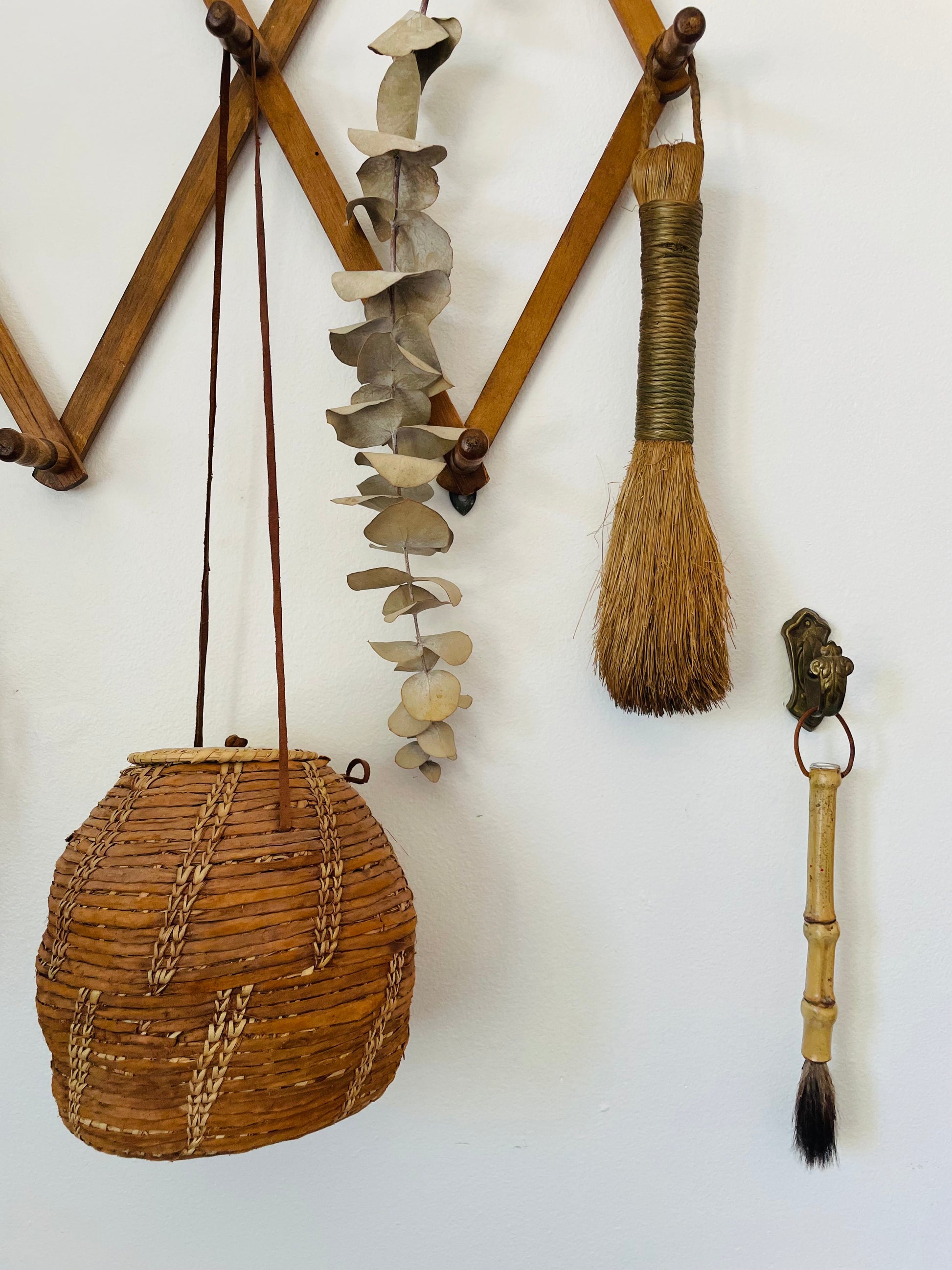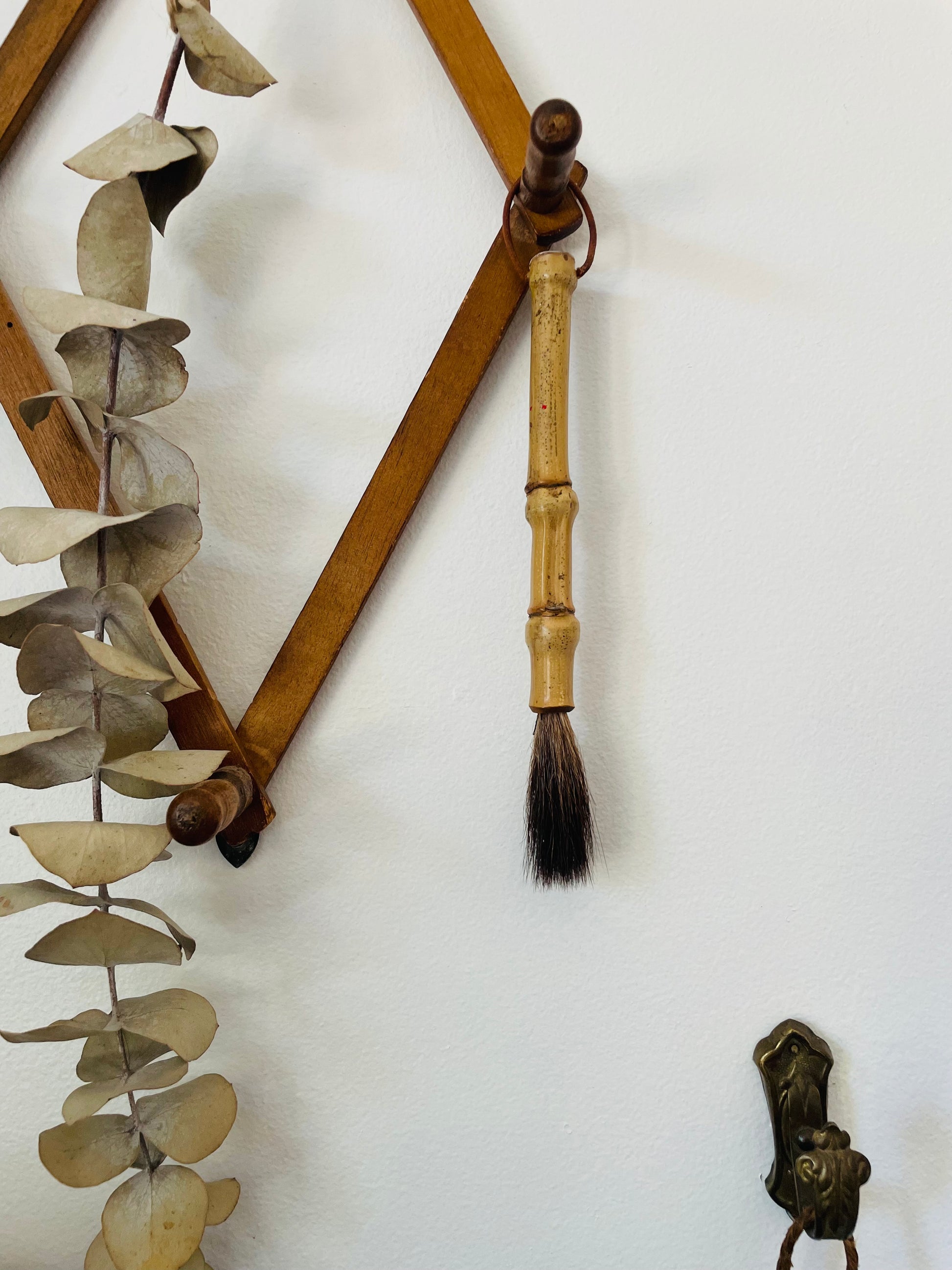 A calligraphy brush with a bamboo handle and a bristle that feels like it might be horse hair. There is a handle for hanging on one end that feels like it might be leather.