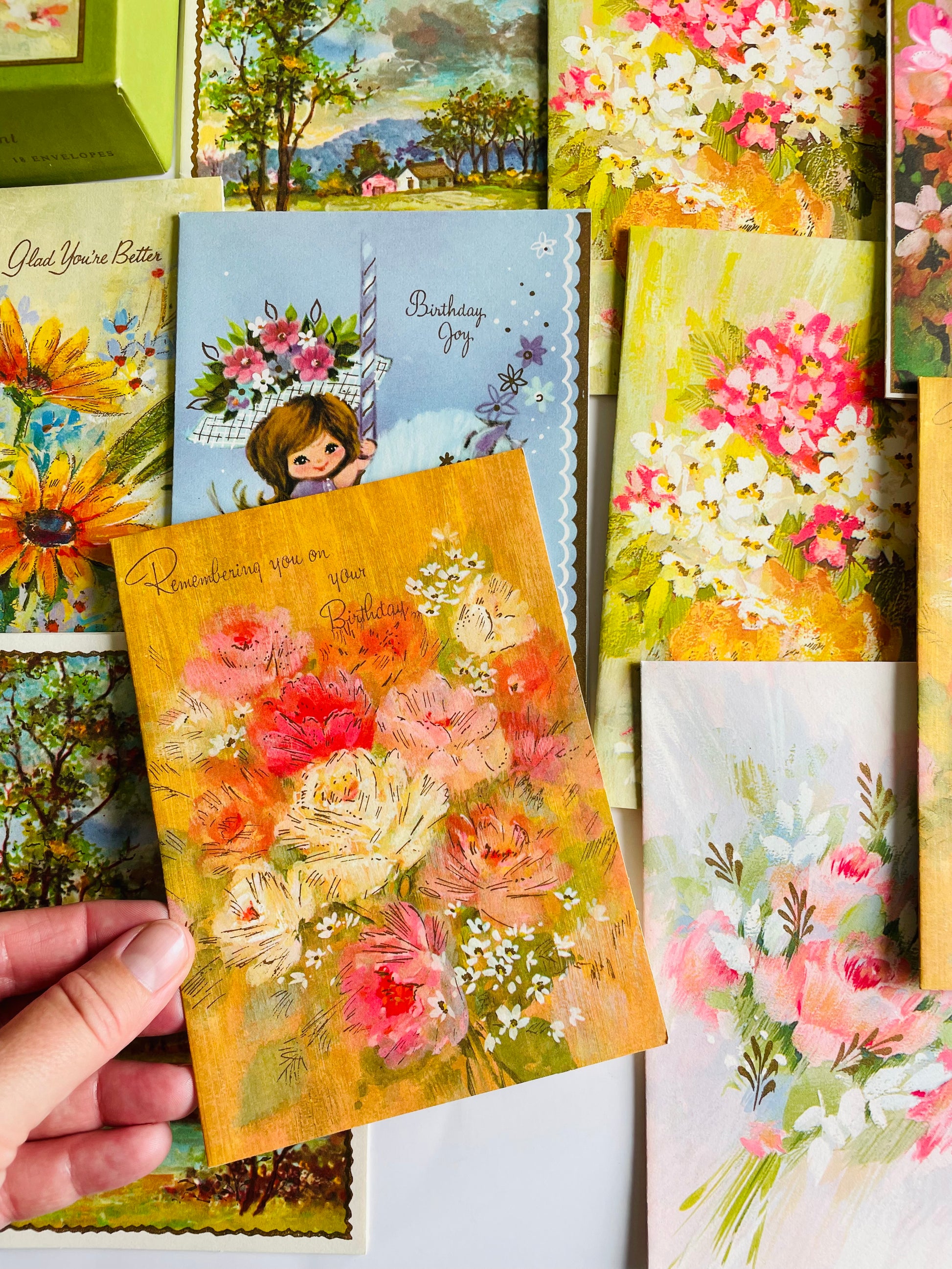 A collection of 15 bright and adorable cards. They include envelopes and a cardboard box for storage. They have different messages written inside, depending on the card. They are mainly birthday and get well wish cards.