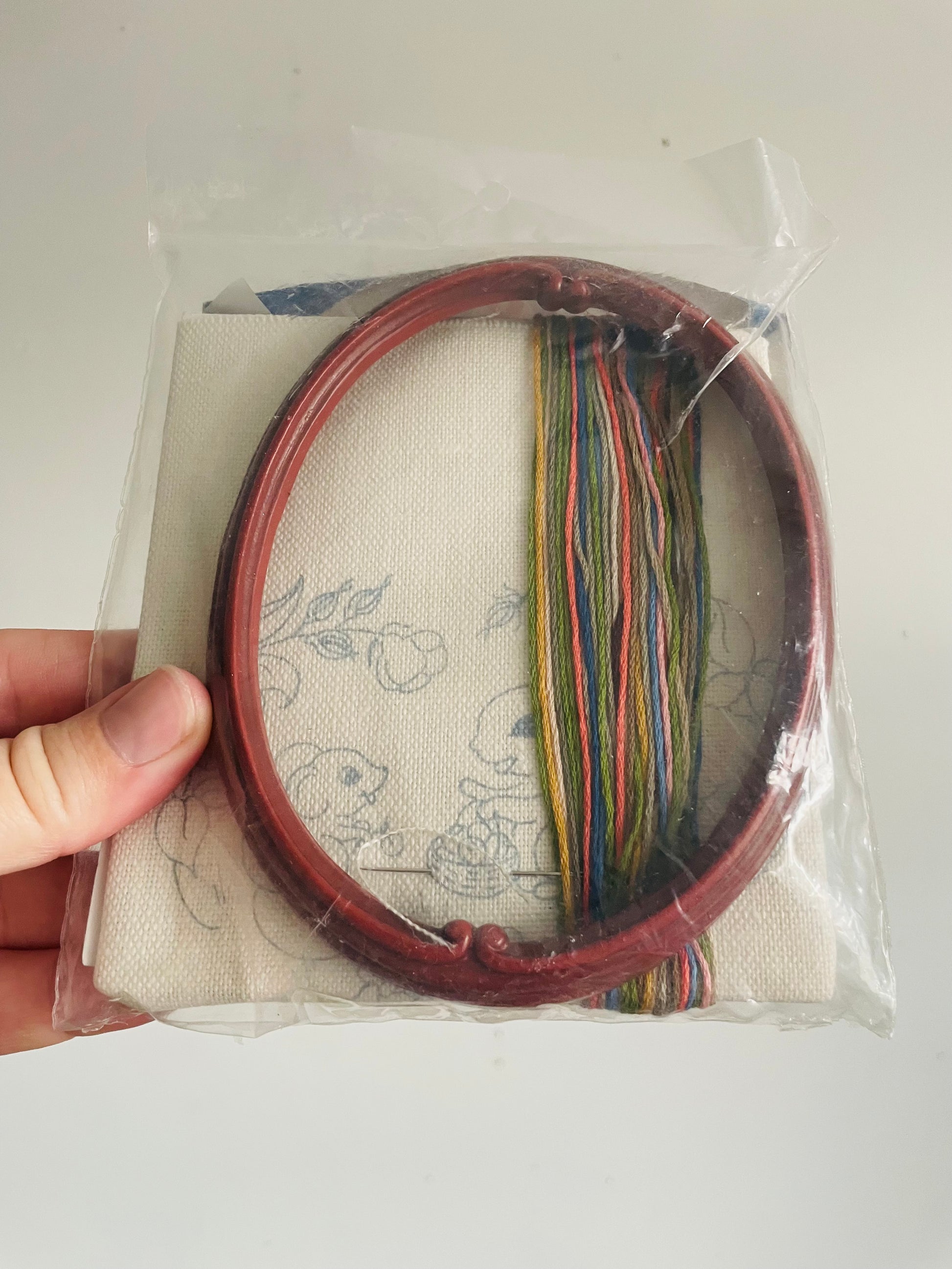 Brand new in the original packaging. Includes the frame and everything you need to complete the embroidery and then hang on the wall.