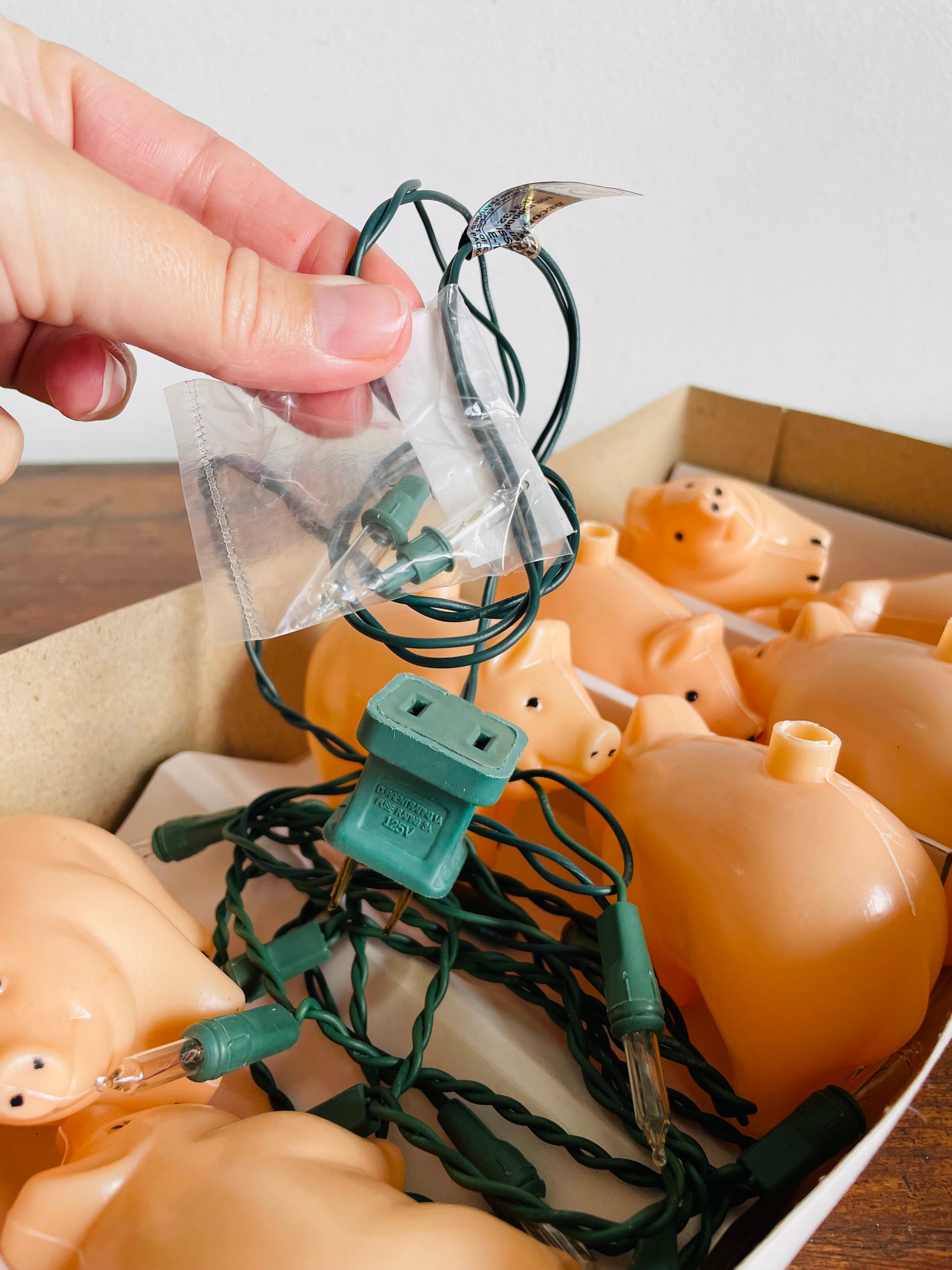 The pigs can attach to the bulbs to hang. There are some extra bulbs included in the box.