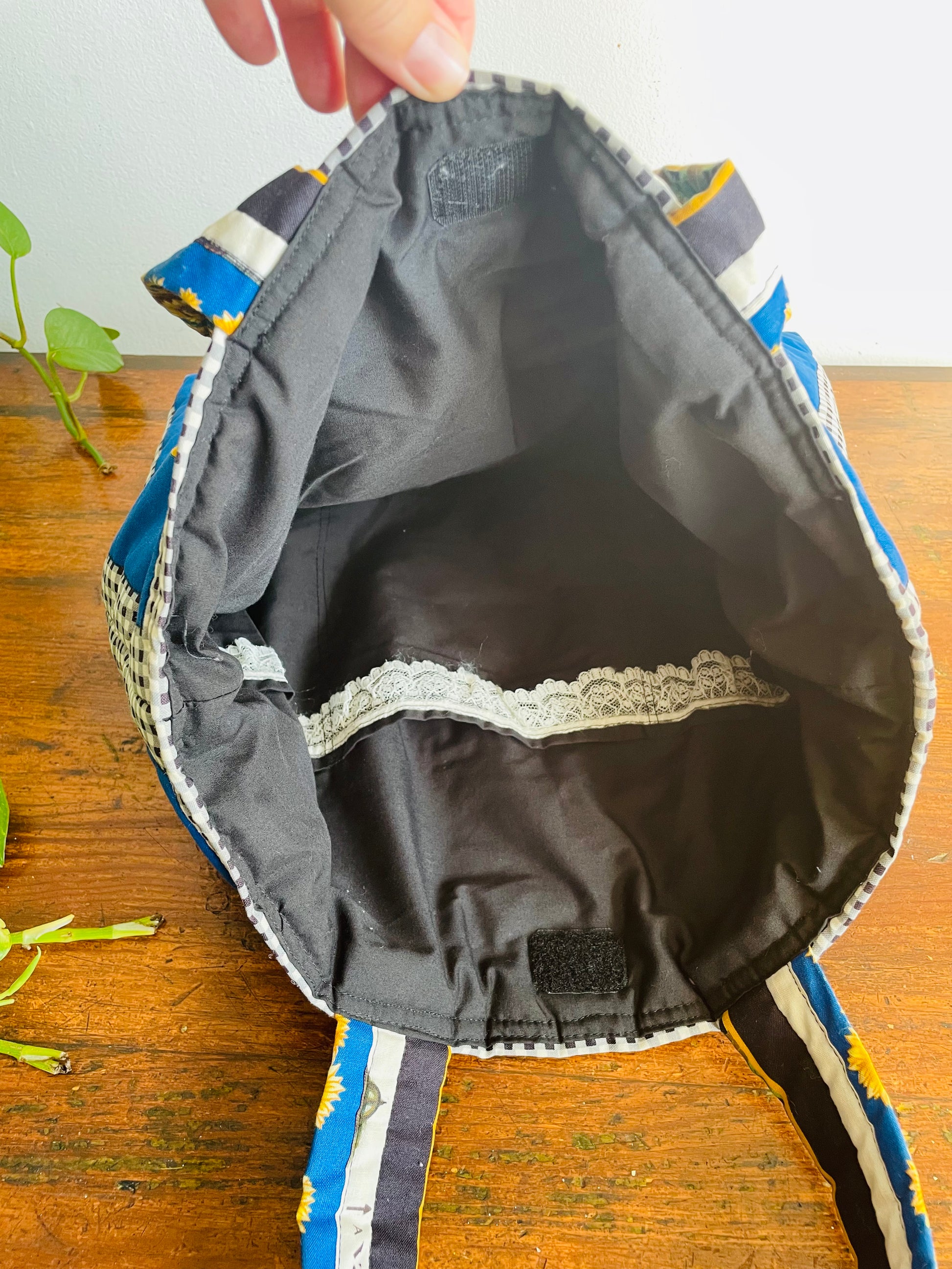 Super cute, bright, and cheerful! There is a Velcro patch inside the bag to keep the top closed. There is a pocket on one interior side that has been divided into three sections.
