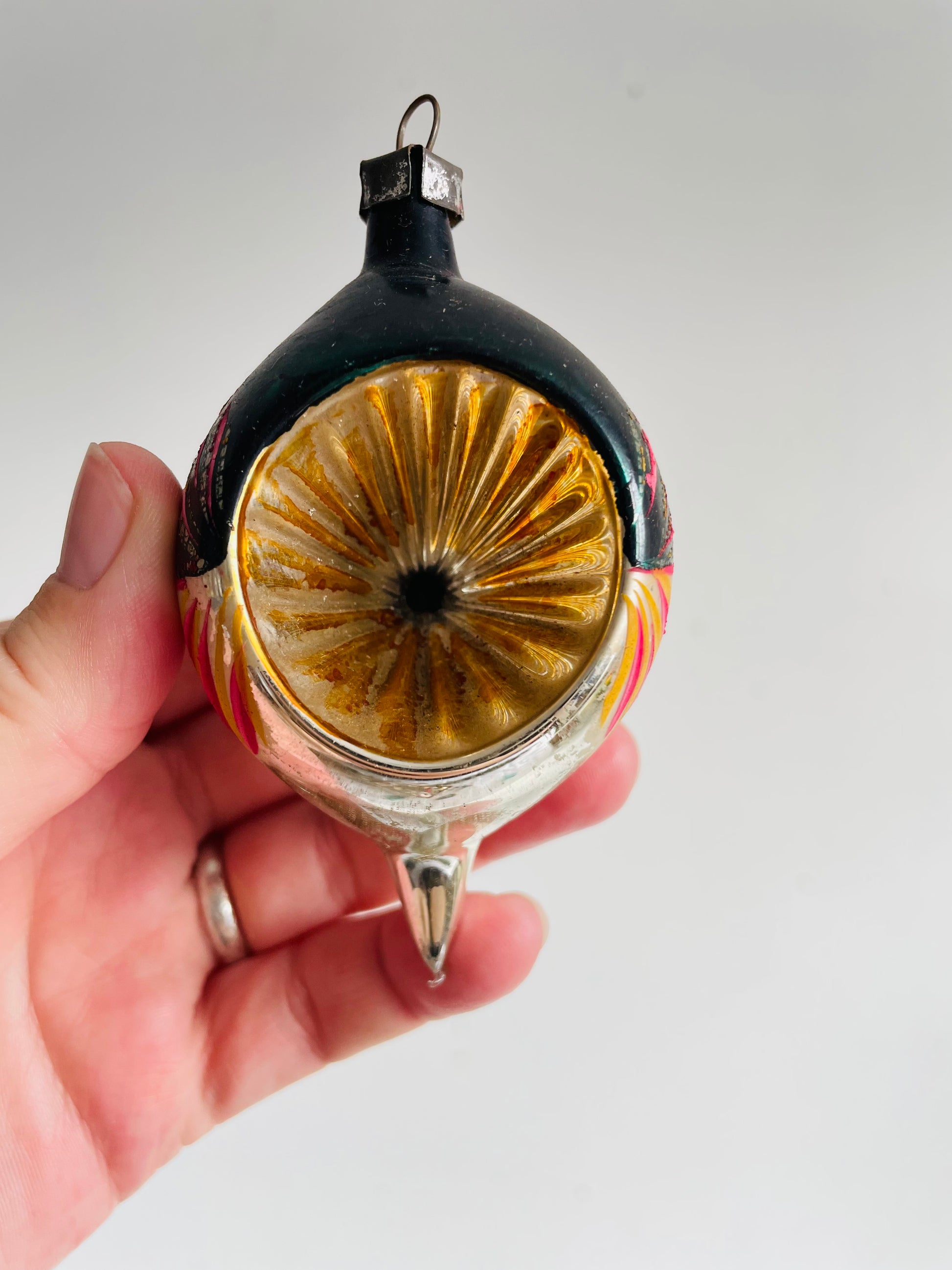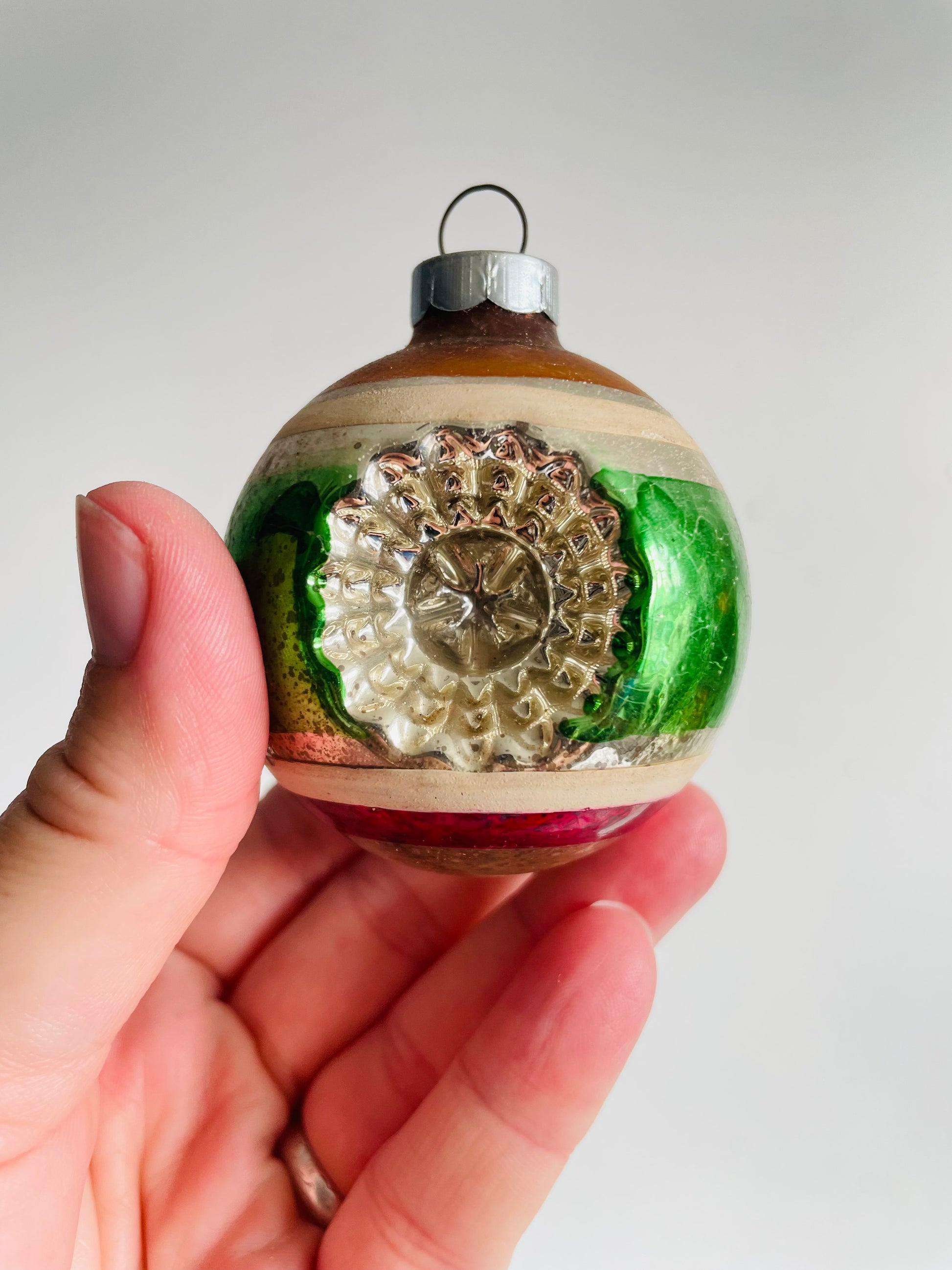 Vintage Collection of Mixed Glass & Indent Ornaments & Silver Tinsel in Divided Box #2 - Set of 10