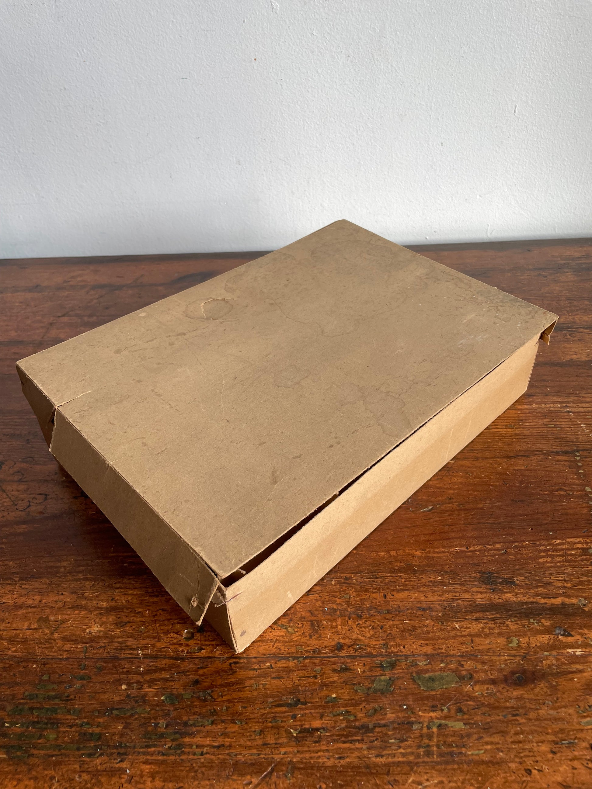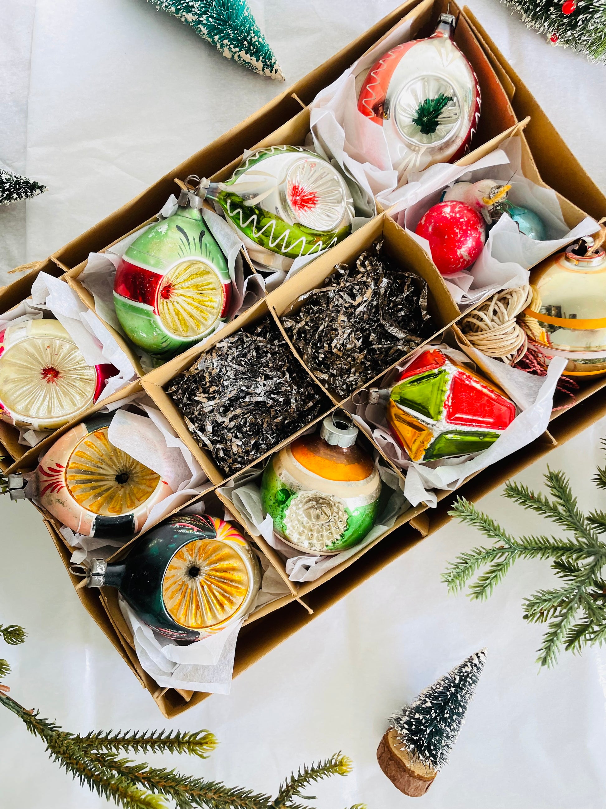 A collection of 10 ornaments in a divided cardboard box with lid. I put fresh tissue paper in the box to nest the ornaments in.