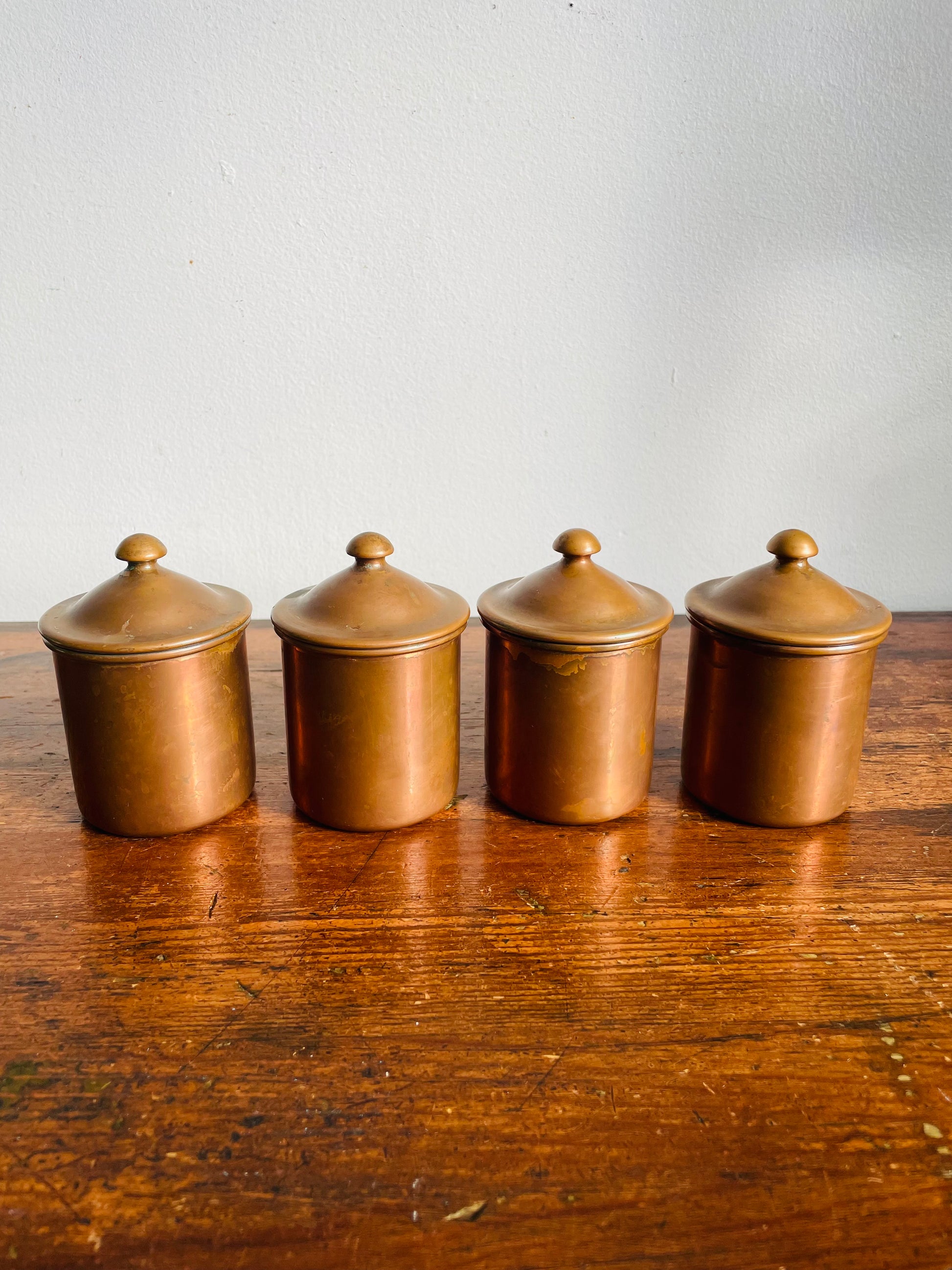 A collection of four copper canister jars. These would be great as decor, for spices, or at a coffee station! You could also use them in a bathroom to hold cotton swabs, Q-Tips, etc.