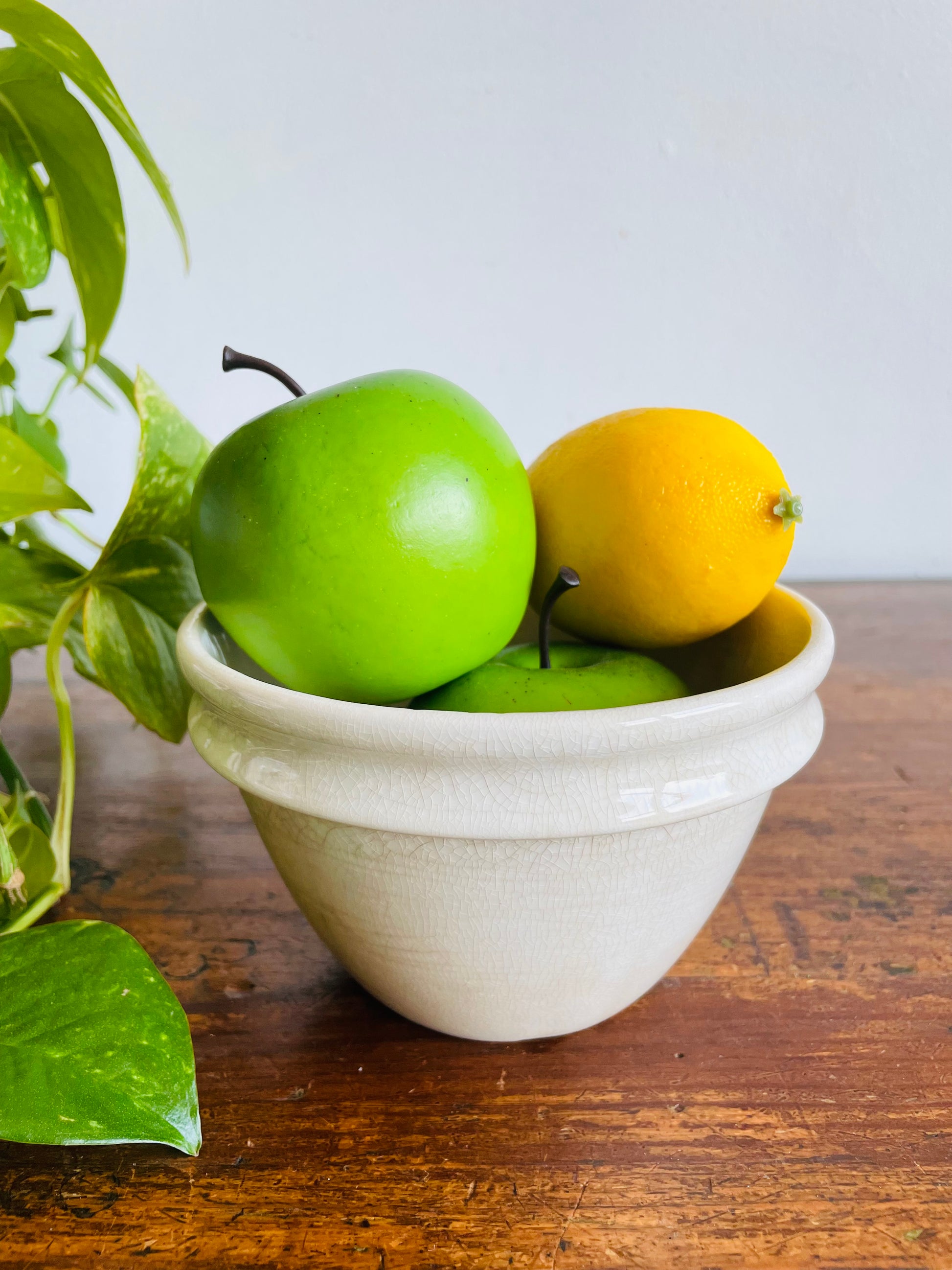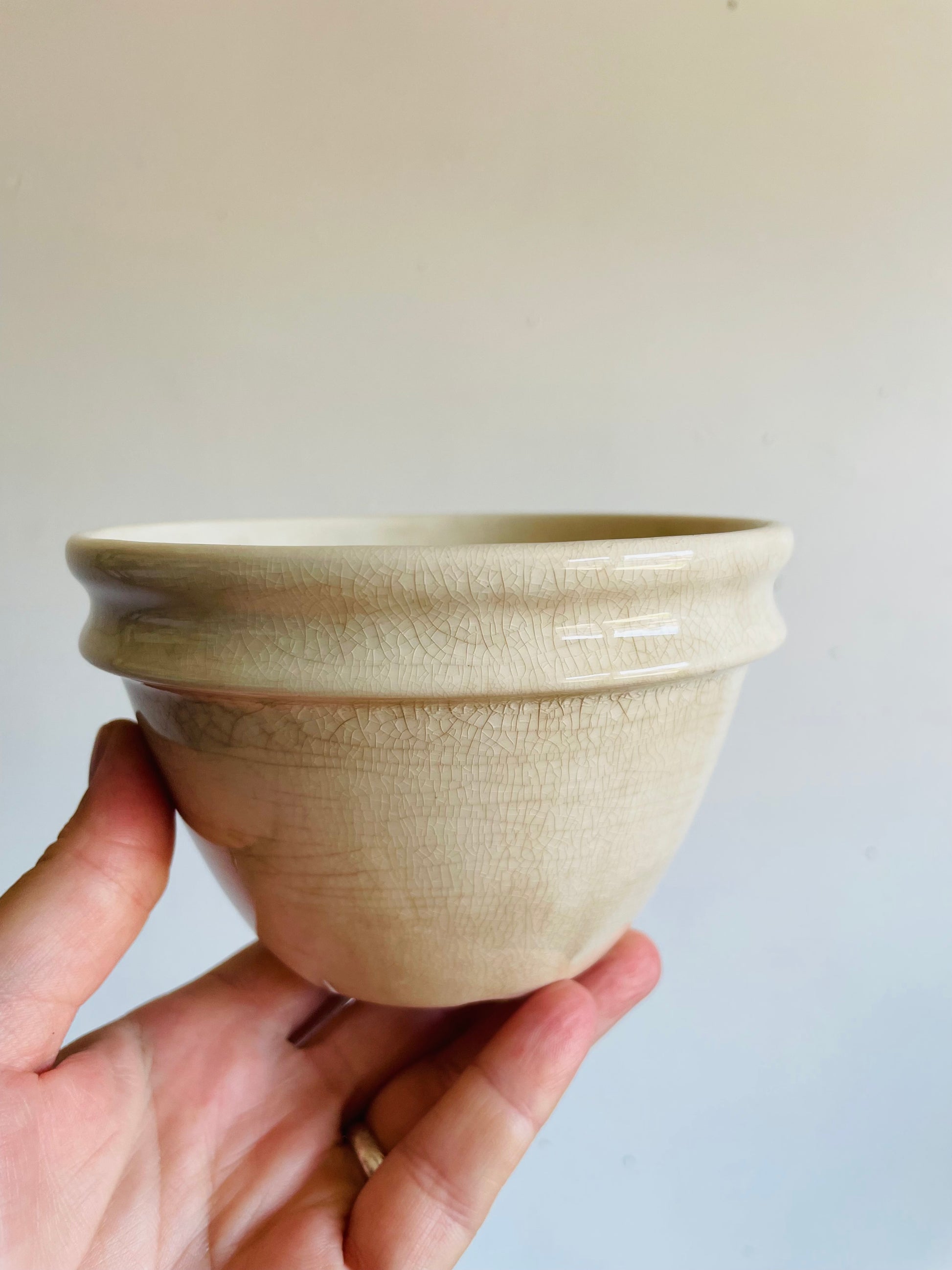 A very aged and crazed pudding bowl with some charm and patina to it! It would look great on display as-is, as a planter bowl, with some greenery/berries/a white pillar candle, etc.