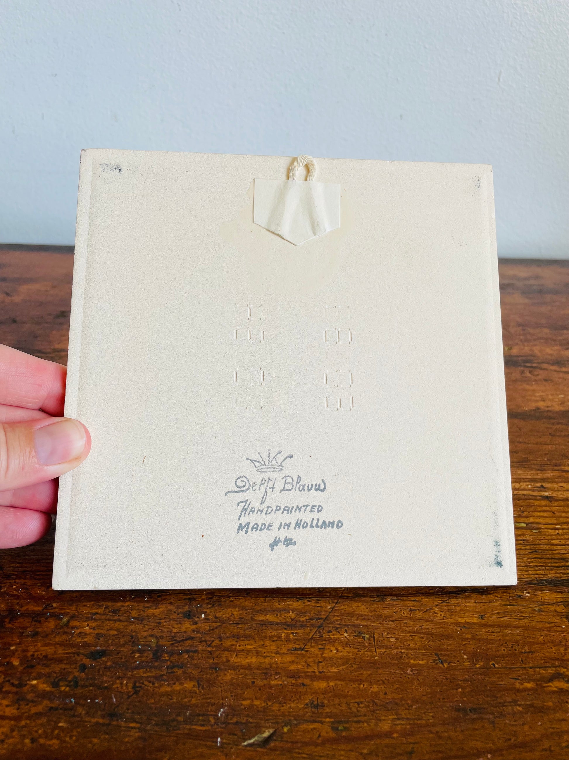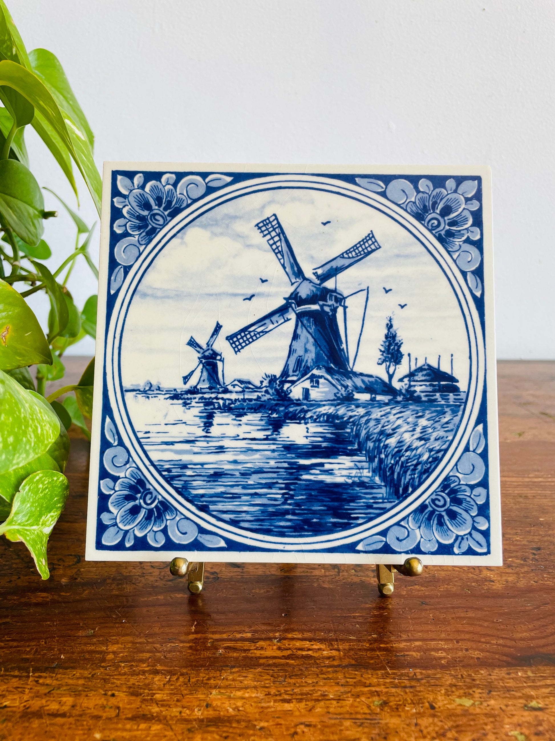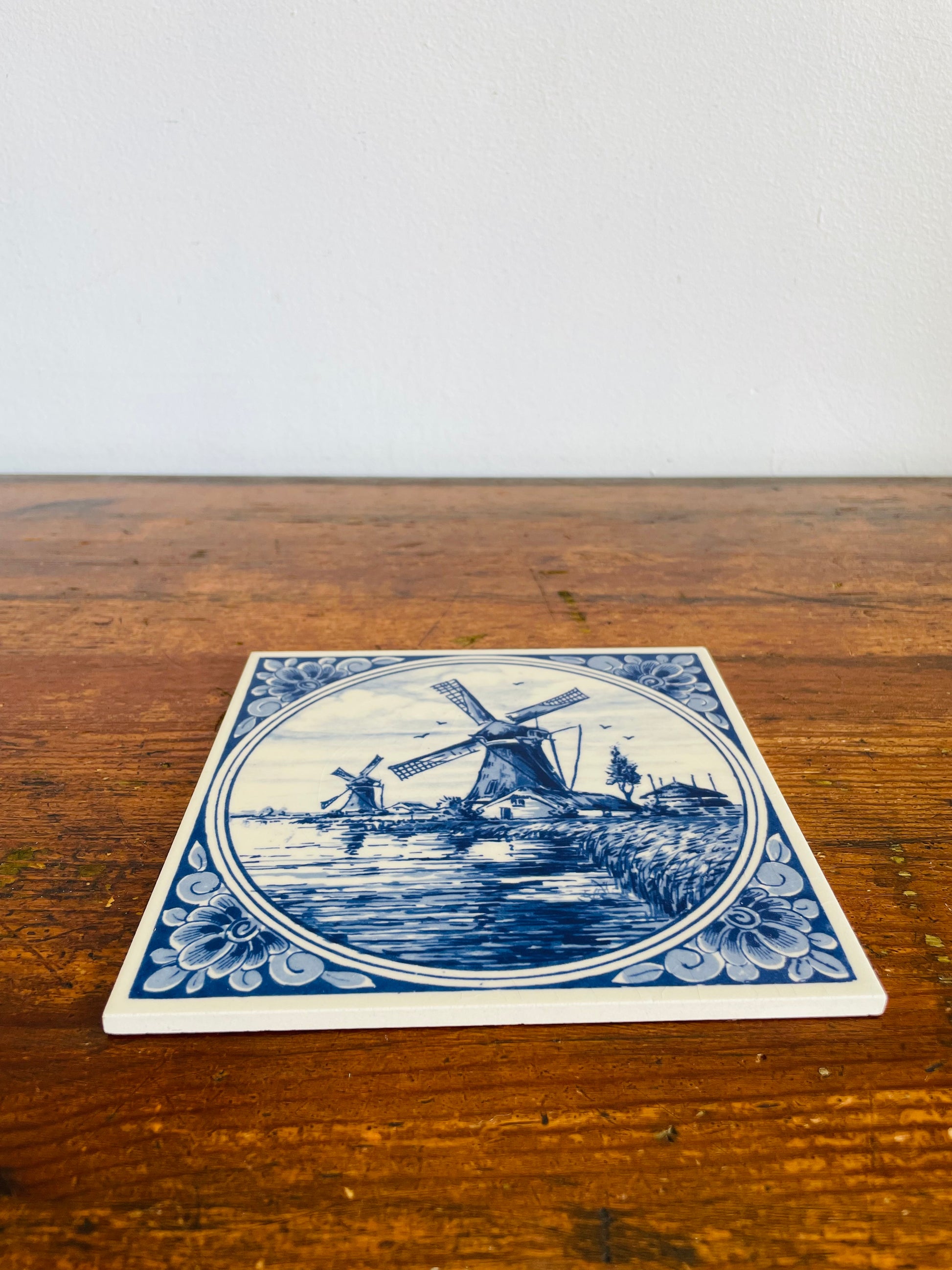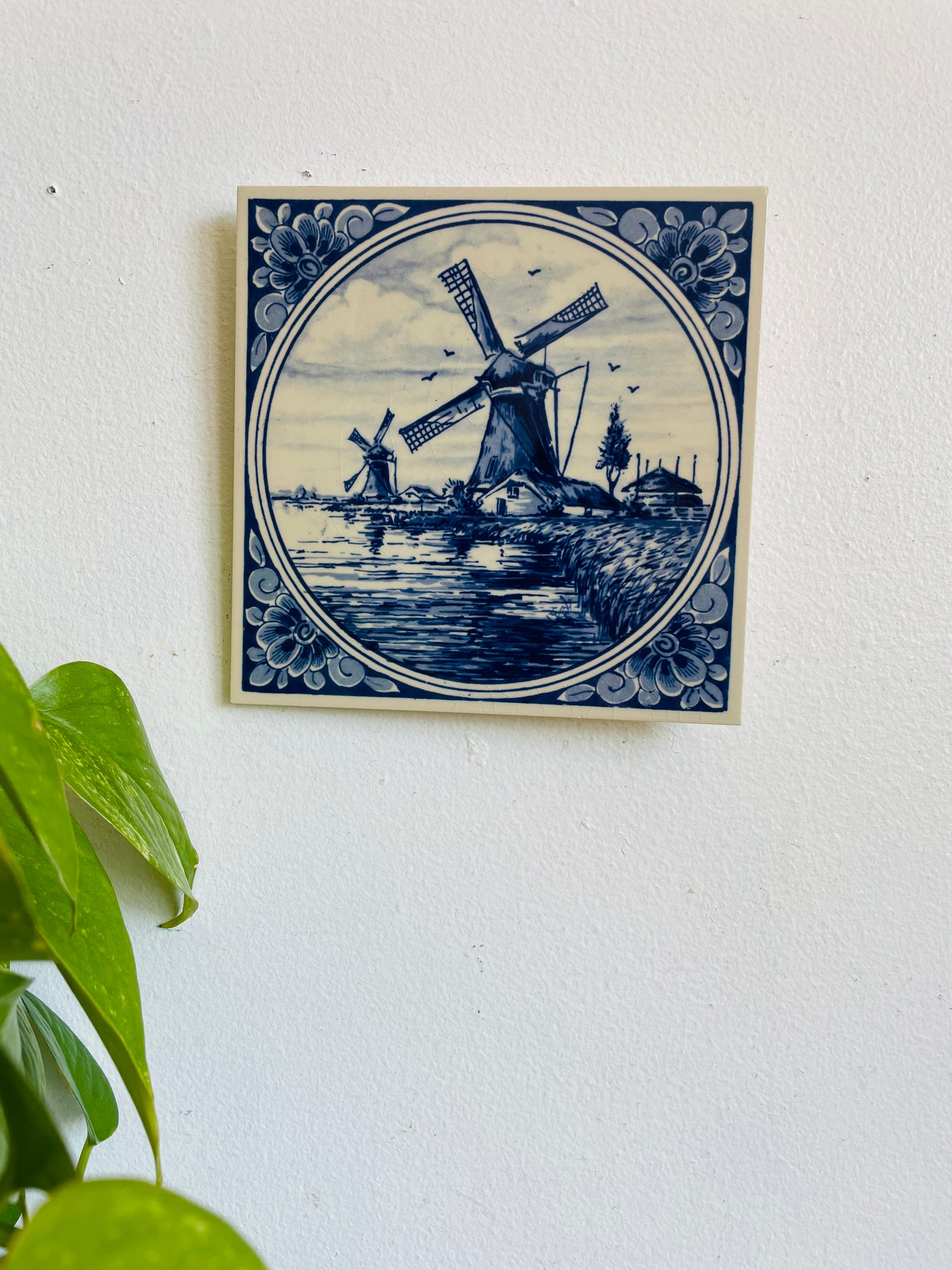 Vintage Delft Blue Dutch Windmill Hand Painted Tile - Can Hang on Wall - Made in Holland