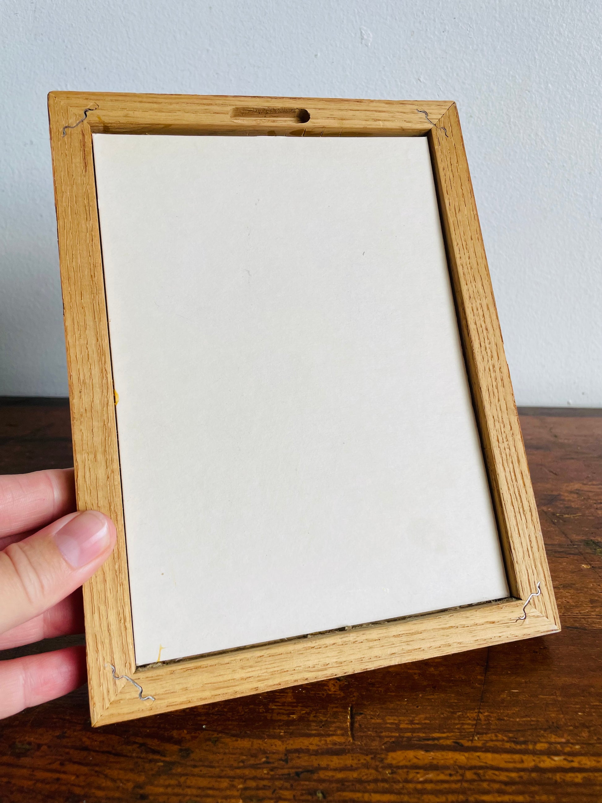 An adorable embroidery which sits in a wood frame. There is a hole on the back for hanging.