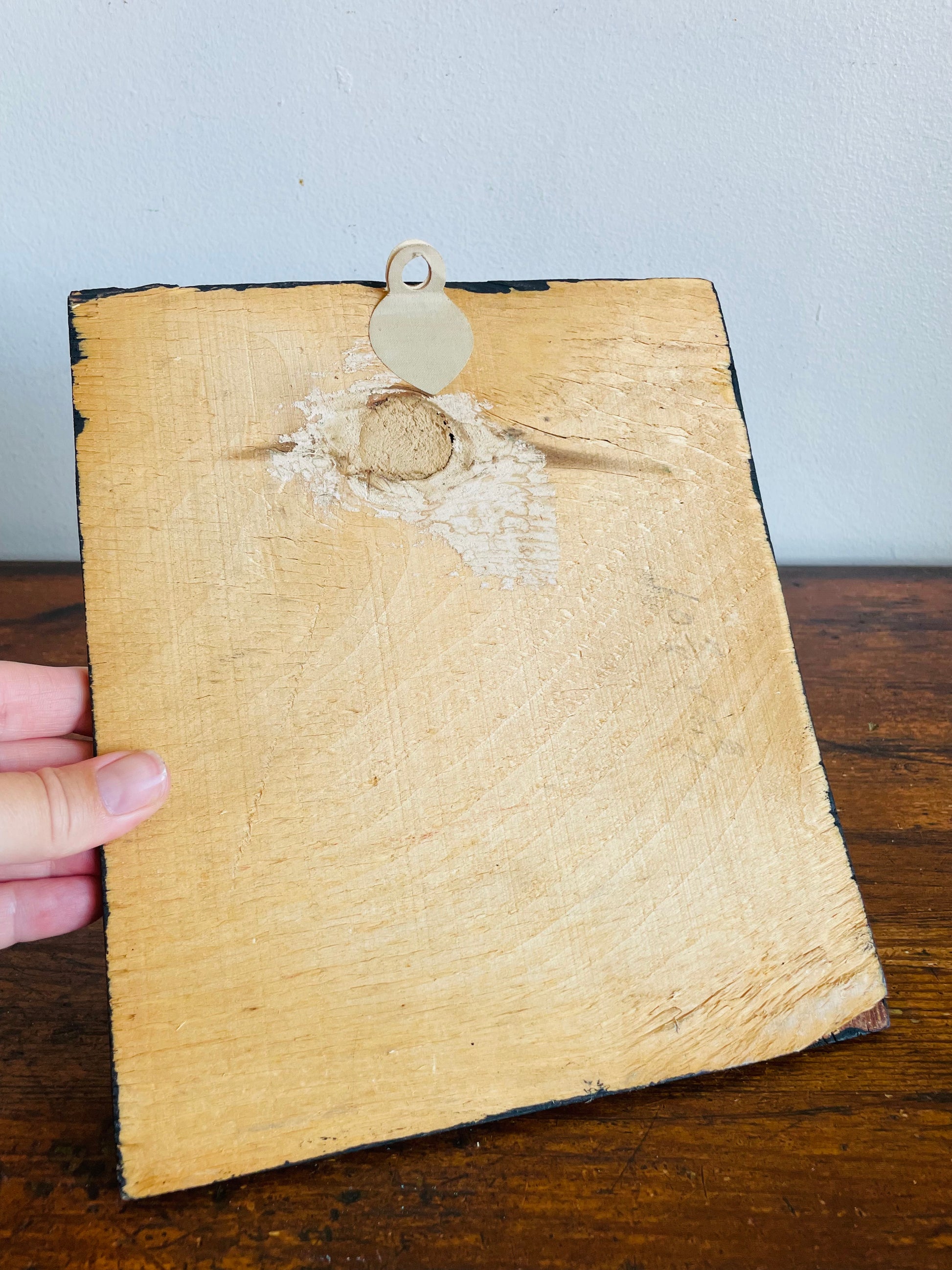 Wood that has been painted black and has an embossed copper scene on it. There is a hanger at the top for hanging.