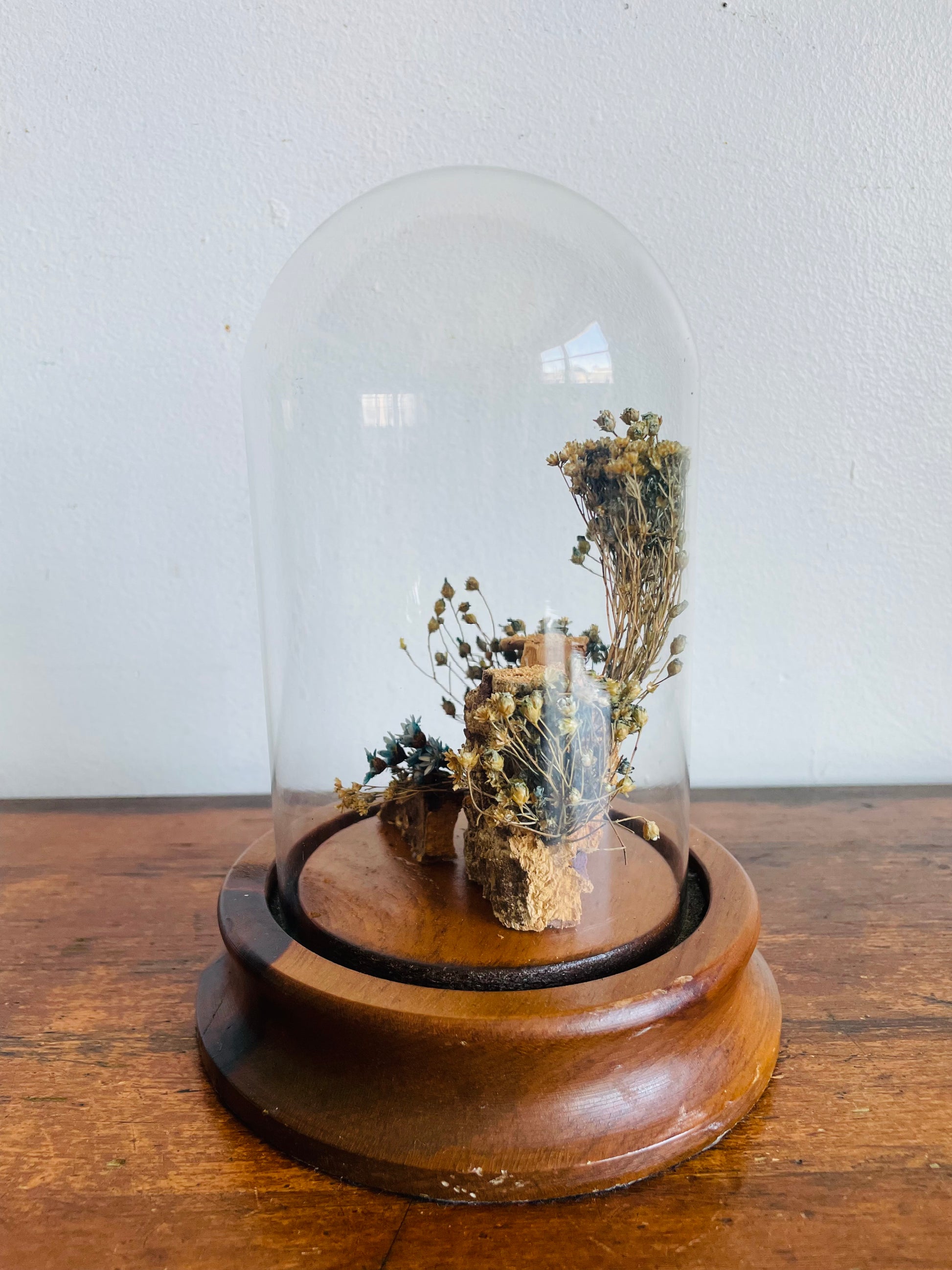 Vintage Glass Terrarium Cloche Dome on Wood Base with Dried Flower Display - Nature Decor