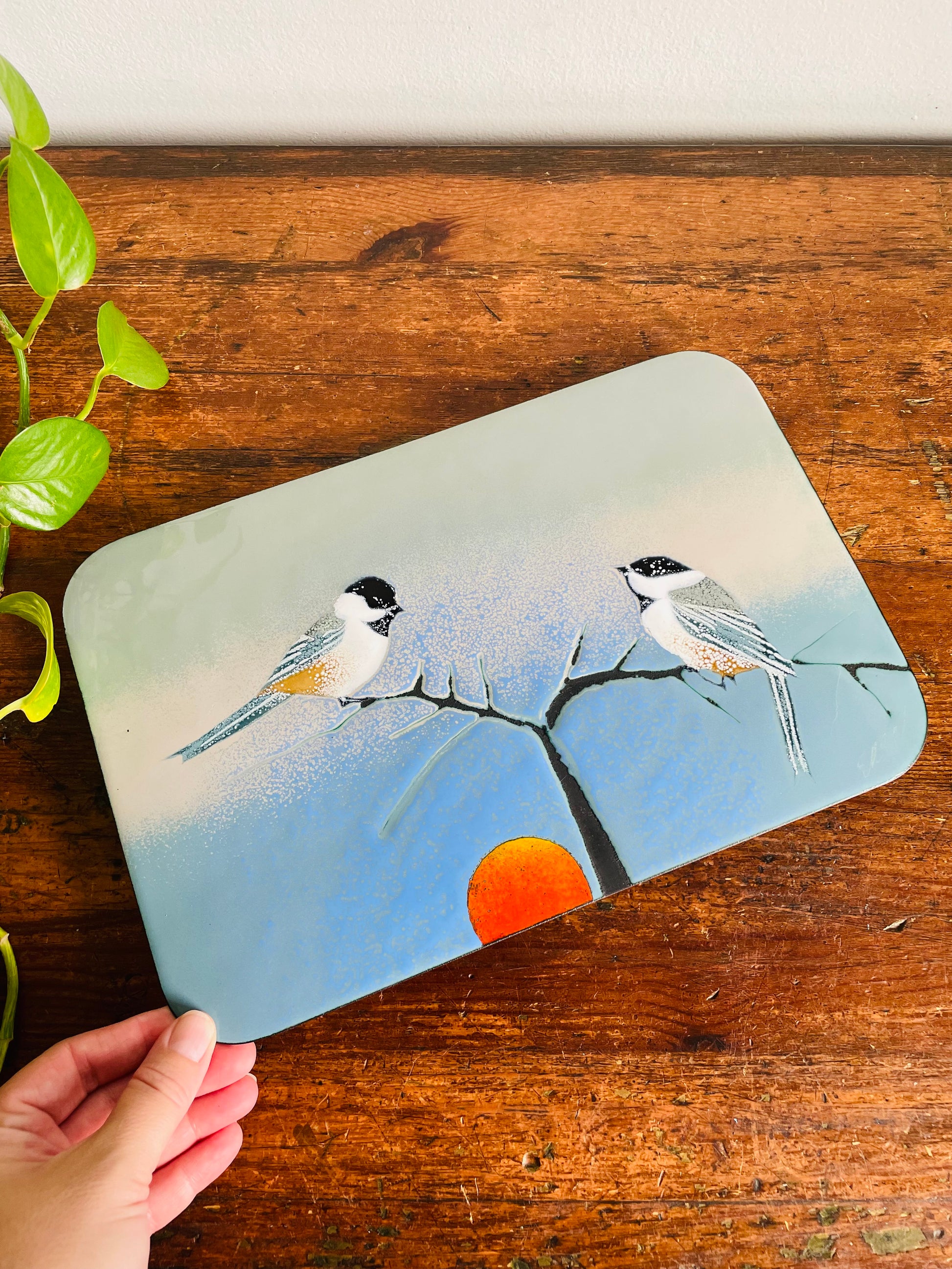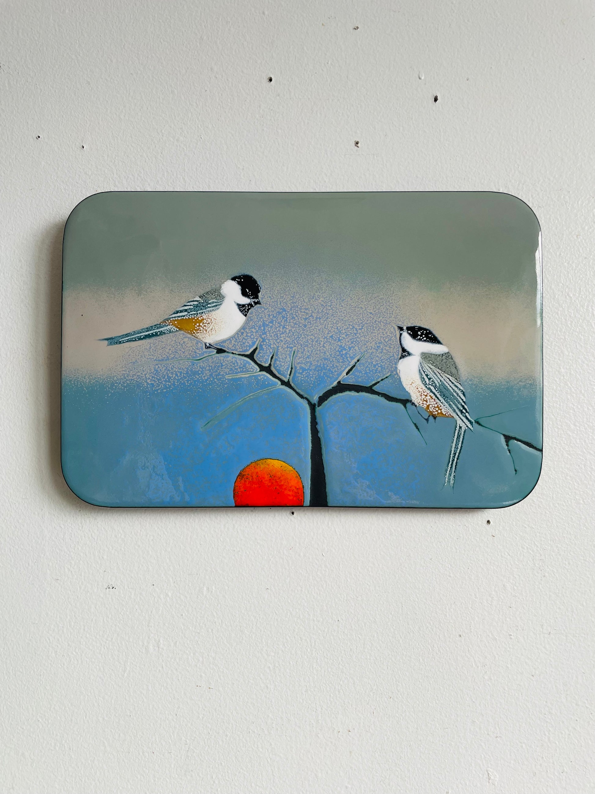 Vintage Hand Enamel on Copper Wall Plaque Picture - Signed by Canadian Artist B. E. Eren - Black-Capped Chickadee Birds on Branch with Sun - Made in Canada