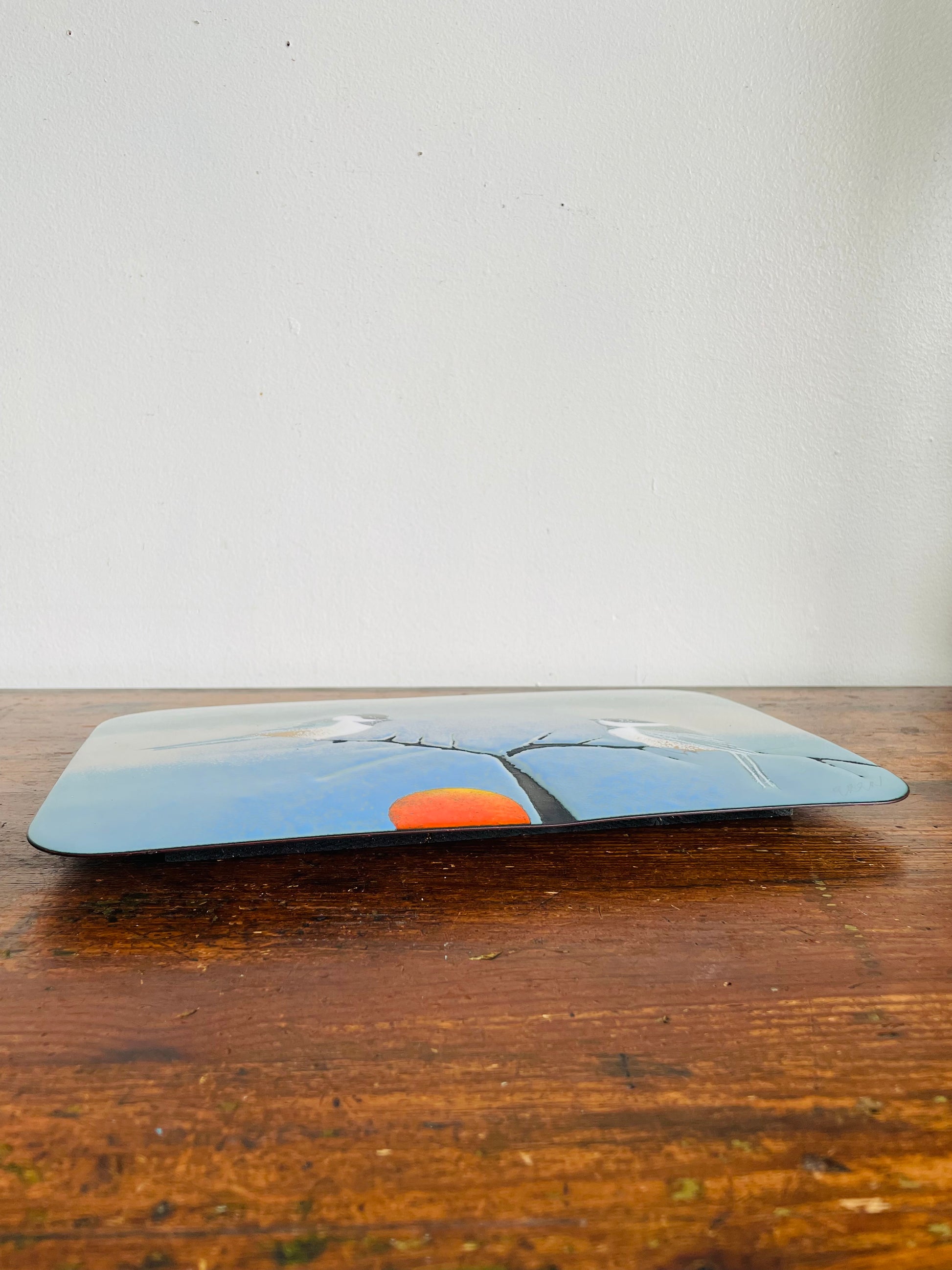 A Canadian artist-made piece which is hand enamelled art on a copper metal plate. The piece is mounted on a wood board and there is a hole on the back for hanging.