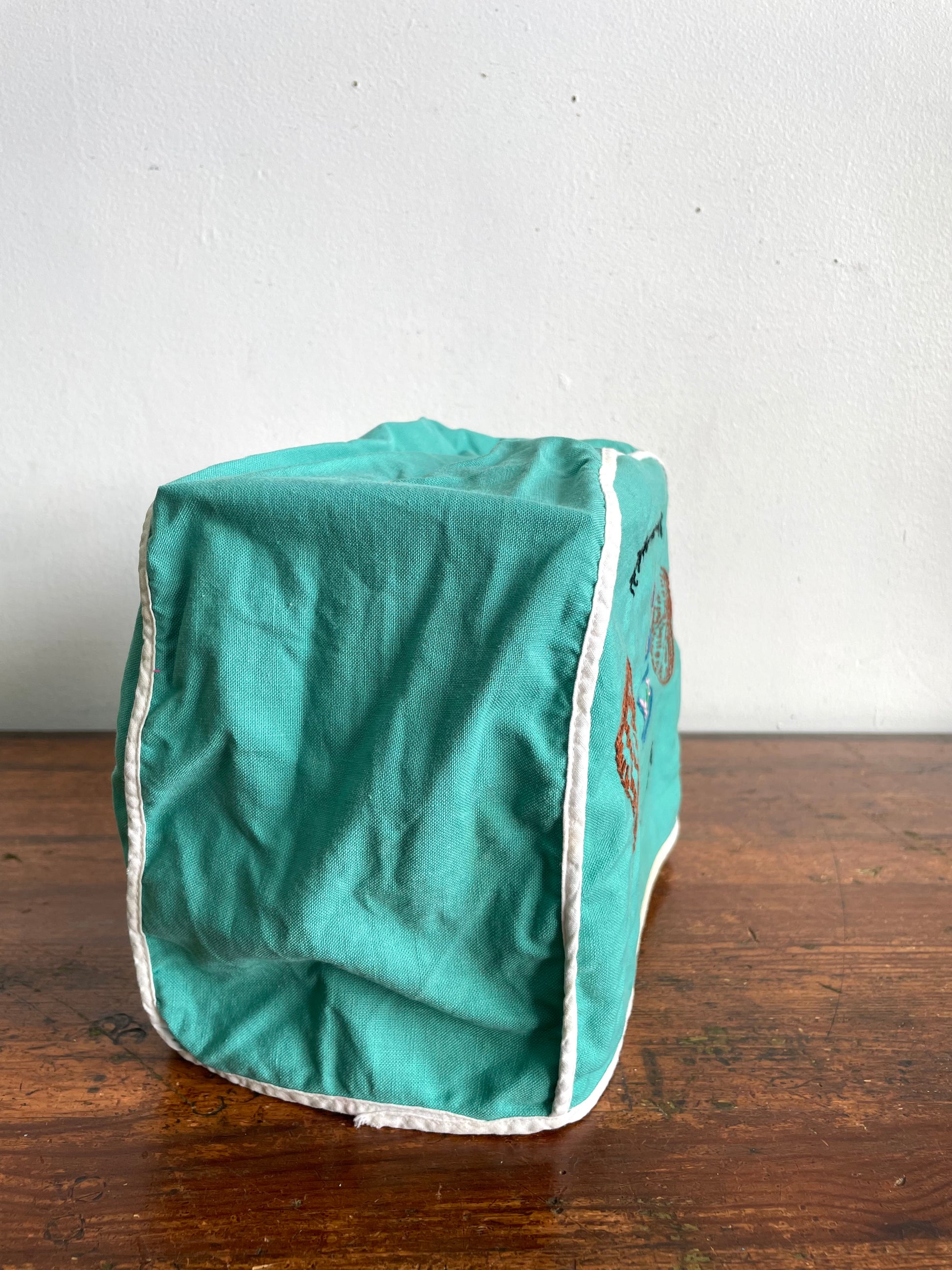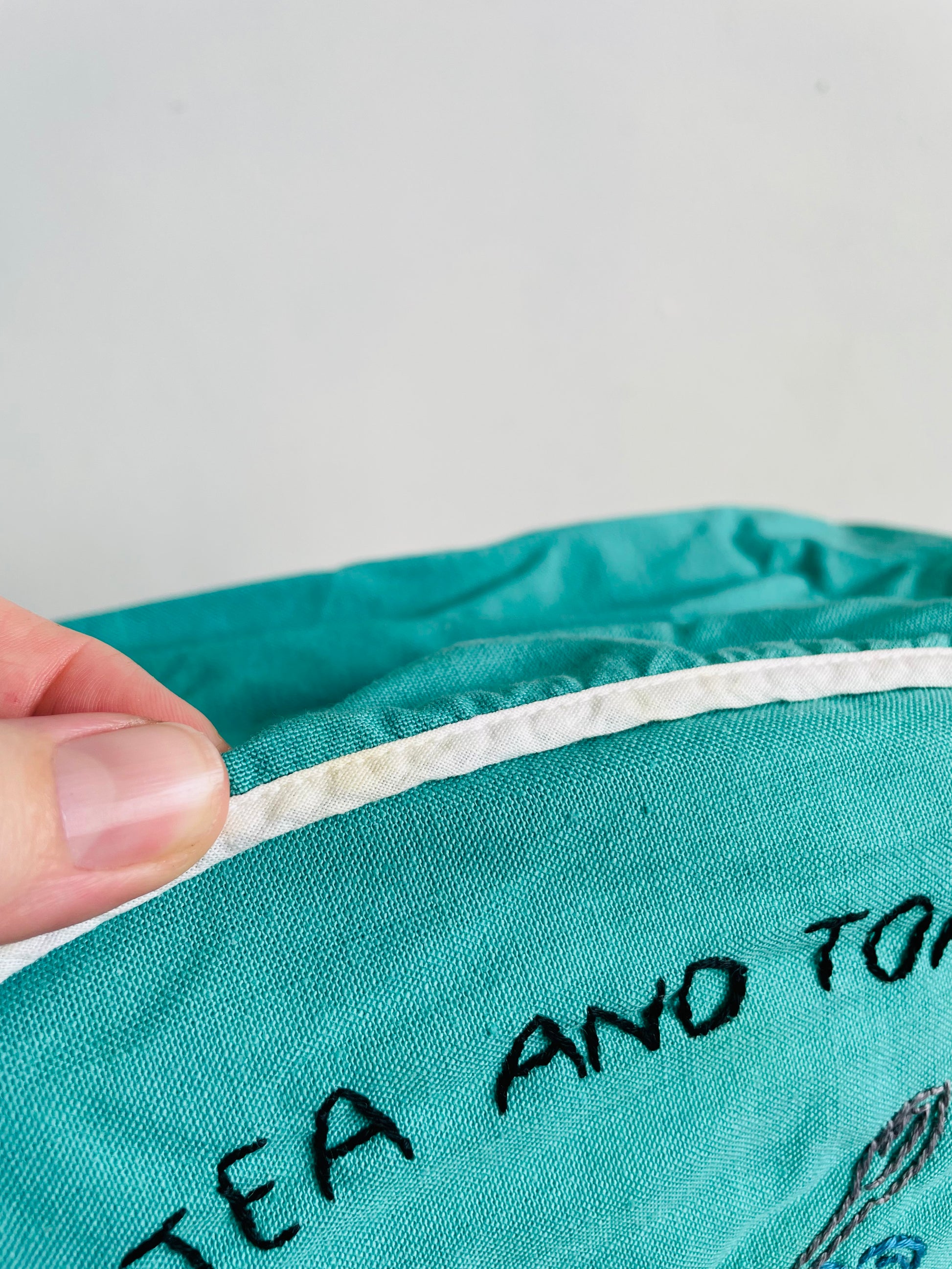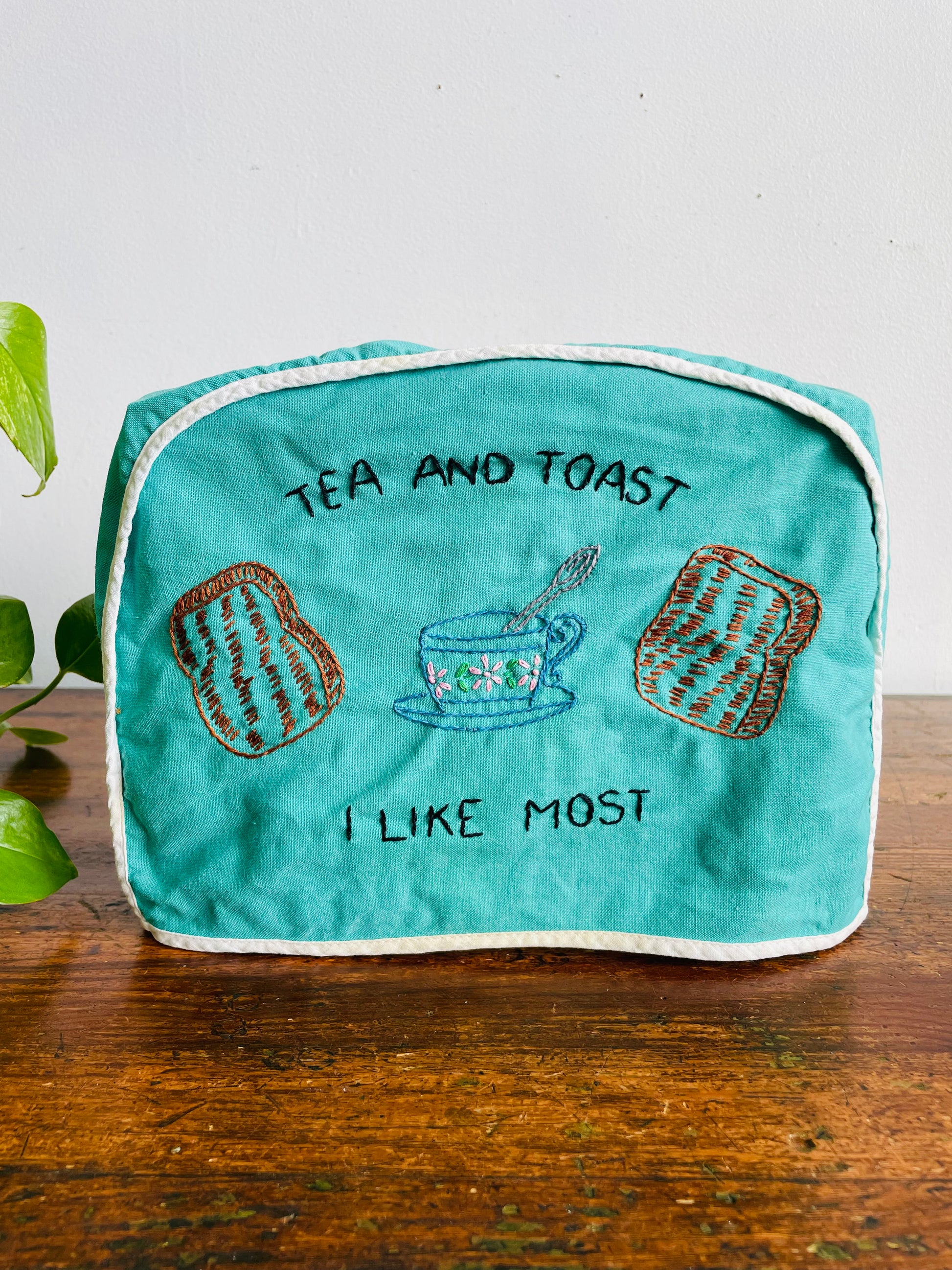 Vintage Handmade Needlepoint Embroidery Teal Green Toaster Cozy Cover with Adorable Graphics - Tea and Toast I Like Most