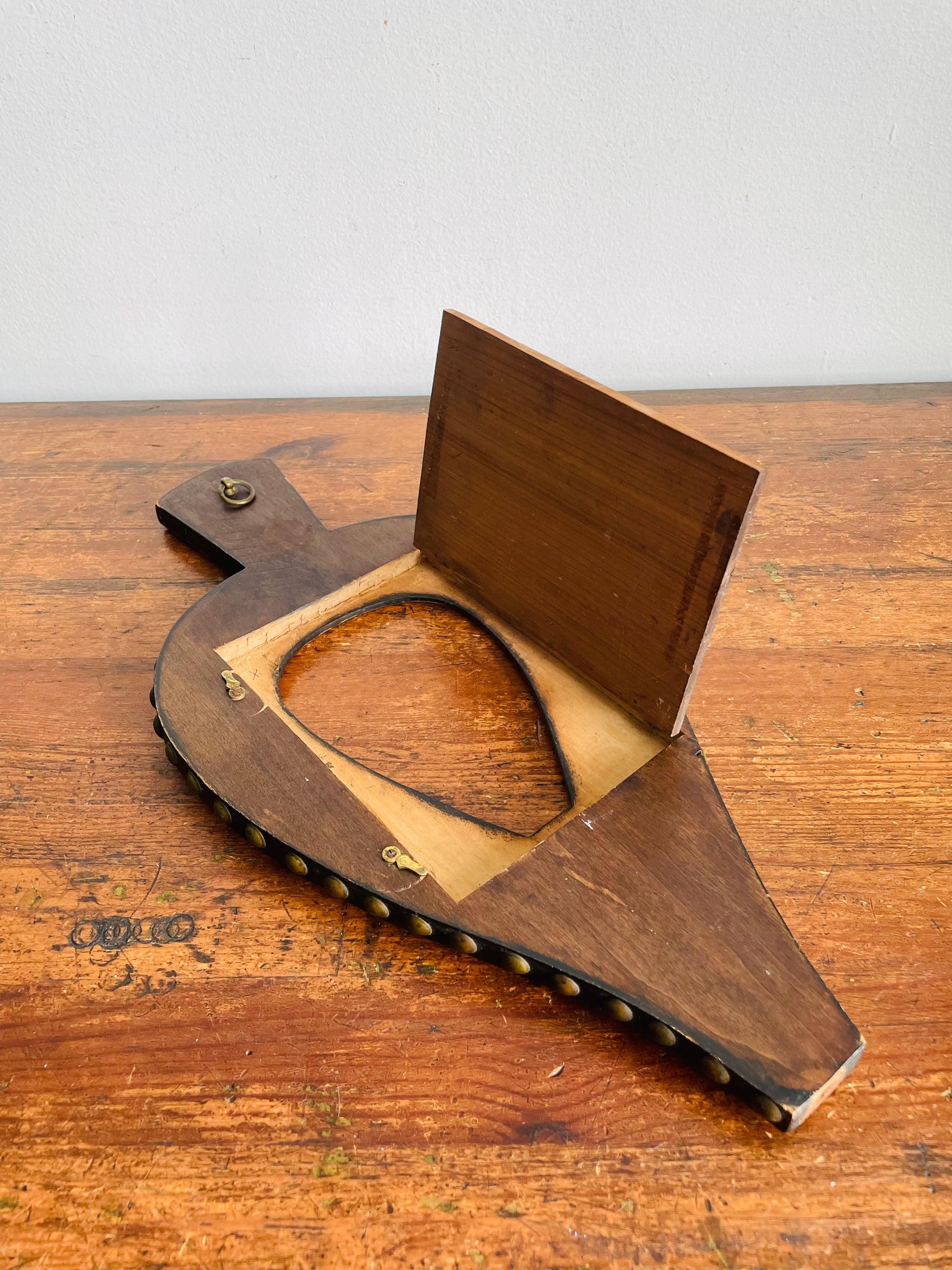 A very unique piece and I think one-of-a-kind. It looks like it was made from a fireplace bellows and repurposed into a picture frame. The door at the back can open and close to insert a picture inside. There is a hook for hanging.