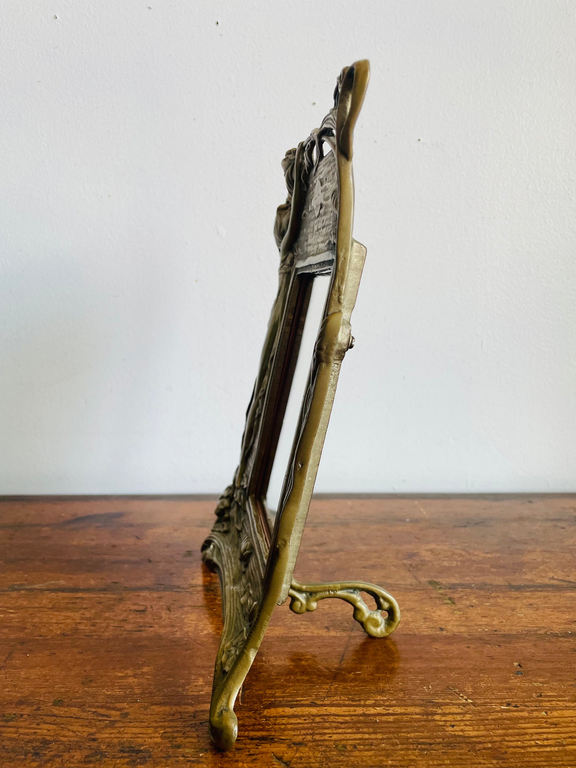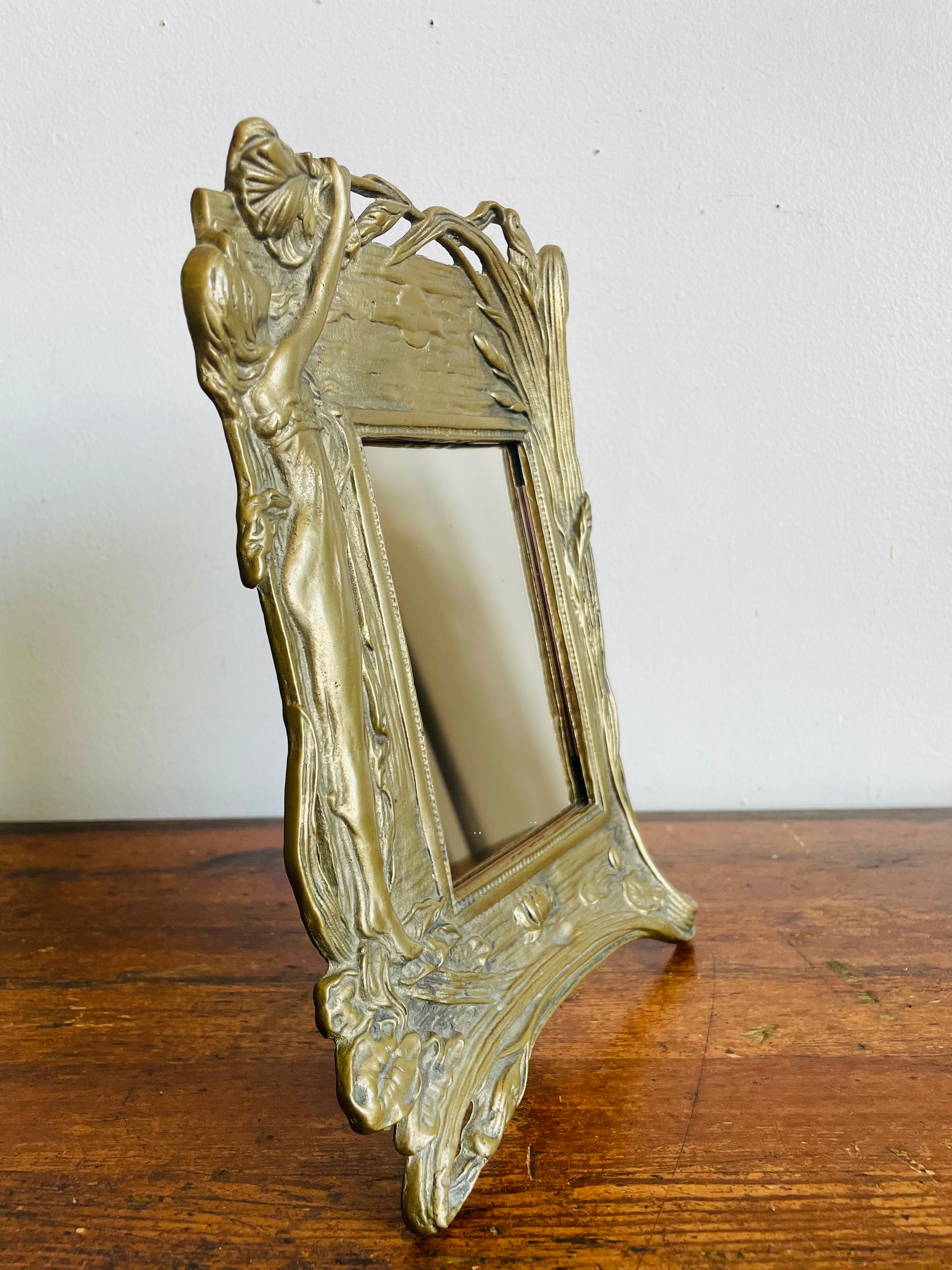 Vintage Heavy Brass Art Nouveau Easel Back Mirror with Fairy Nymph Maiden Under Sun with Flowers - Could Use as a Picture Frame as Well!