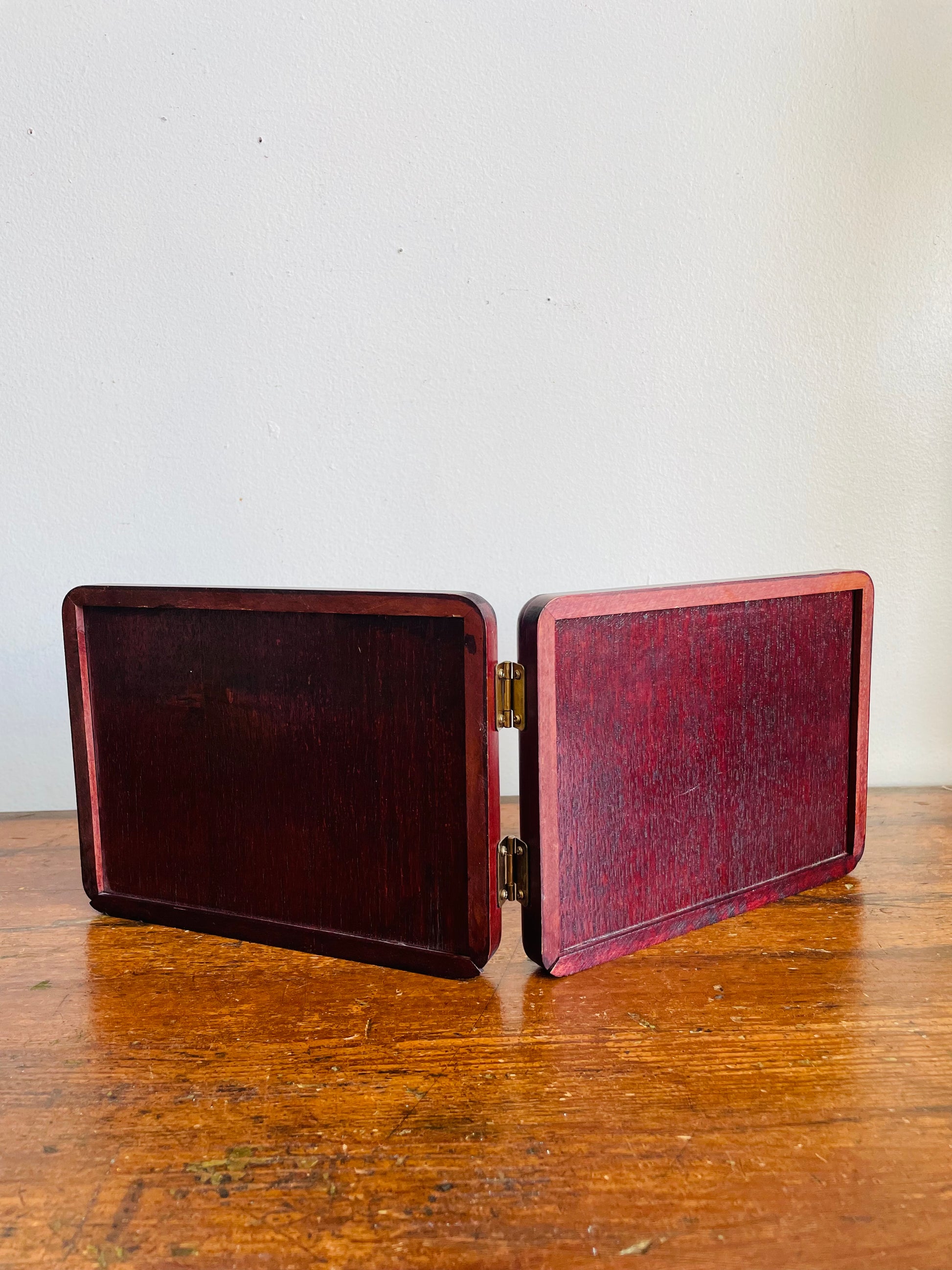 Wood with glass inserts. The wood panels on the back slide down and can be removed to put photos in.